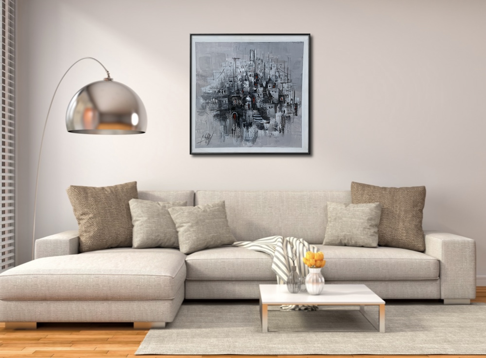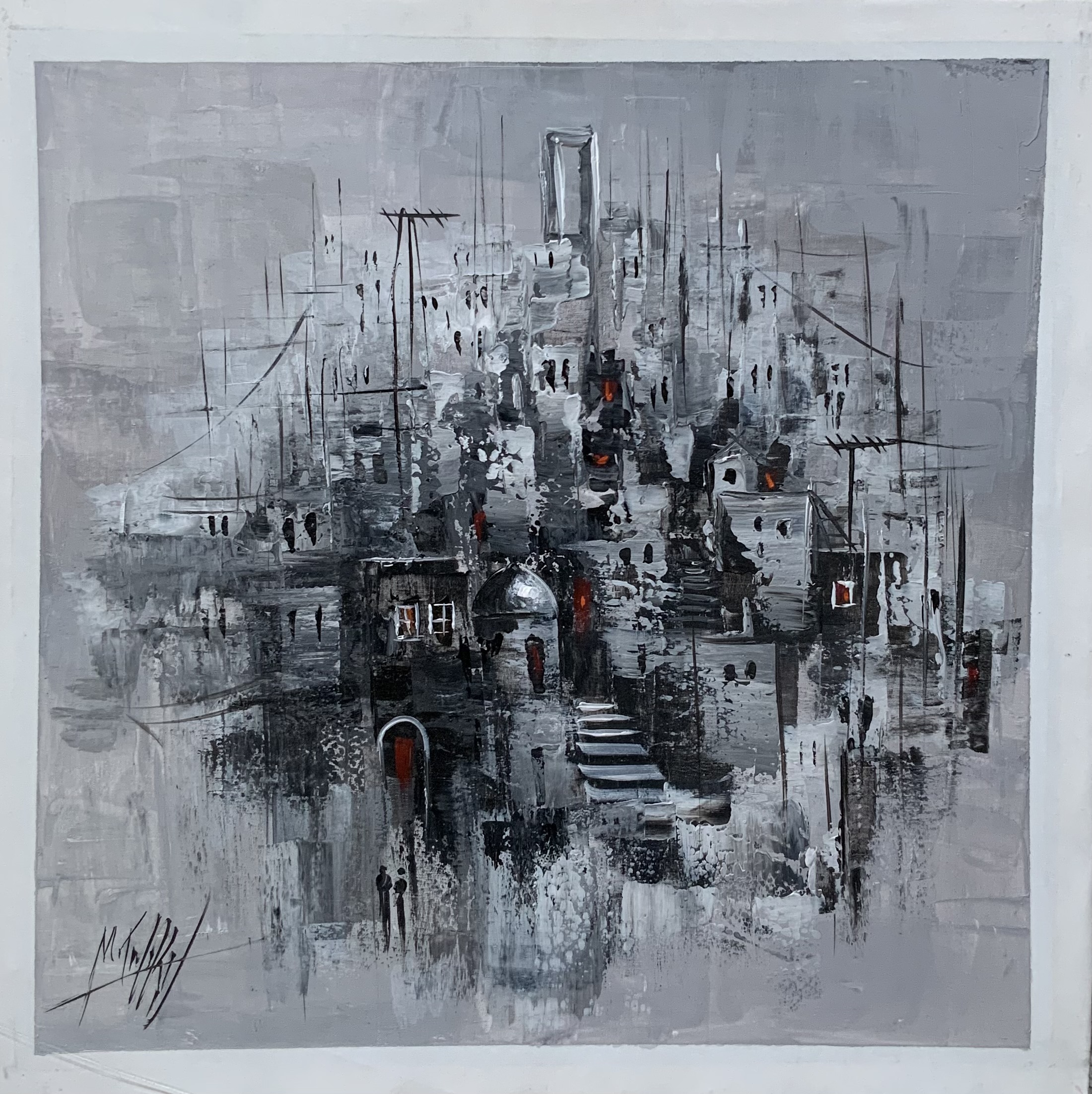 An enchanting abstract painting depicting the outlines of a Jerusalem-like city shrouded in mist and ash, with glowing red doors and windows symbolizing life and memories that never fade. The artwork beautifully balances sorrow and beauty, destruction and enduring hope.