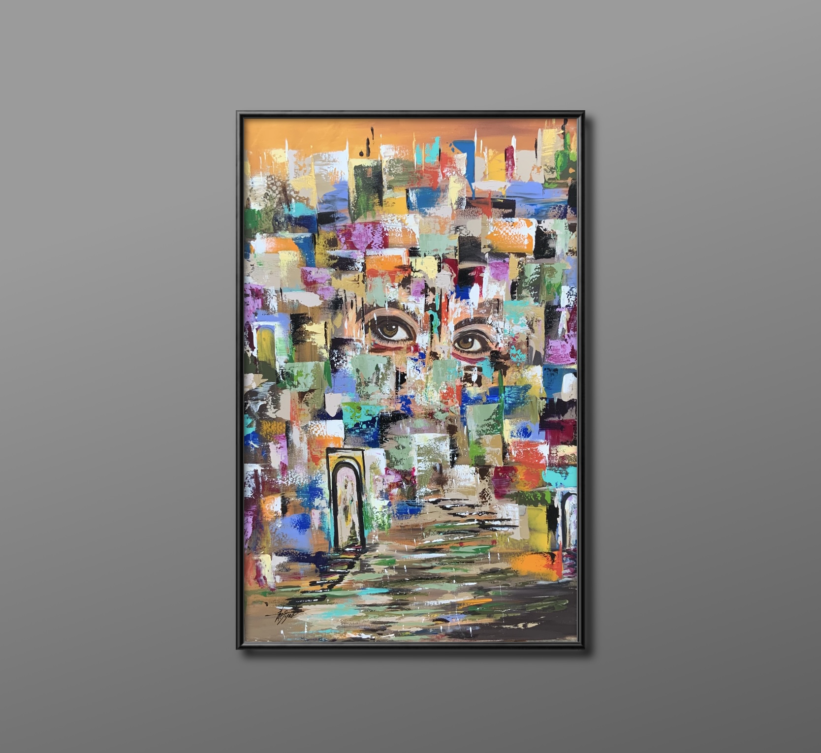 This painting portrays a poetic fusion between the human face and the urban landscape, where facial features dissolve into vibrant layers of color, as if the city itself embodies memory and identity. The eyes, placed at the heart of the composition, observe silently, carrying unspoken stories, while the layered colors reflect the rhythm of life, transformation, and the constant search for self within expressive chaos.