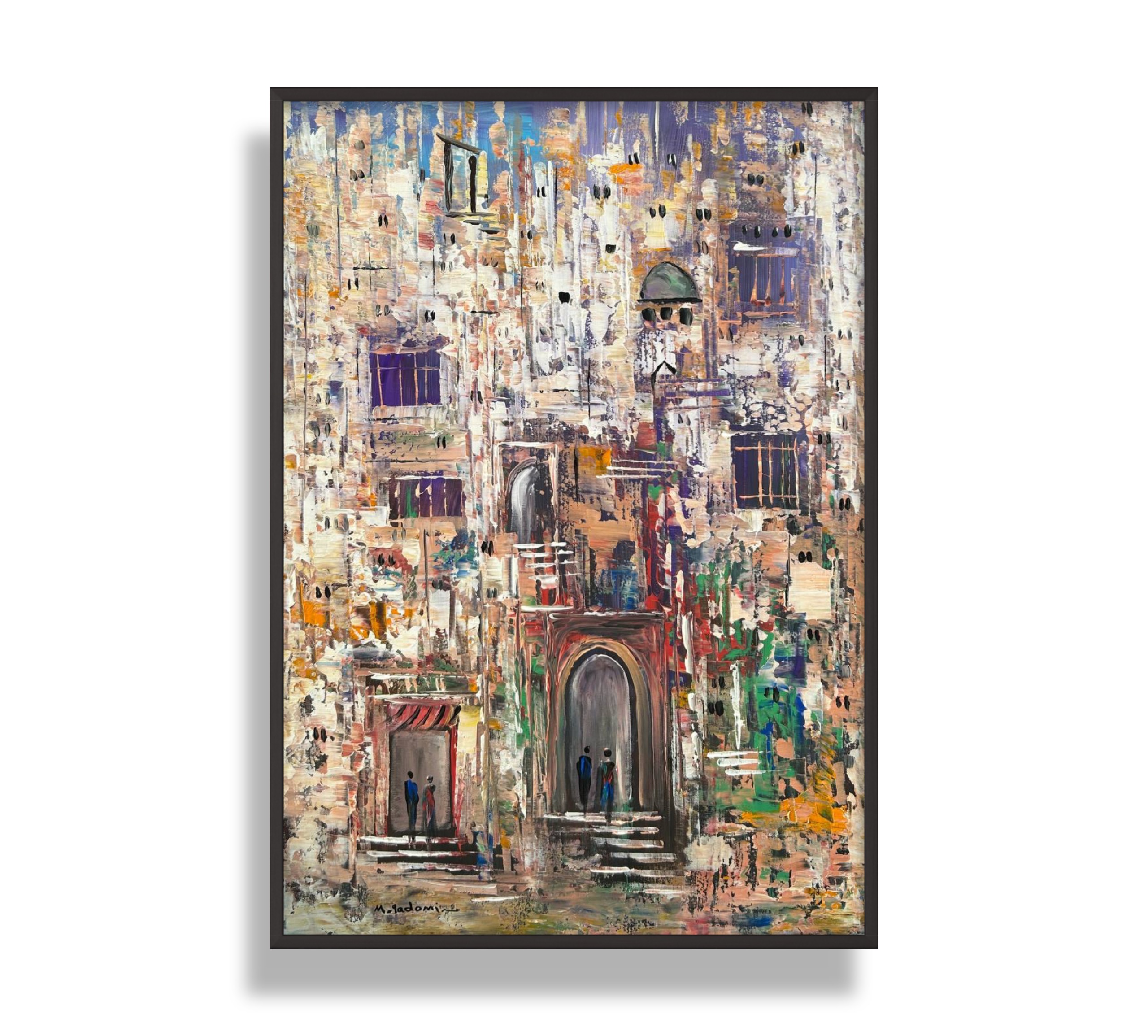 The painting depicts the façades of an old city dissolving into dense layers of color and texture, where doors become thresholds of silence and anticipation. Subtle human figures add a contemplative dimension, as if the city softly whispers its stories to those who linger.