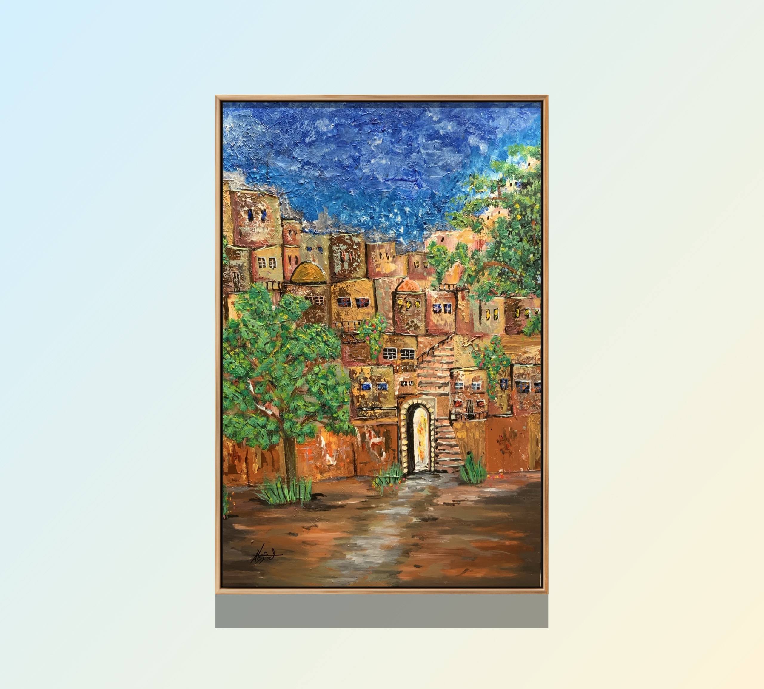 This painting portrays a lively scene from the heart of an old neighborhood, where earthy-toned houses blend harmoniously with surrounding greenery, reflecting the warmth of everyday life. A glowing doorway and ascending stairs lead the eye into deeper layers, as if inviting the viewer to uncover hidden stories behind the walls. The richly textured blue sky adds a dramatic depth that enhances the scene’s beauty.