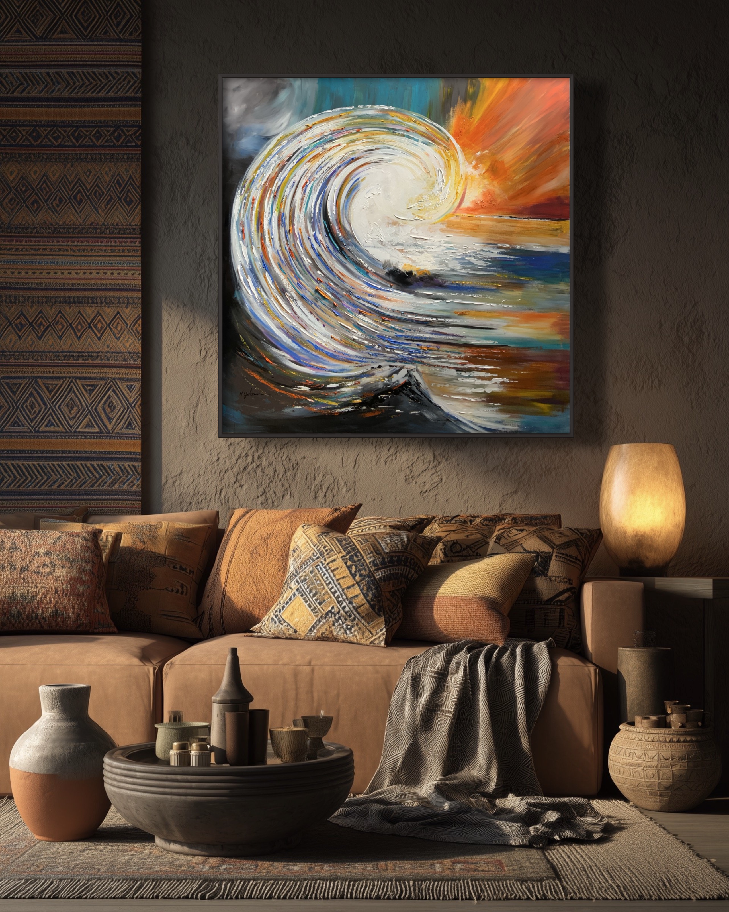 A vibrant abstract painting capturing the moment where power meets calm, as a dynamic wave curls beneath an explosion of warm light. The interplay between cool blues and fiery oranges creates a sense of continuous motion and transformation, as if nature is telling a story of both struggle and triumph.