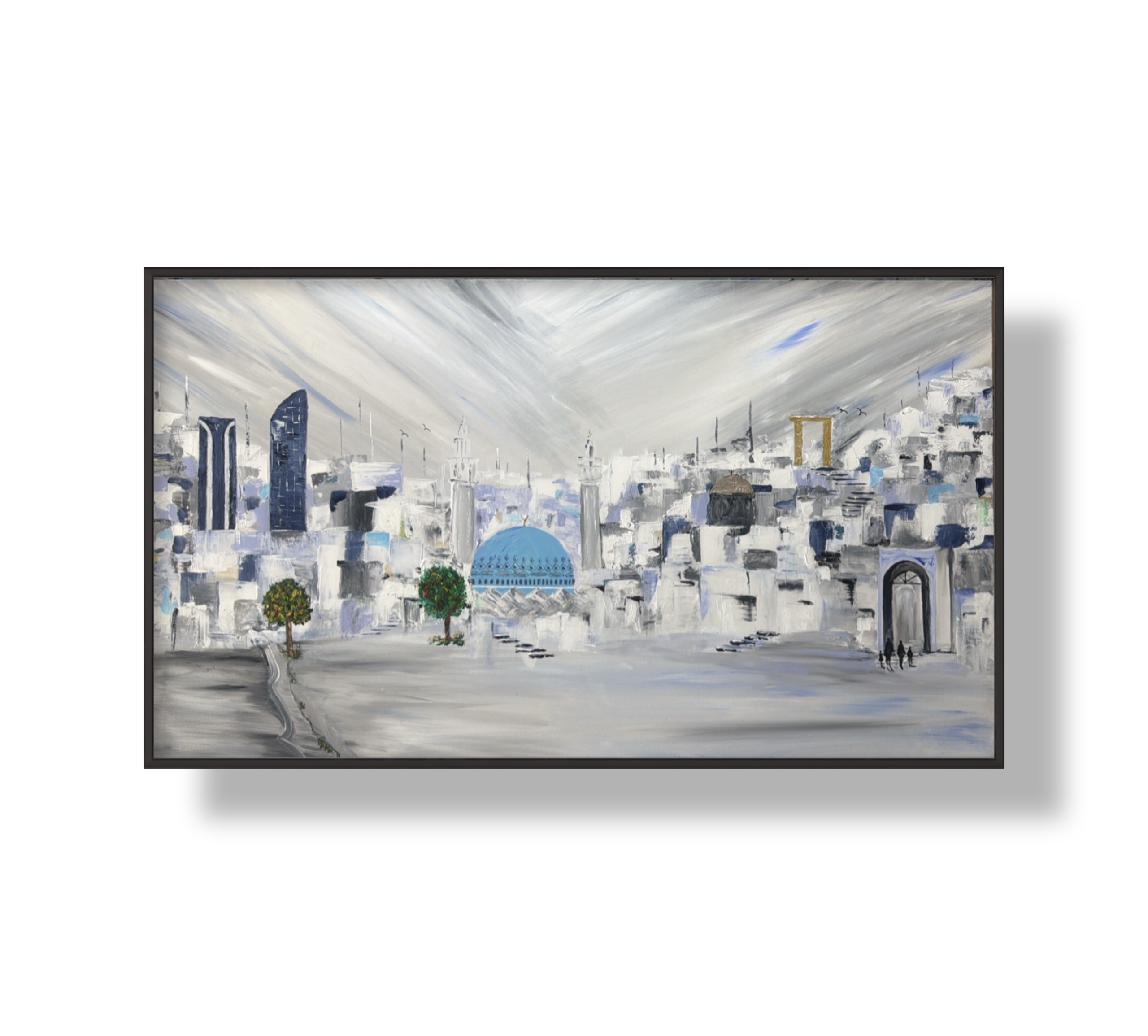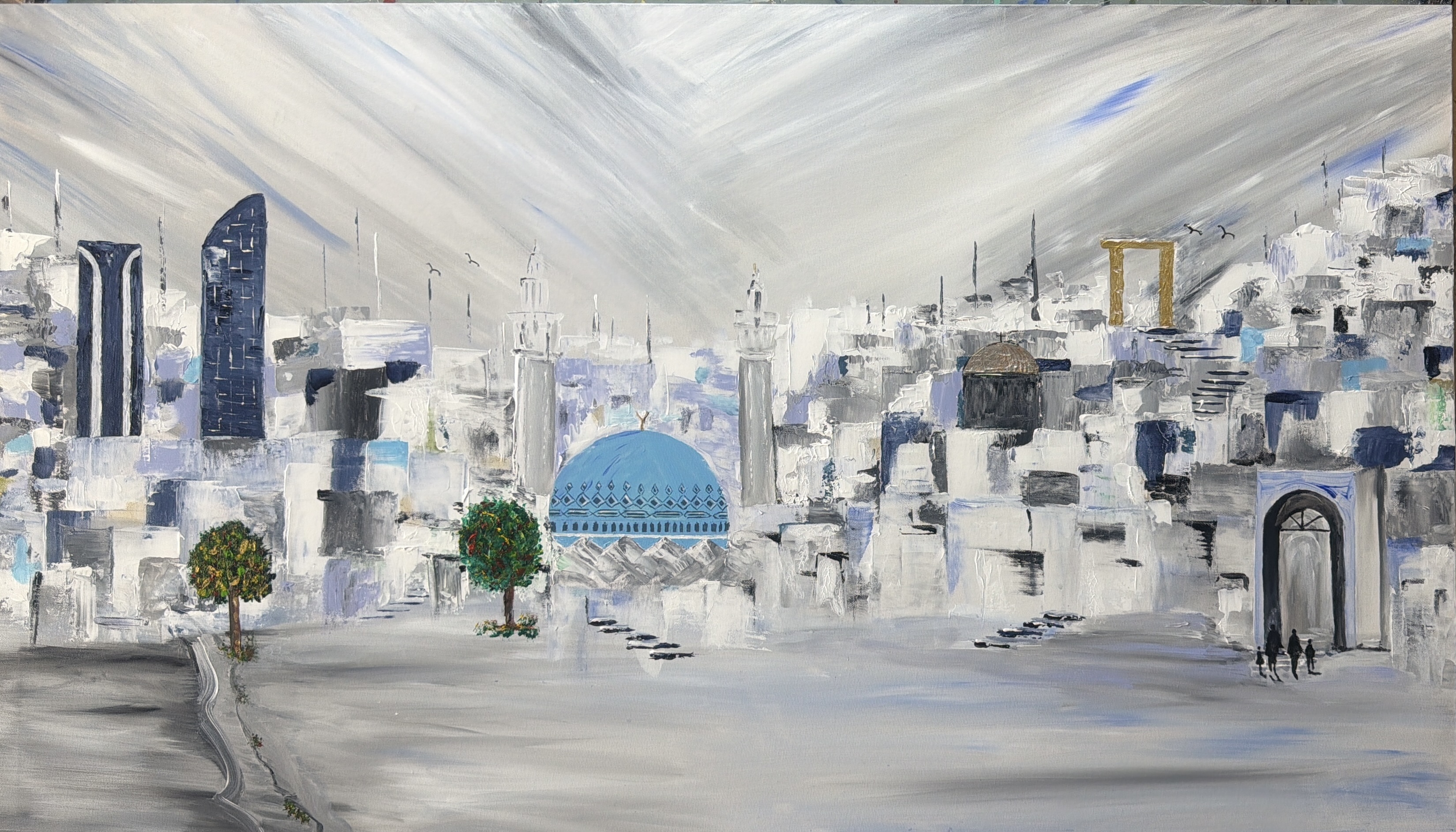 This painting captures a serene, dreamlike cityscape where tradition and modernity quietly coexist. Soft, layered whites and cool blues form a textured urban rhythm, while the central turquoise dome anchors the composition with cultural depth and calm presence. Light seems to cascade from the sky, washing over the buildings and creating a sense of stillness and contemplation. Subtle human figures and pathways invite the viewer into a journey—one that feels both personal and timeless.