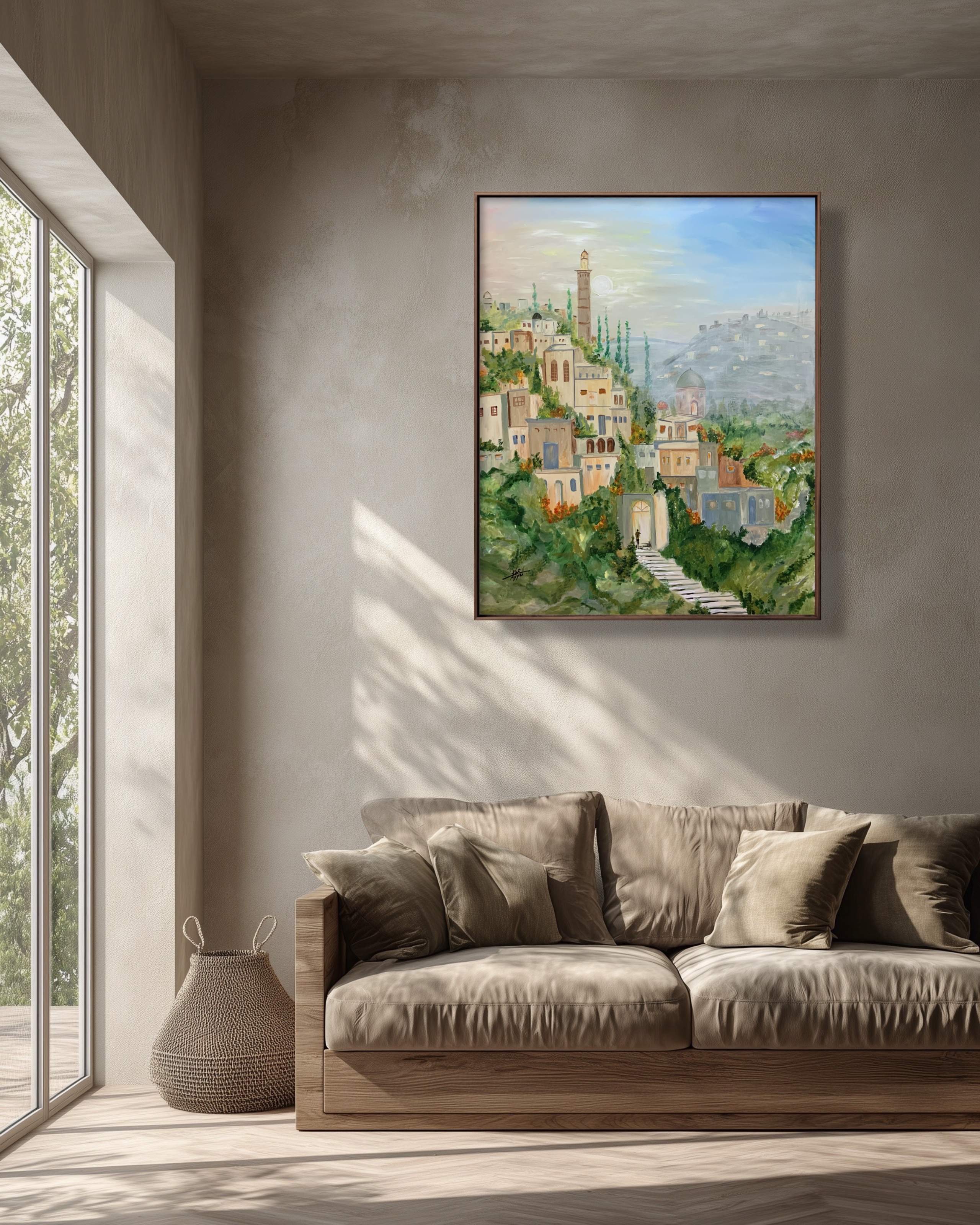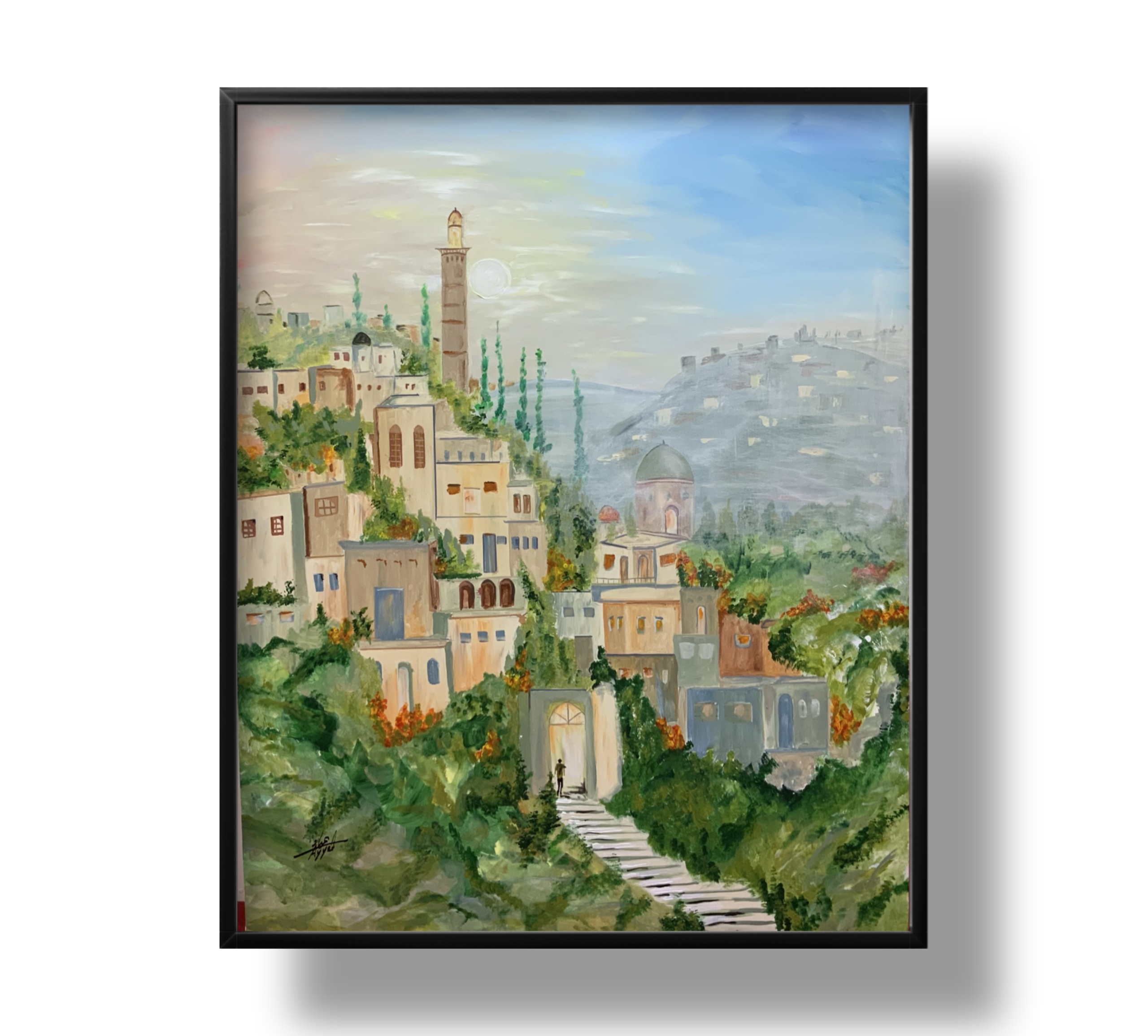 This painting portrays a tranquil city cascading over hills, where traditional architecture blends harmoniously with lush greenery. The minaret and dome add a spiritual dimension, while the stone pathway gently guides the viewer’s eye into the heart of the city, evoking a timeless journey through memory and place.