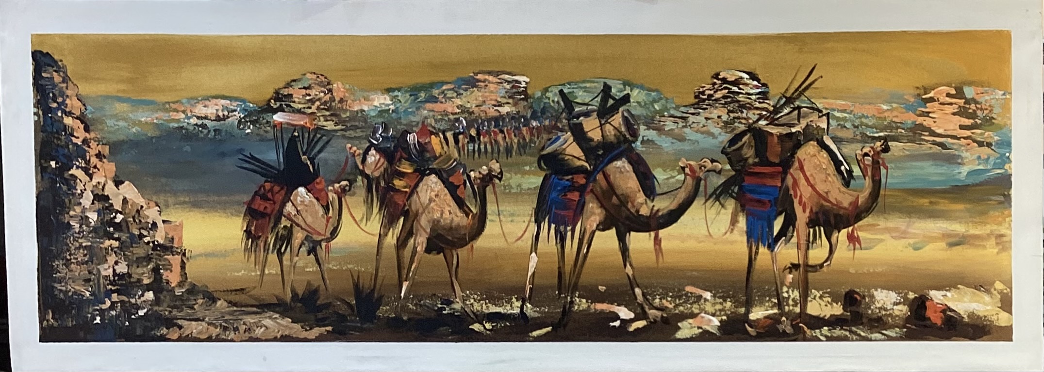 - Expressive details of the camels and their loads, highlighting movement and vitality.