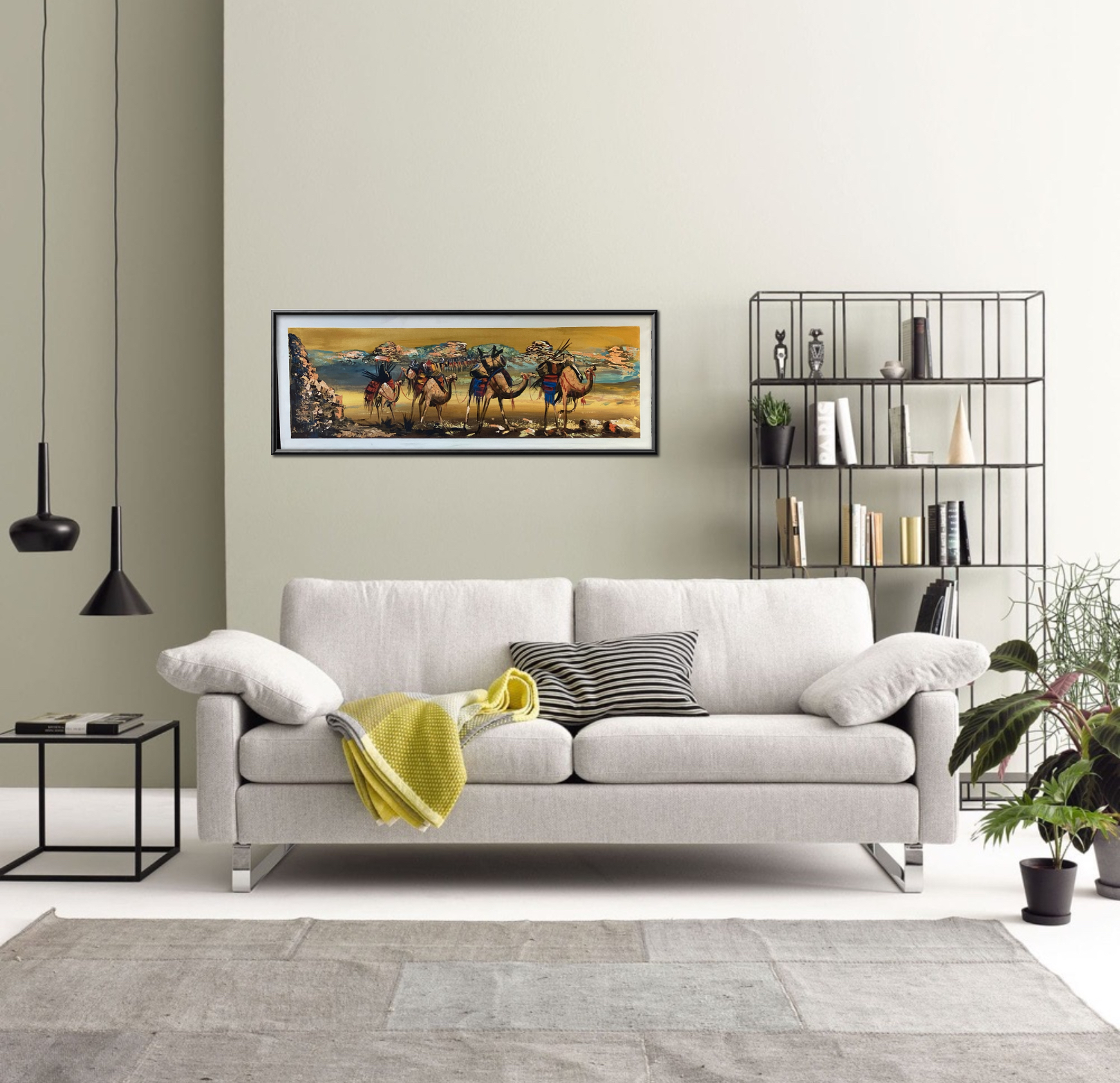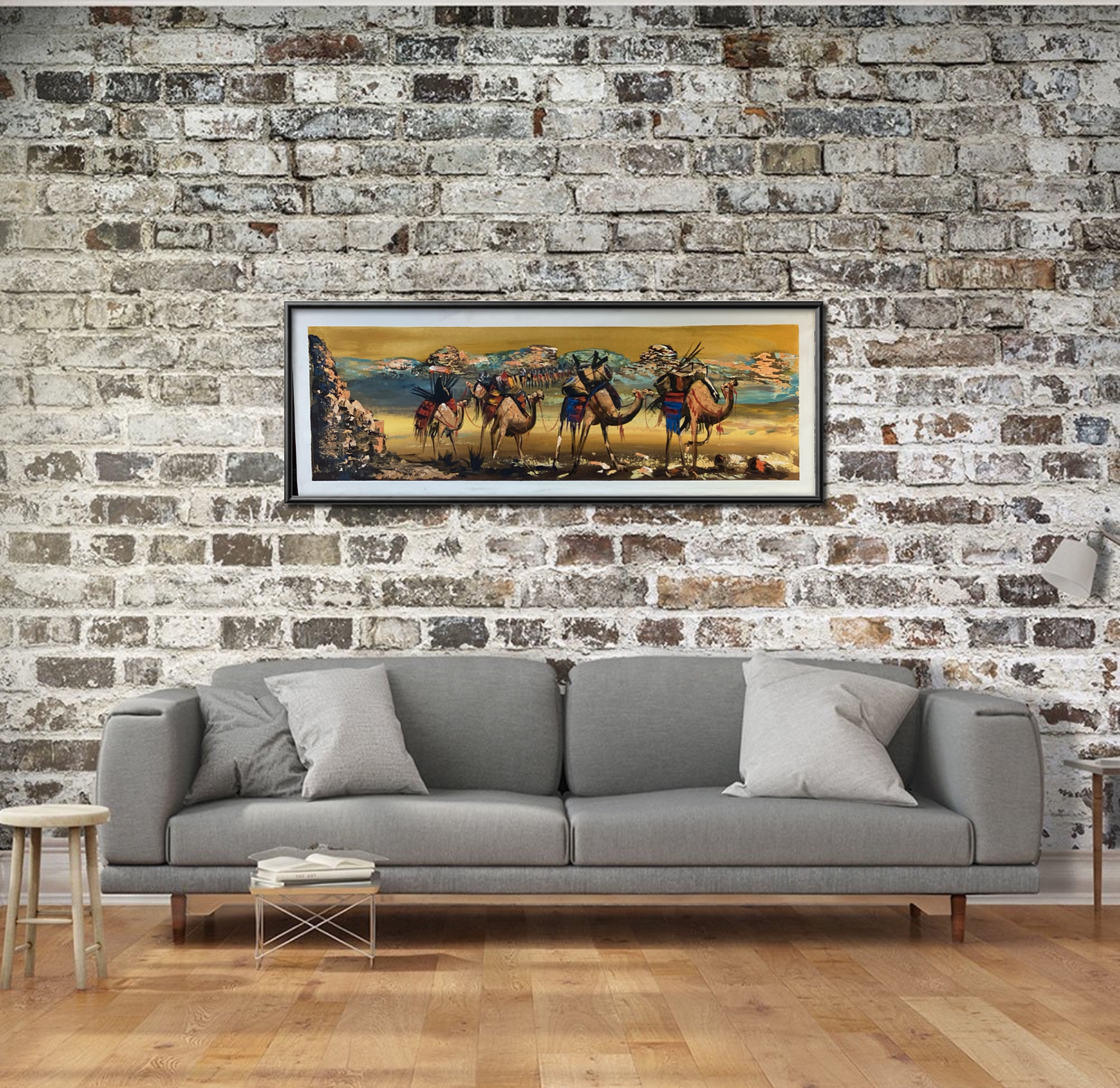 The painting portrays a vivid desert scene where a caravan of camels, laden with goods and provisions, journeys across golden sands stretching toward the horizon. Warm hues of yellow and brown blend harmoniously with touches of blue and red, creating a captivating visual balance. The artist conveys a deep sense of travel and heritage, intertwining the harsh beauty of nature with the timeless spirit of nomadic life.