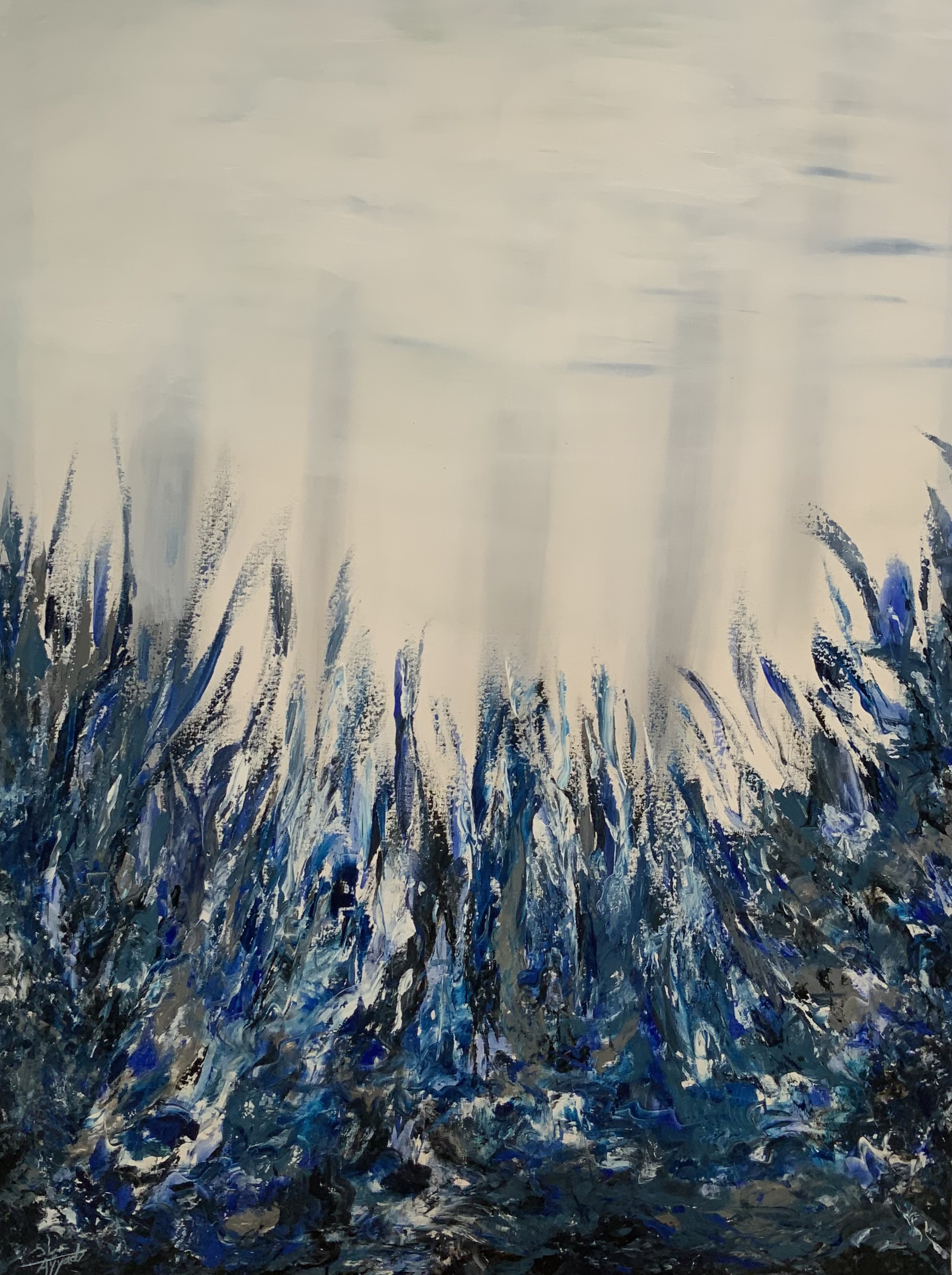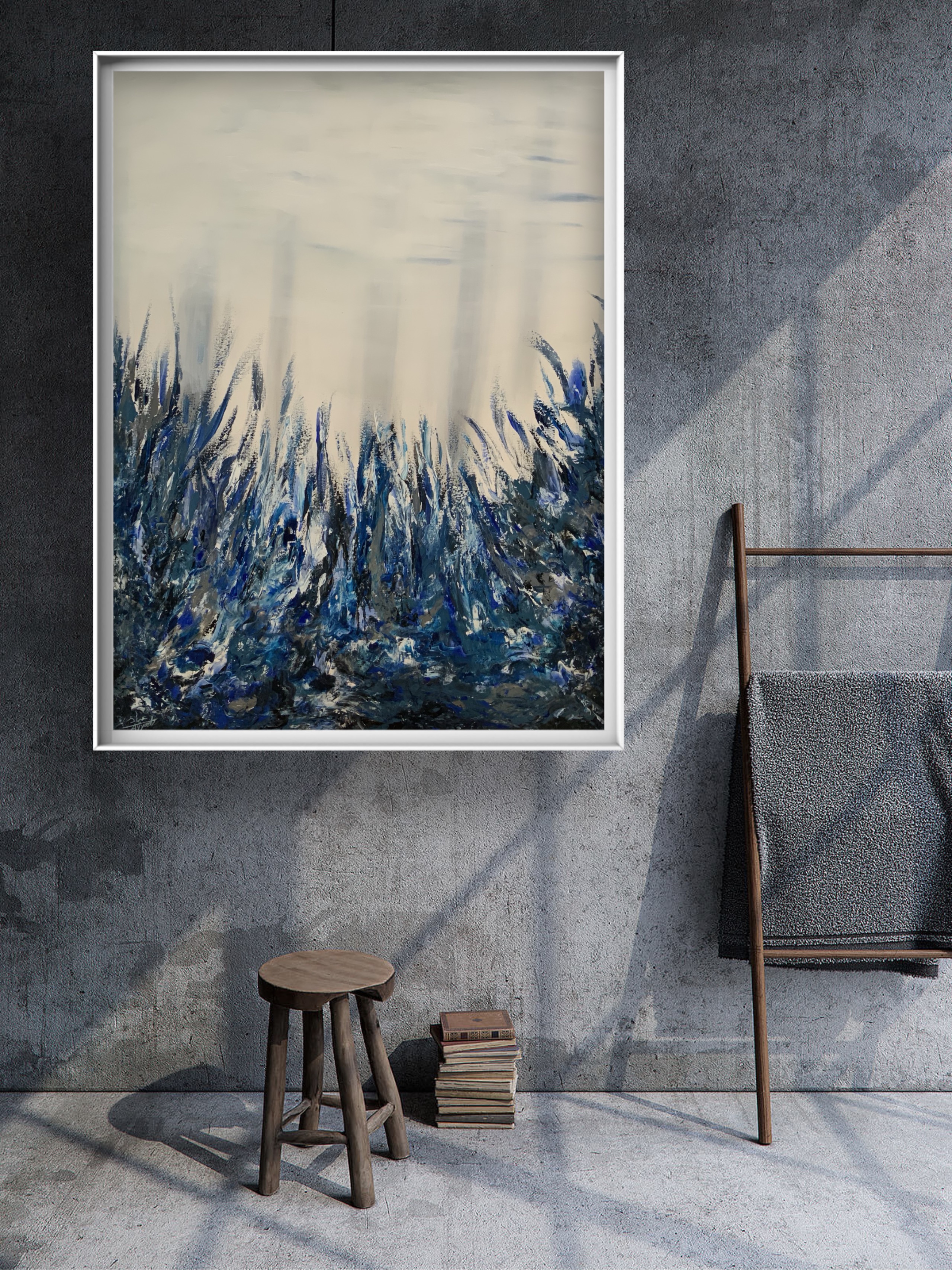 An abstract painting that evokes a deep sense of nature through layered colors and flowing brushwork. The lower section pulses with movement—blue, black, and white strokes resembling swaying grass or foliage. As the energy fades upward, a serene expanse of pale blue and white emerges, like light filtering gently through mist. The contrast between density and softness gives the piece a meditative, enchanting quality.
