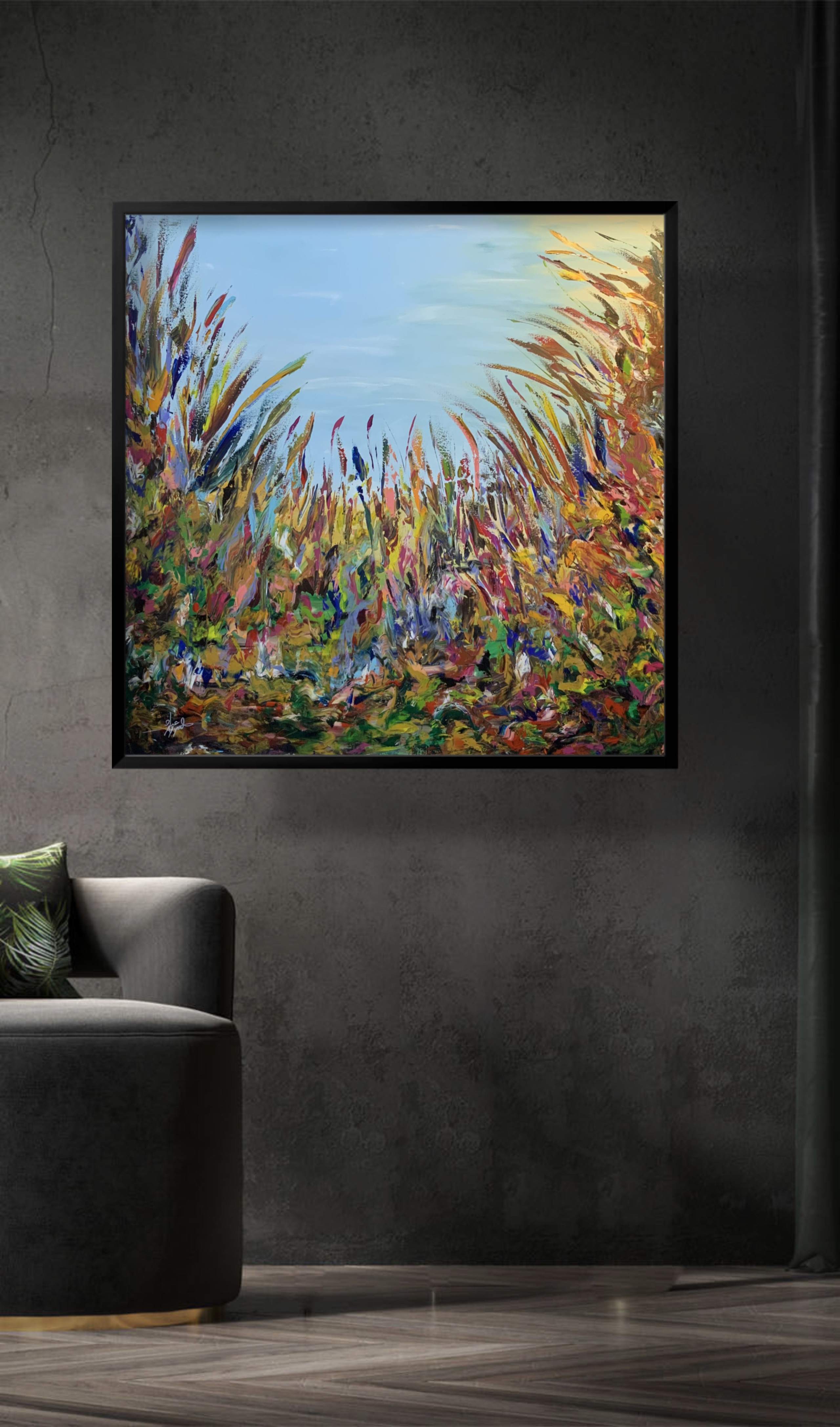 This painting captures a vibrant natural scene where tall, colorful grasses sway gently beneath a clear and glowing sky. Expressive brushstrokes and warm–cool color transitions create a sense of movement and a soft breeze passing through the landscape. The artwork celebrates nature’s energy and ever-renewing beauty.