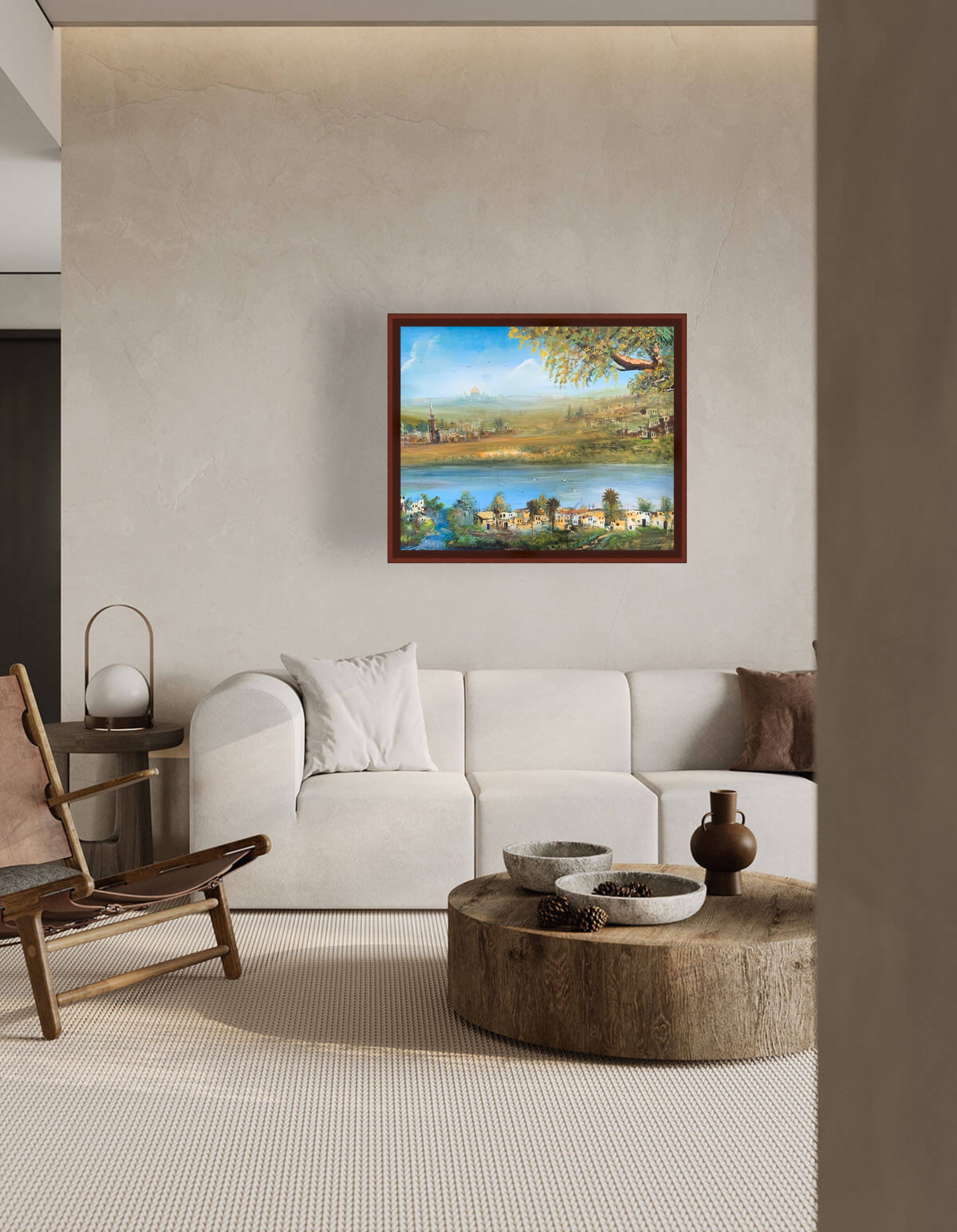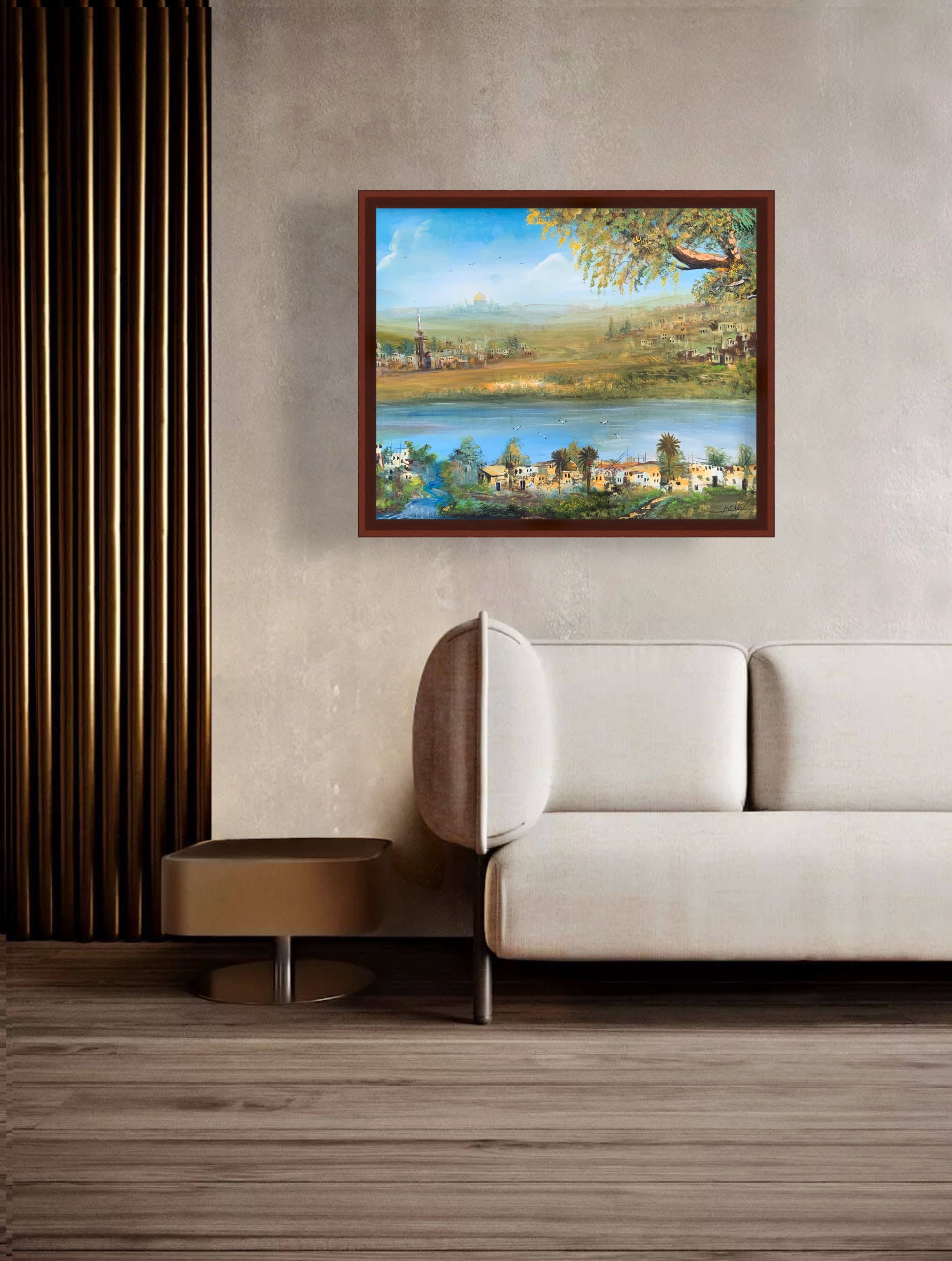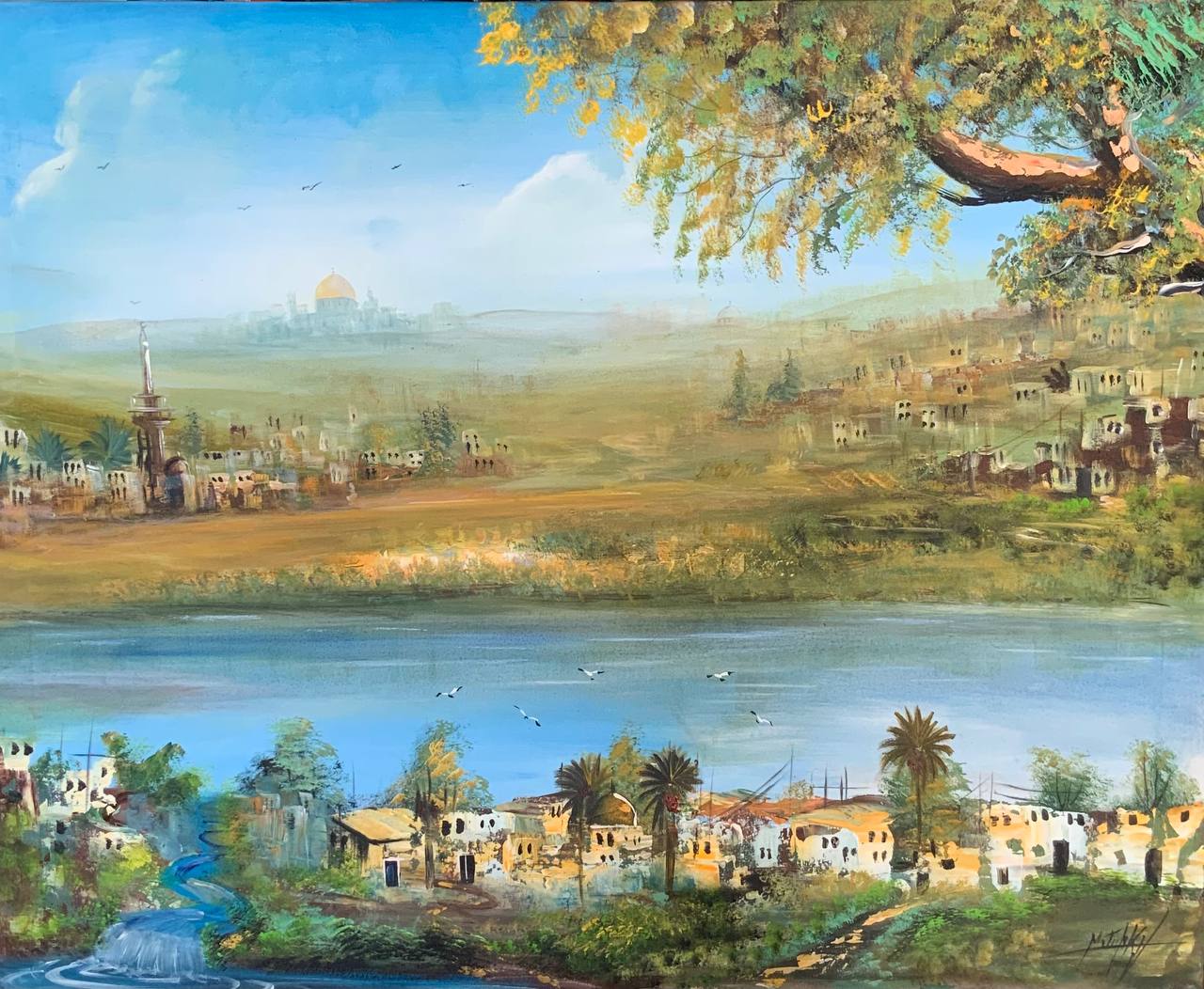 3. Contrast of Natural and Architectural Elements: The painting balances the splendour of nature (the river, palms, the leafy tree) with the depth of civilization and history (traditional houses and the historic/religious landmark on the horizon). This adds a narrative dimension to the work, making it a piece rich in visual and emotional content.