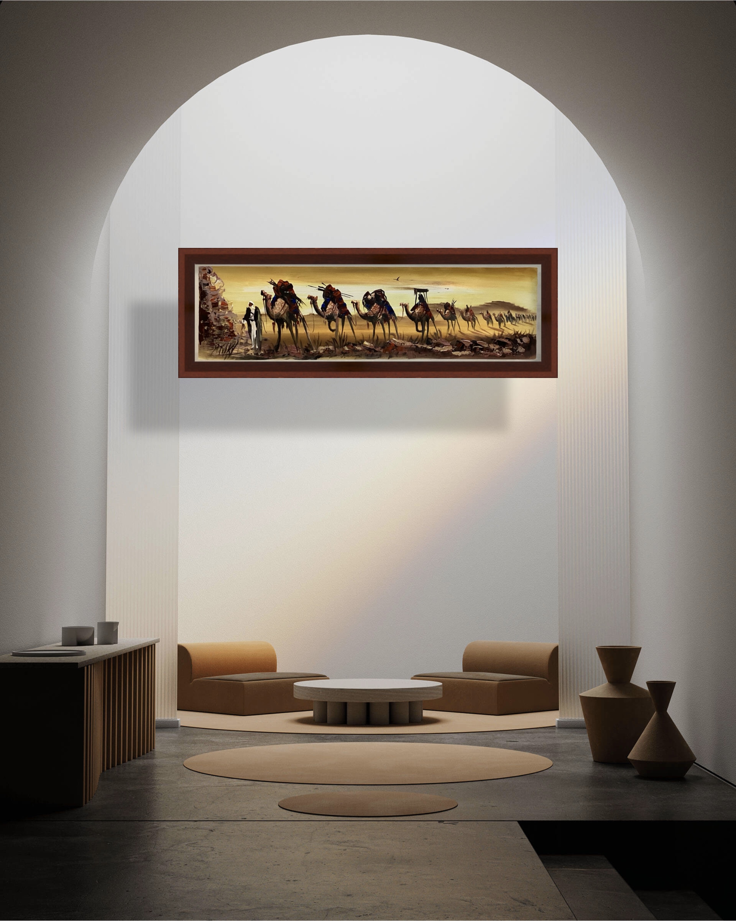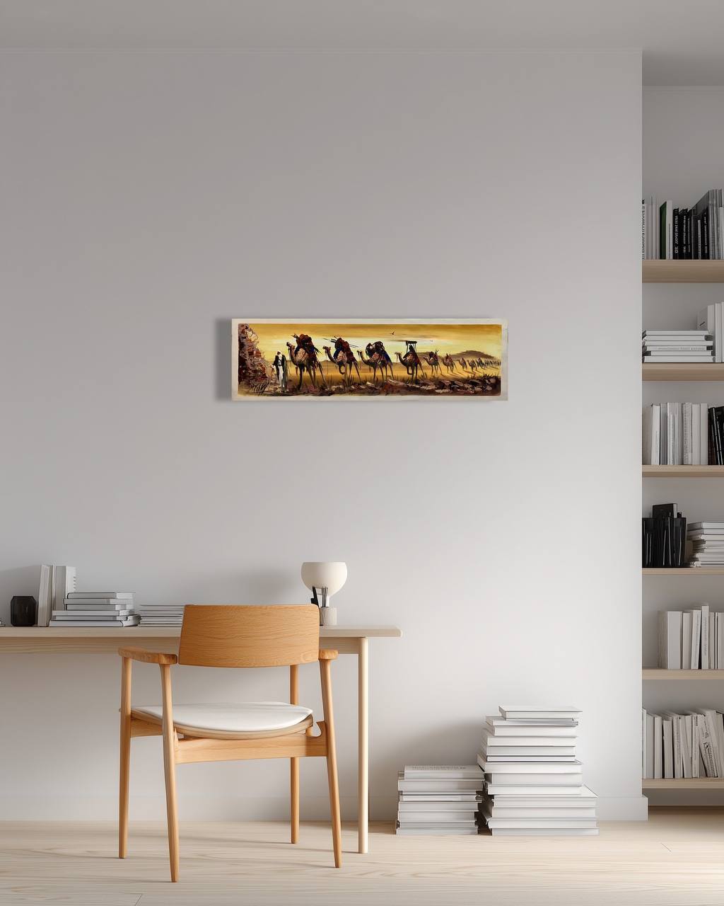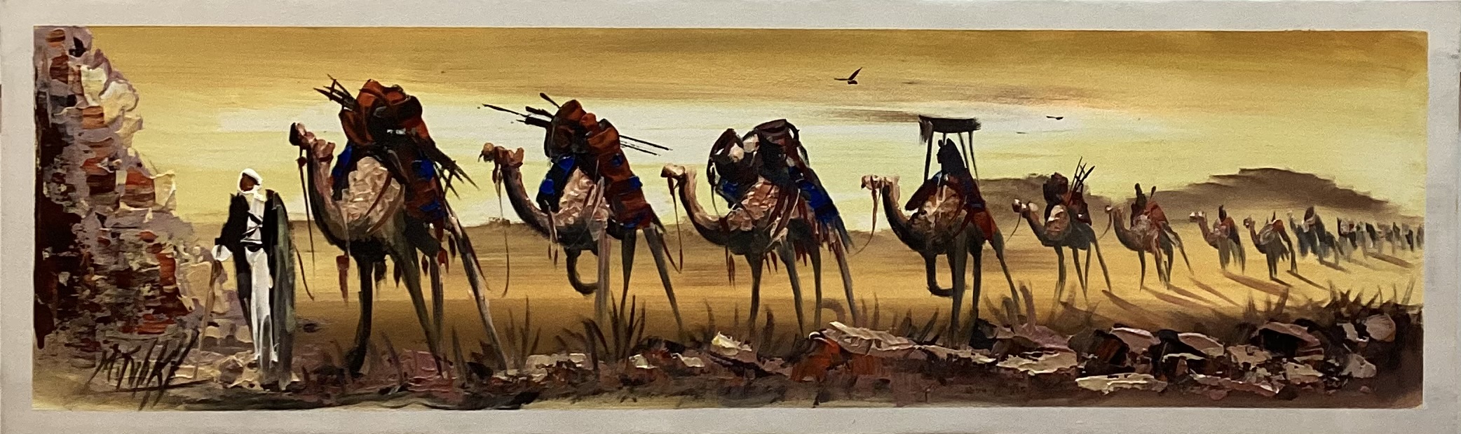 2. Perspective and Visual Depth: The artwork highlights the desert's vastness by gradually decreasing the size of the camels toward the horizon, creating the illusion of a very long caravan heading into the distance.