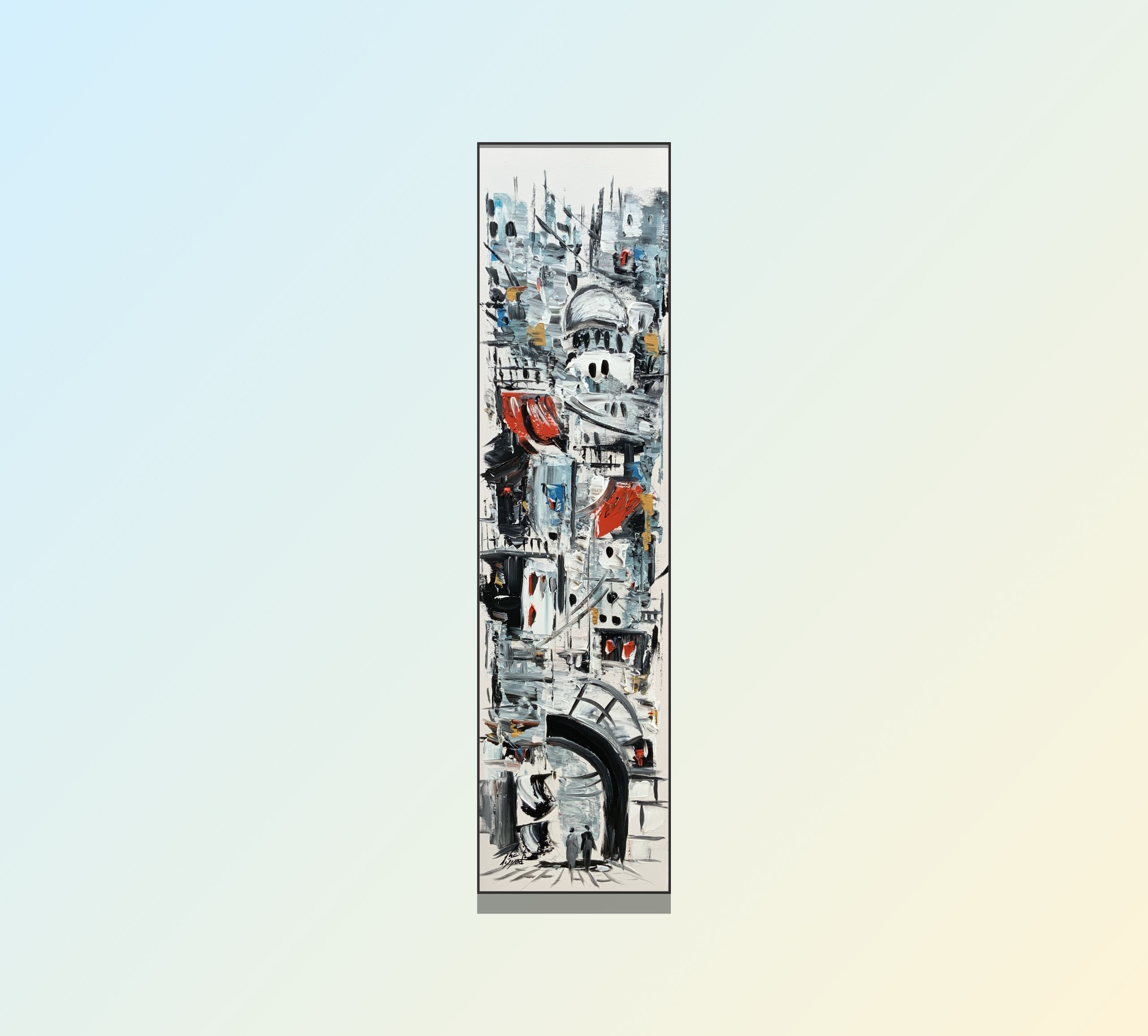 This painting takes us on a visual journey through lively alleyways, where blue and white houses embrace one another in harmony. Details flow like silent music, leading to an ancient archway that tells stories of passersby. Warm accents bring a sense of life and intimacy within a richly layered composition.
