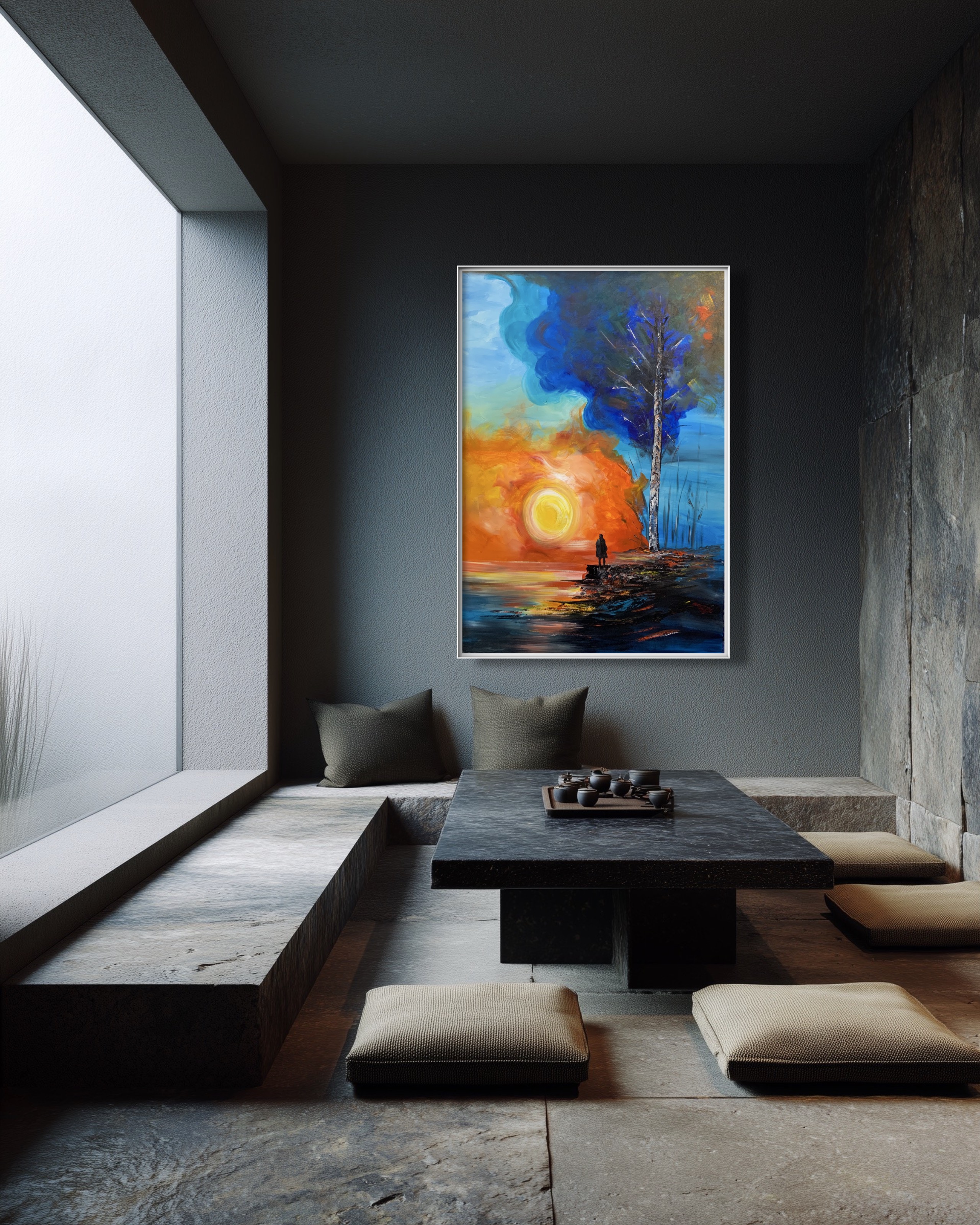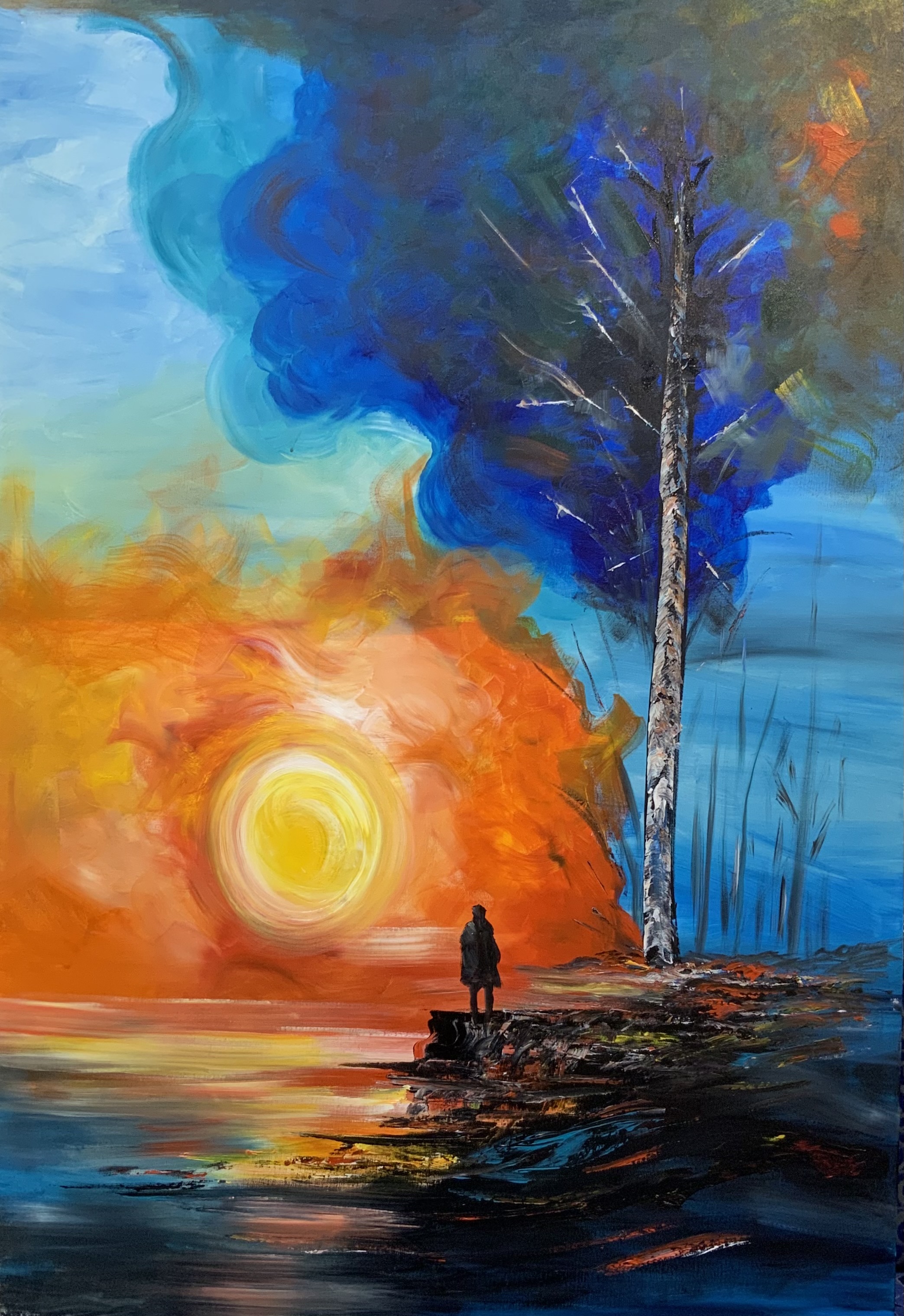 An expressive artwork that blends the warmth of the sun with the coolness of water. A solitary figure stands at the edge, contemplating a glowing sun. Fiery hues merge with deep blues, creating a poetic tension between hope and solitude, beginnings and endings. The tall tree adds a symbolic sense of strength and resilience against the passage of time.