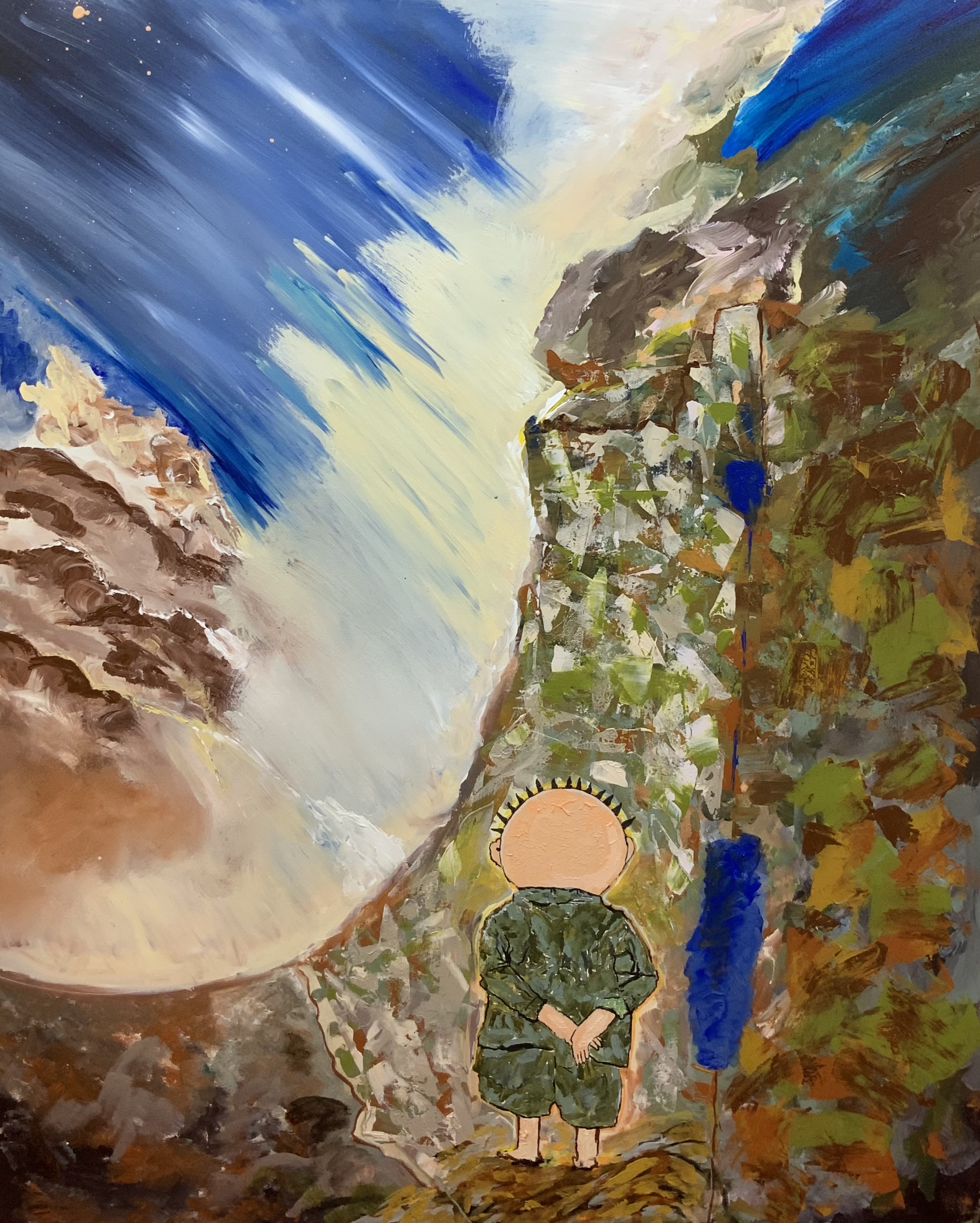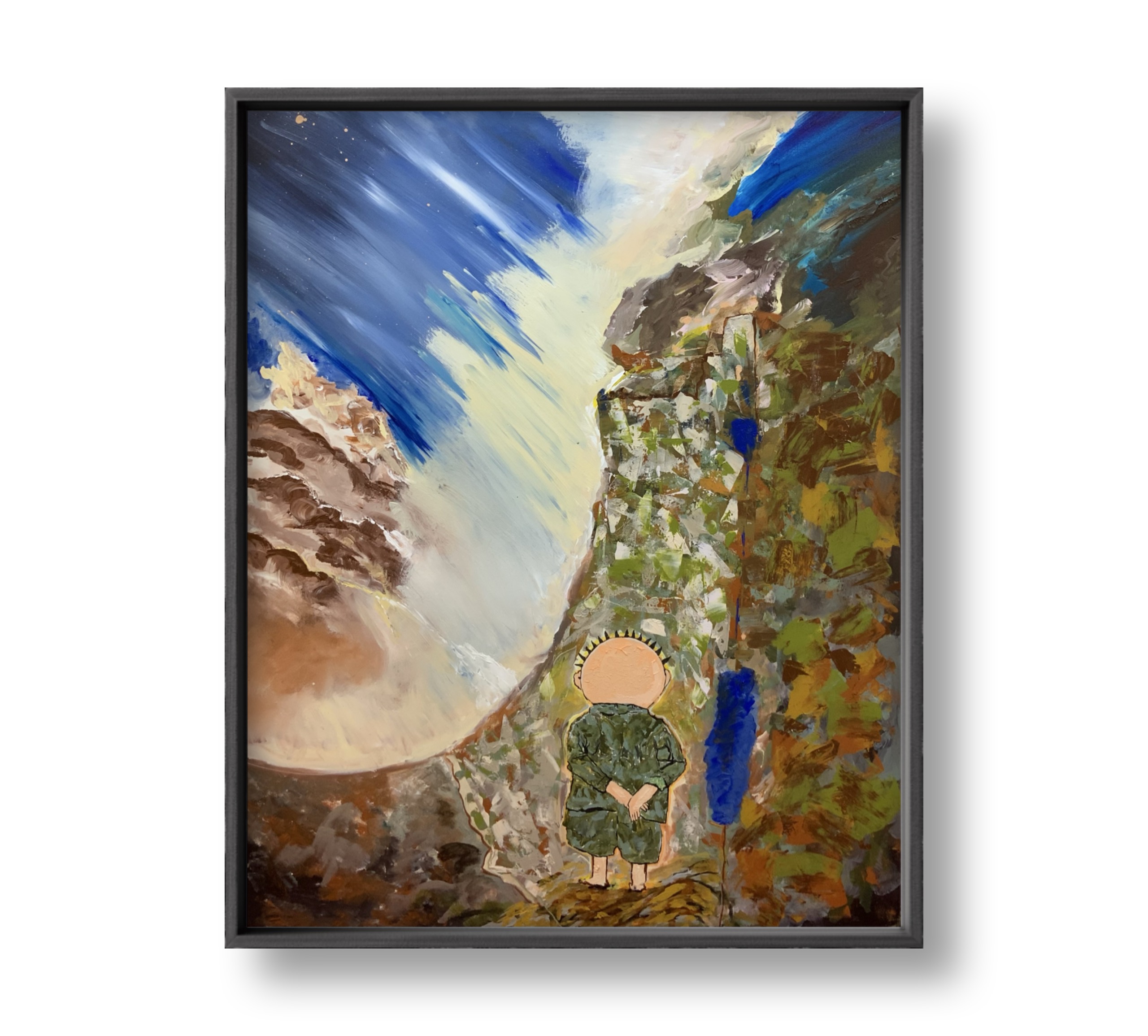 This painting captures a silent moment of inner confrontation, where a child stands at the edge of a vast natural landscape—small in scale, yet grounded in presence. Bold brushstrokes and striking contrasts reflect the tension between innocence and strength, humanity and the immensity of the world, inviting deep contemplation and interpretation.