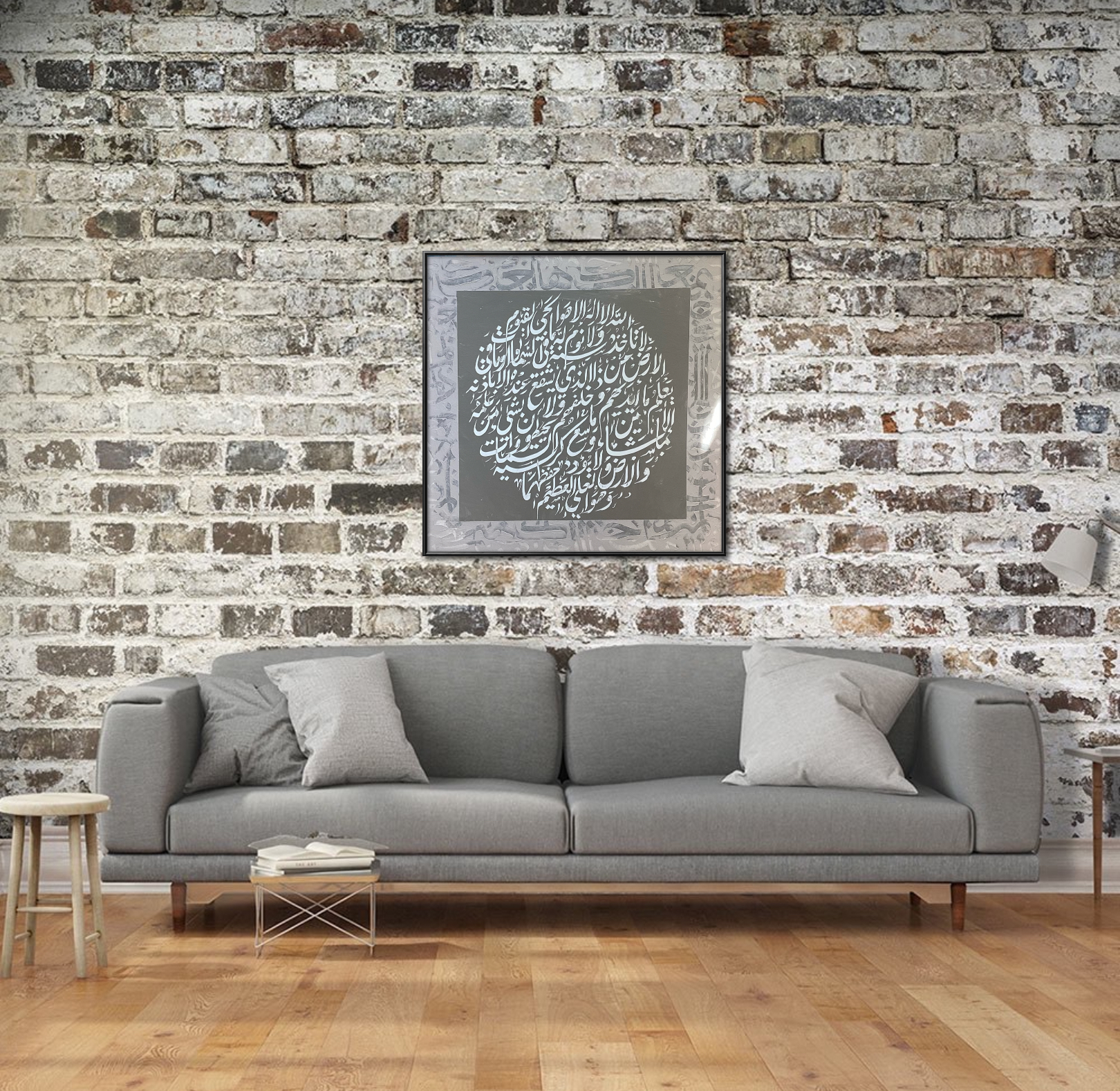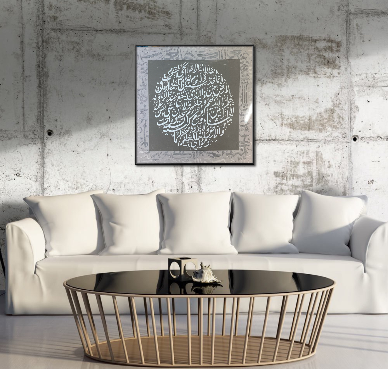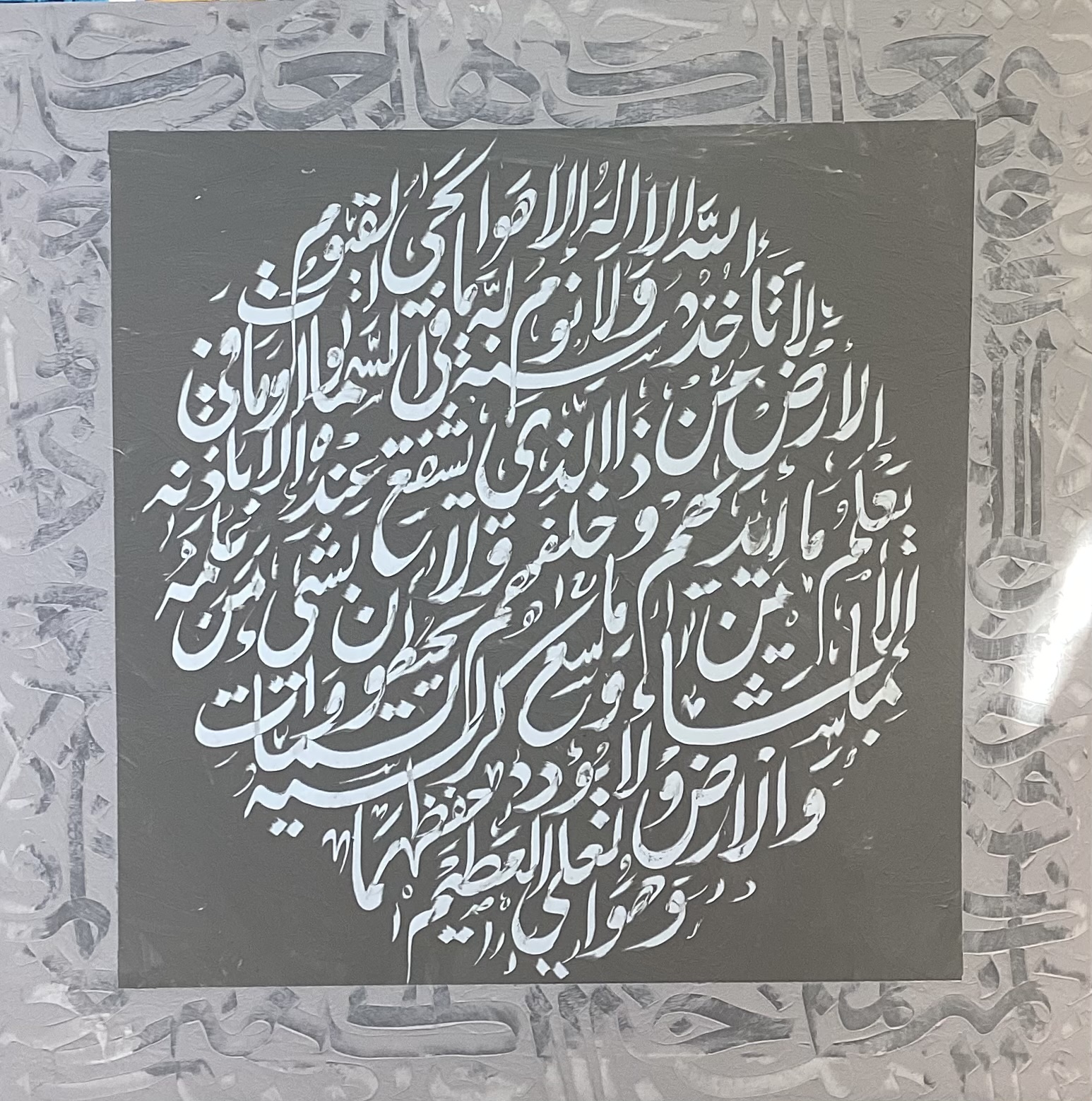 The artwork showcases a beautiful piece of Arabic calligraphy that reflects both spiritual depth and visual elegance. At its center, Ayat al-Kursi (The Throne Verse) is written in Thuluth or Diwani script, intricately arranged within a balanced circular form. The gray-toned background features softly layered letters, adding depth and emphasizing the white calligraphy in the foreground with refined contrast.