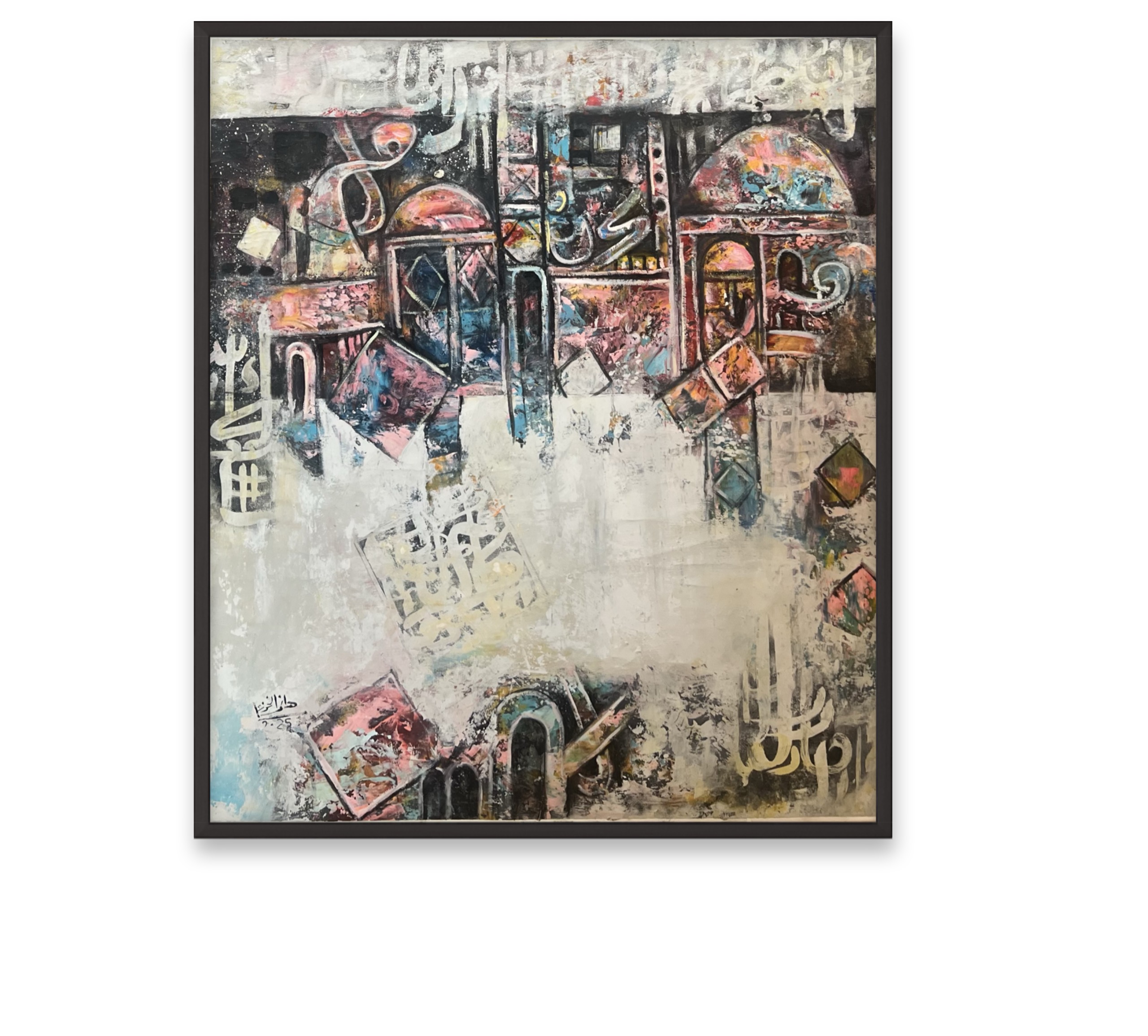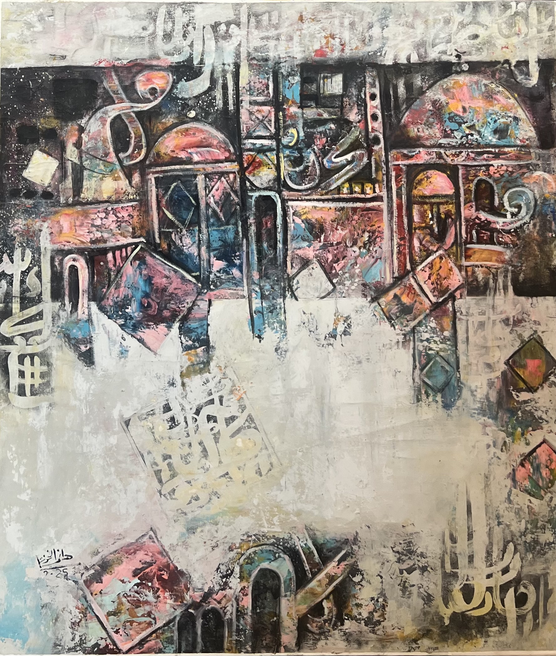 This artwork presents an abstract vision of Eastern architecture infused with memory, where arches and windows intertwine with Arabic letters in a richly layered visual space. Weathered colors and textured surfaces suggest the passage of time, as if the city silently tells its stories through its walls—creating a poetic fusion of place and identity.