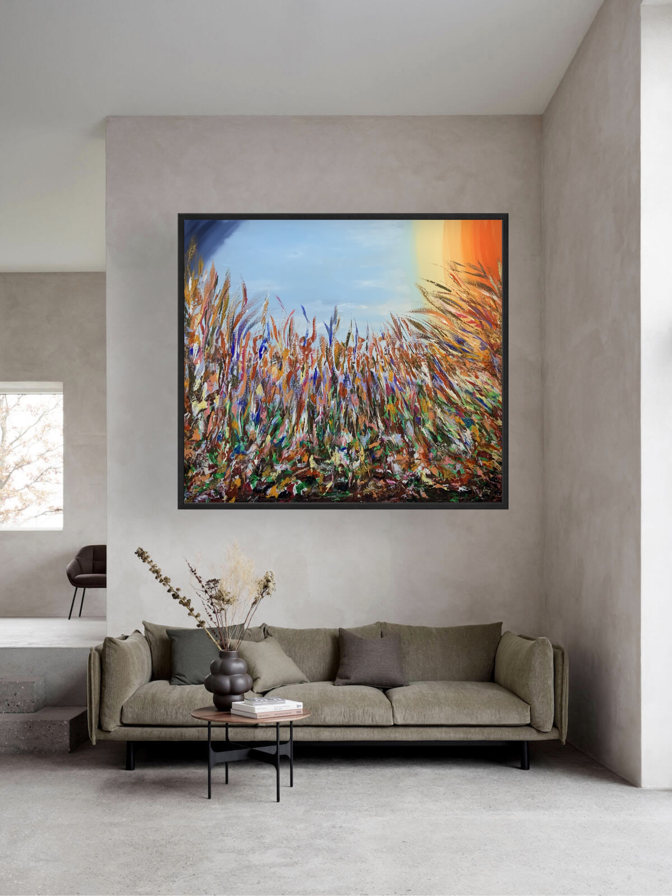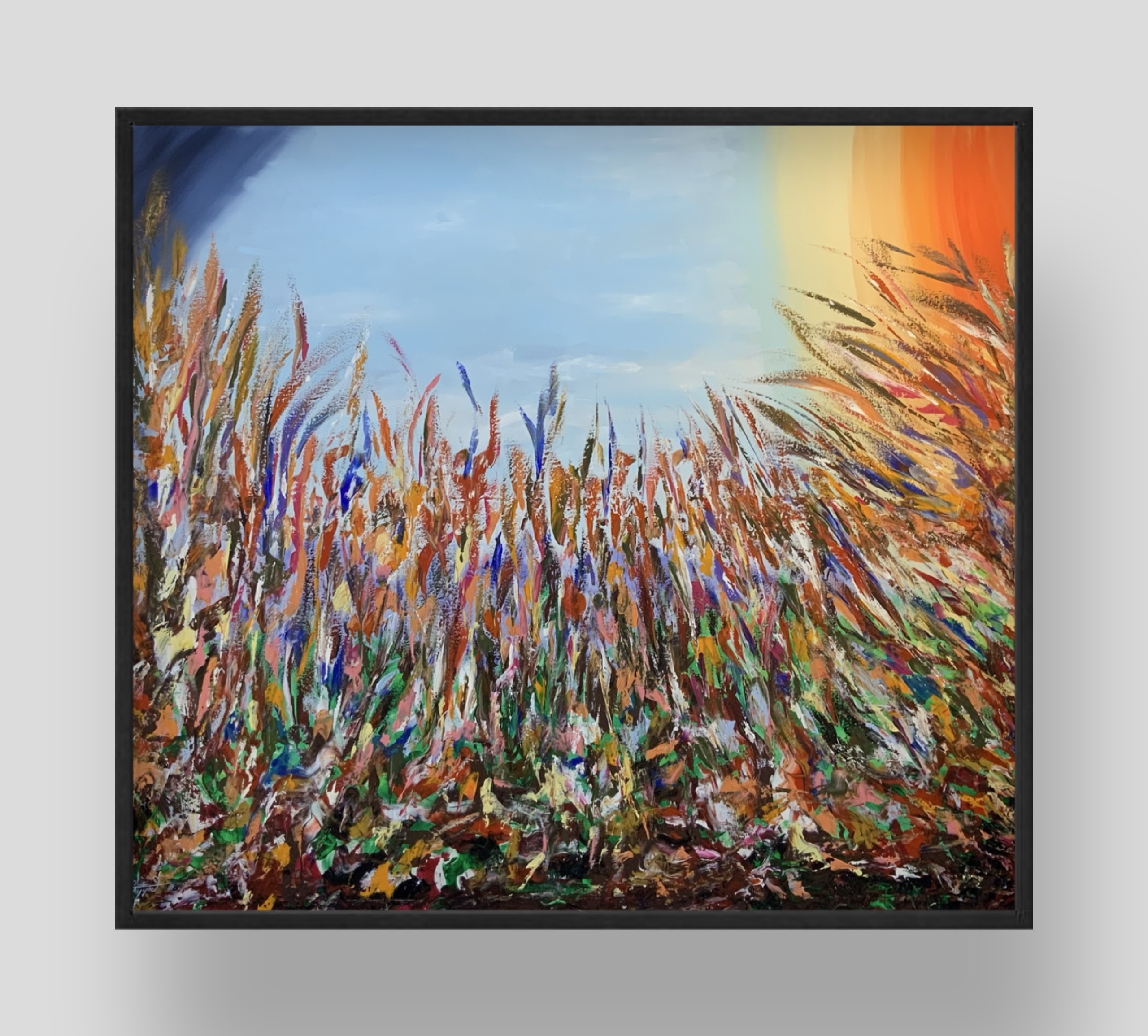 An abstract celebration of nature’s vitality, this painting bursts with energetic brushstrokes and vibrant hues. The foreground resembles wild grasses or blooming flowers in full flourish, rendered in reds, yellows, greens, and purples. These forms stretch upward into a calm, pale blue sky, creating a harmonious contrast between motion and serenity. The piece evokes a sense of growth and seasonal joy, capturing nature at its most expressive.