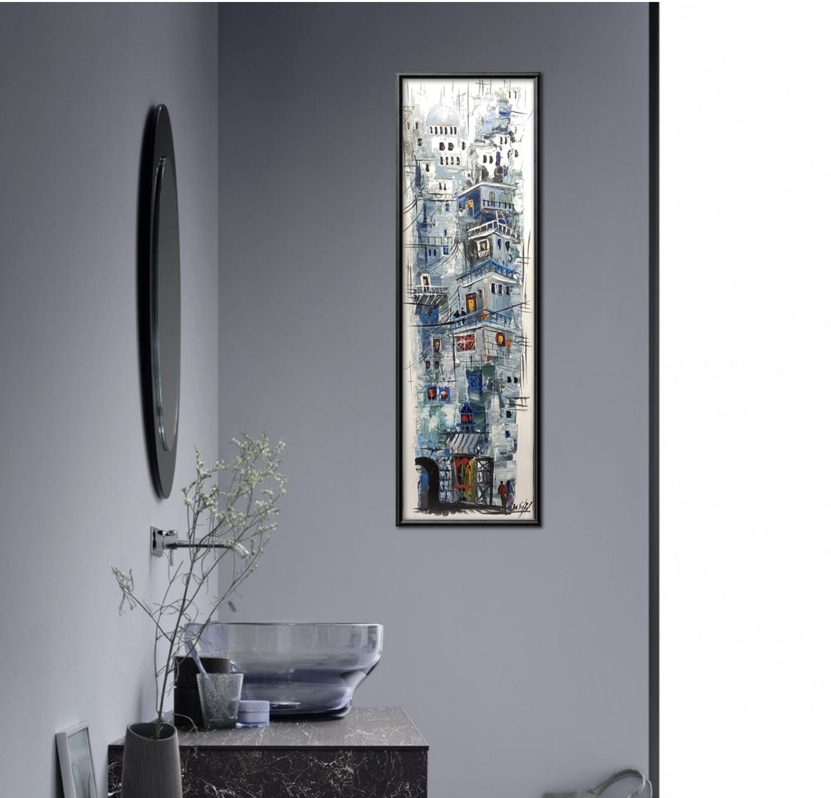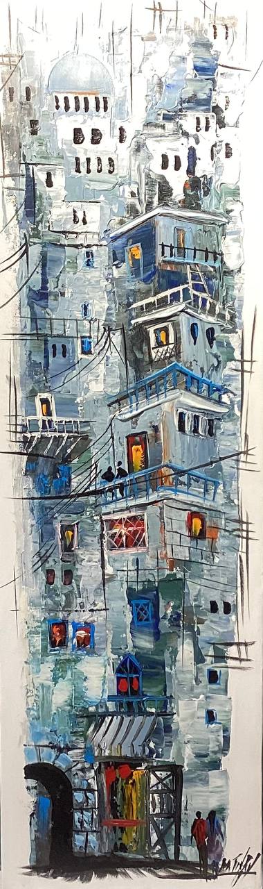 In this captivating painting, Amman is portrayed through a spectrum of deep and light blue hues, transforming the city into a vision of serenity and depth. The stacked stone houses, arches, and domes emerge like waves across the hills, while the cool blue tones reflect the spirit of calm and continuity that defines the Jordanian capital. The artwork evokes a feeling of timeless beauty — where sky and city blend into one harmonious blue dream.