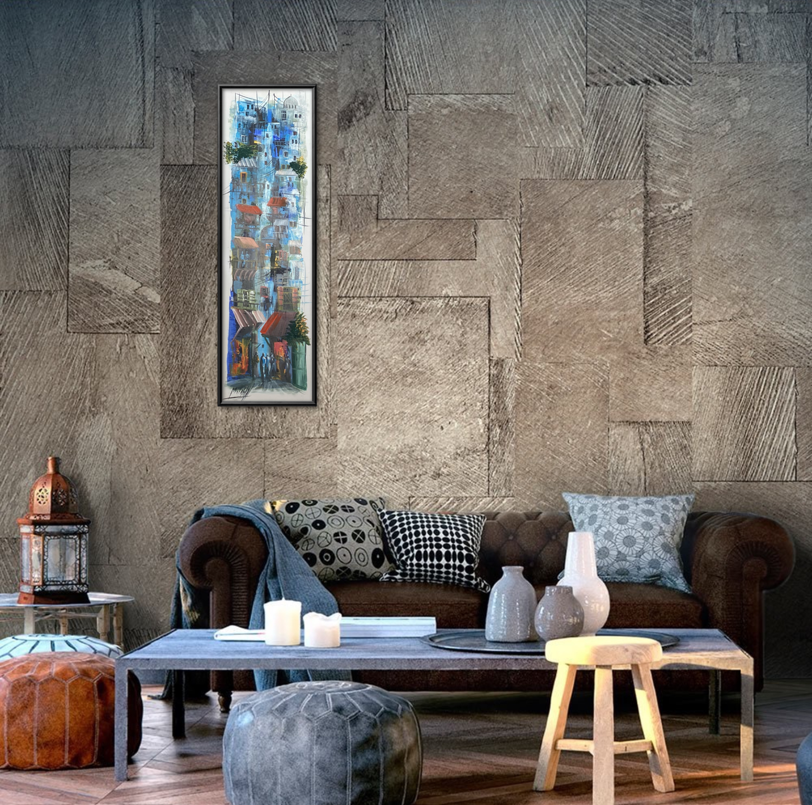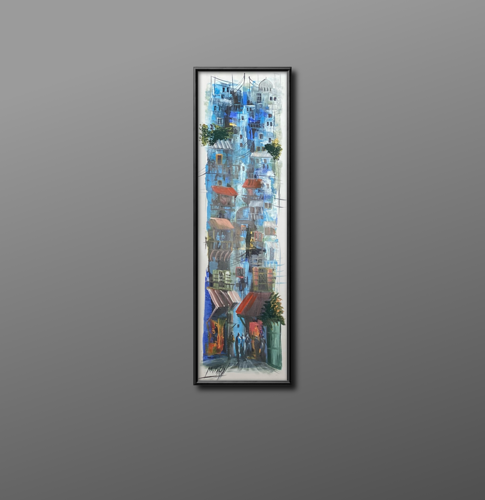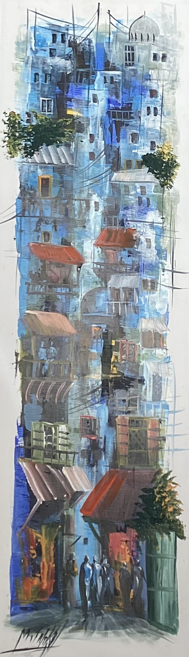 This painting captures an expressive view of Amman, dominated by varying shades of blue that evoke serenity and depth. The red market stalls in the foreground bring warmth and vibrancy to the cool palette, while the dome crowns the scene as a symbol of heritage and peace. The artwork conveys a contemplative atmosphere, blending the soul of the old city with its timeless beauty.