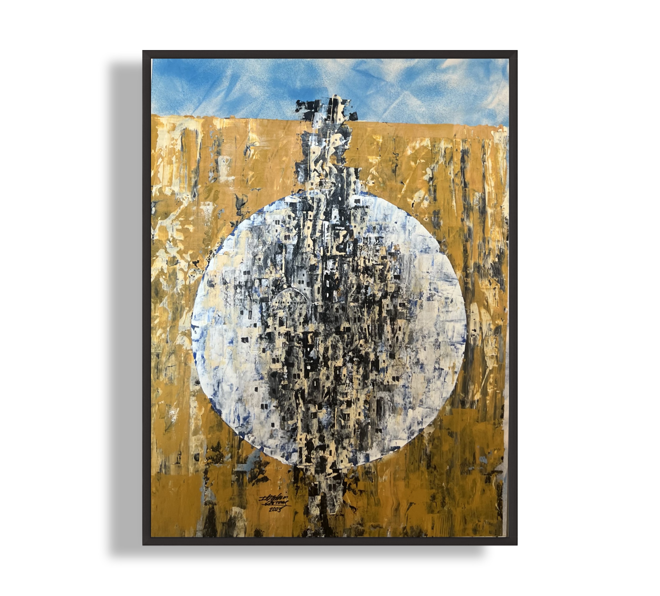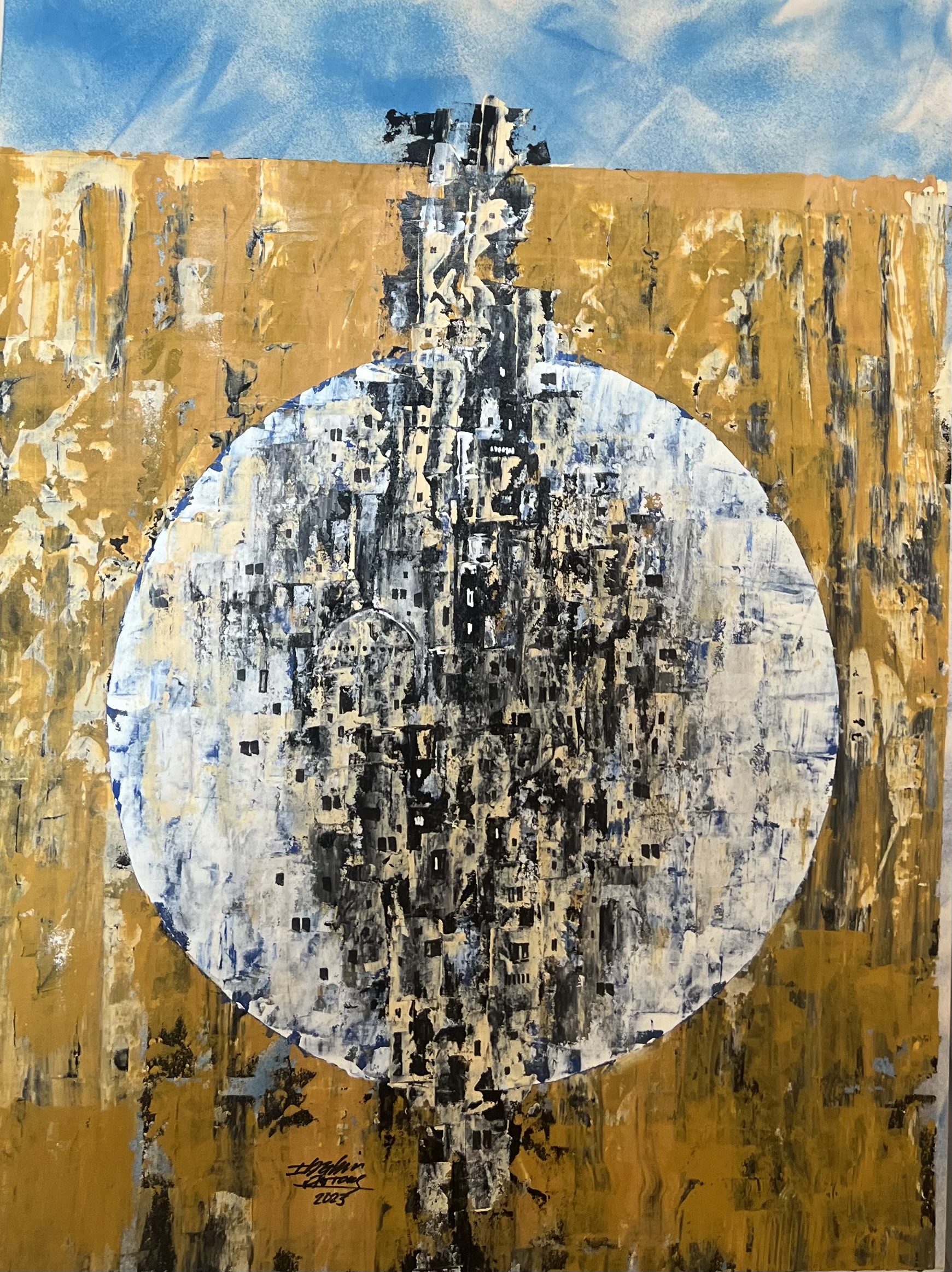 The painting revolves around a central circle that acts as a visual gateway between sky and earth. Vertical lines and rough textures intersect in an abstract dialogue, reflecting a balance between strength and calm. The artwork carries a symbolic sense of stability amid transformation.