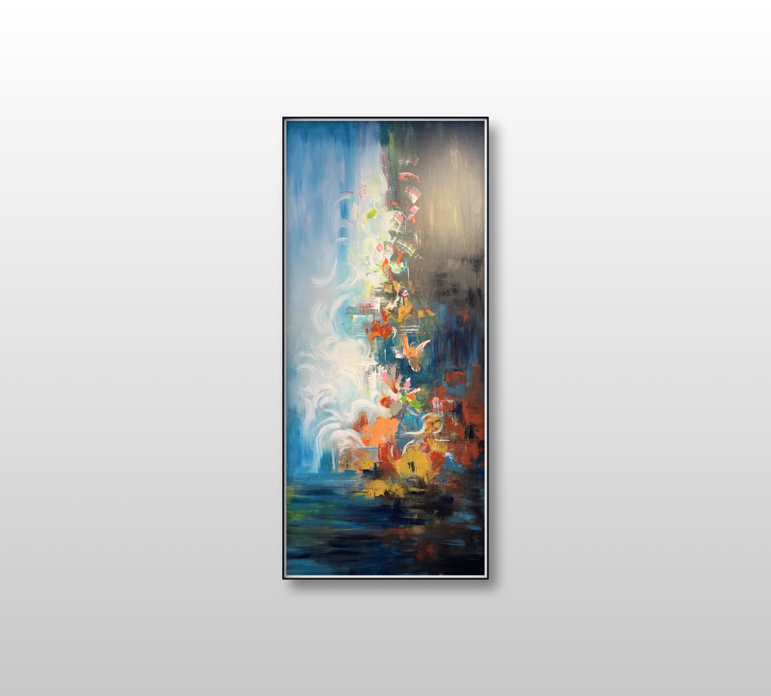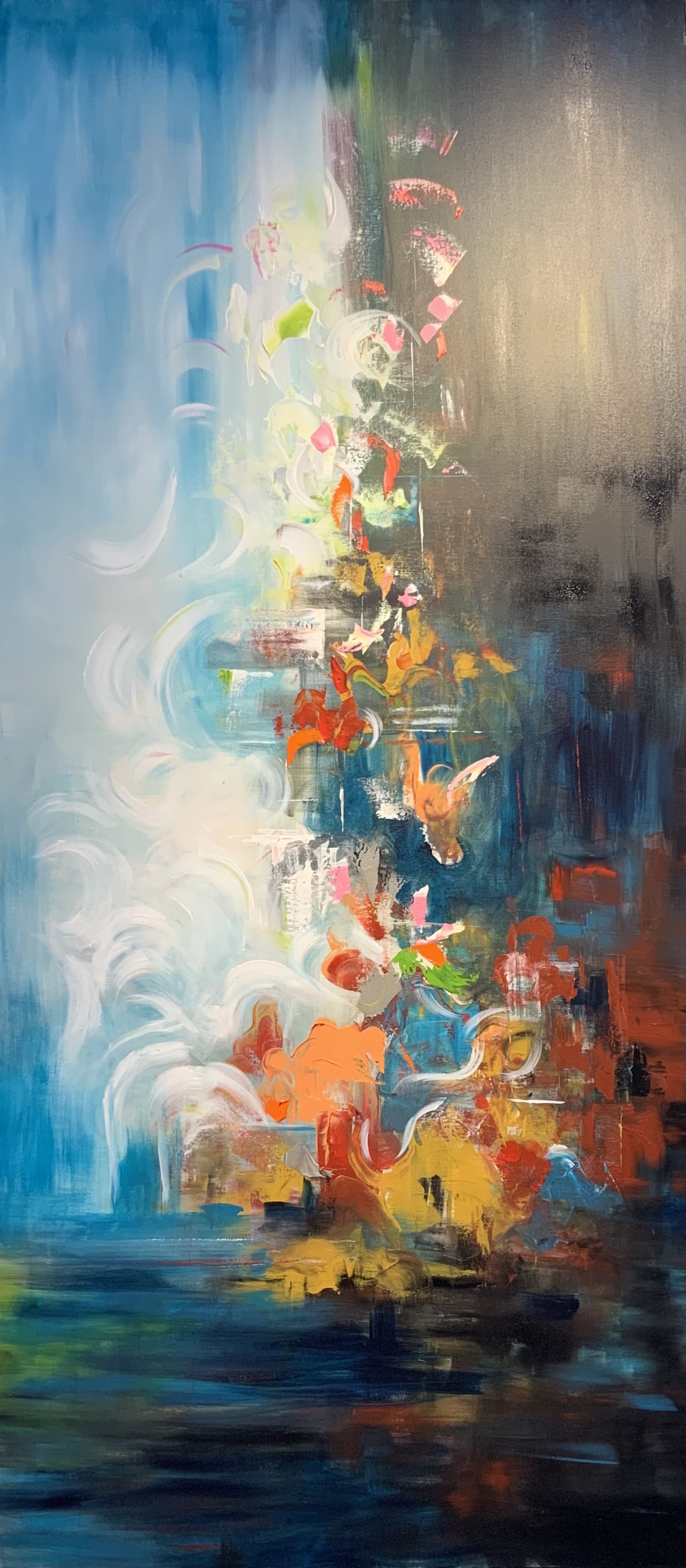 An abstract painting that conveys an inner transformation, as colors rise from a calm depth into a brighter, more dynamic space. The interplay of luminous white with cool blues and warm accents forms a visual flow that suggests liberation and momentum—colors emerging from silence to assert their presence.
