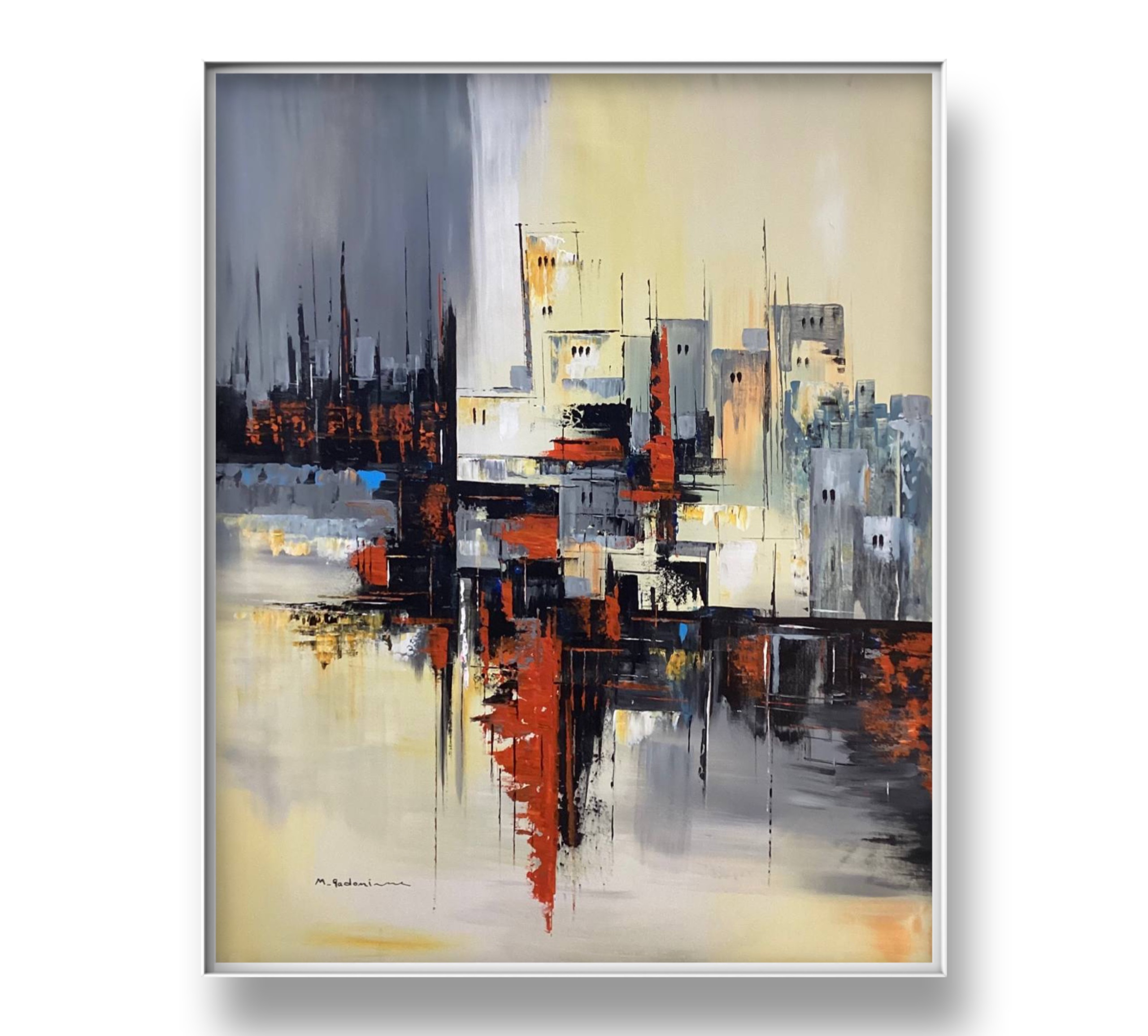 An abstract painting depicting a contemporary city emerging between light and shadow. Architectural forms blend with their reflections in a calm visual space. The interplay of greys, warm tones, and bold orange accents evokes silent movement, as if the city is suspended between wakefulness and dream, reality and reflection.