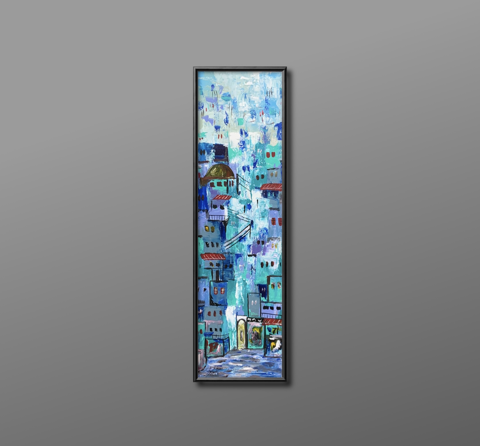 Abstract forms intertwine with the outlines of a city bathed in turquoise blue, creating a visual world between reality and imagination. The flowing lines and serene tones reflect emotional depth and inner calm, as if the city rests within a sea of light and dreams.