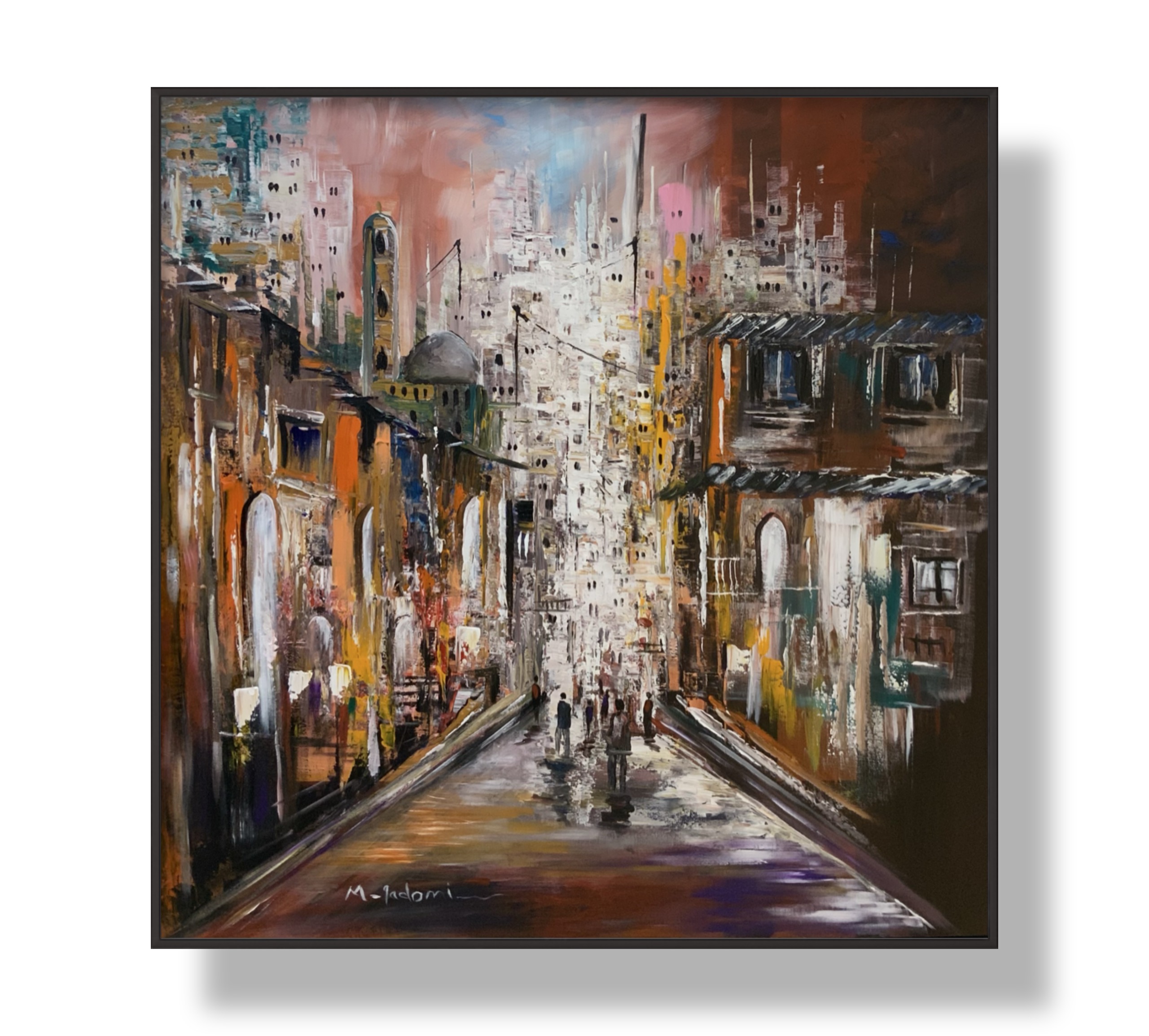 An abstract cityscape capturing the pulse of urban life, where historic architecture meets modern rhythm along a long urban passage. Warm and cool tones intertwine to reflect human movement and light reflections on the street, creating a sense of depth, nostalgia, and continuous motion.