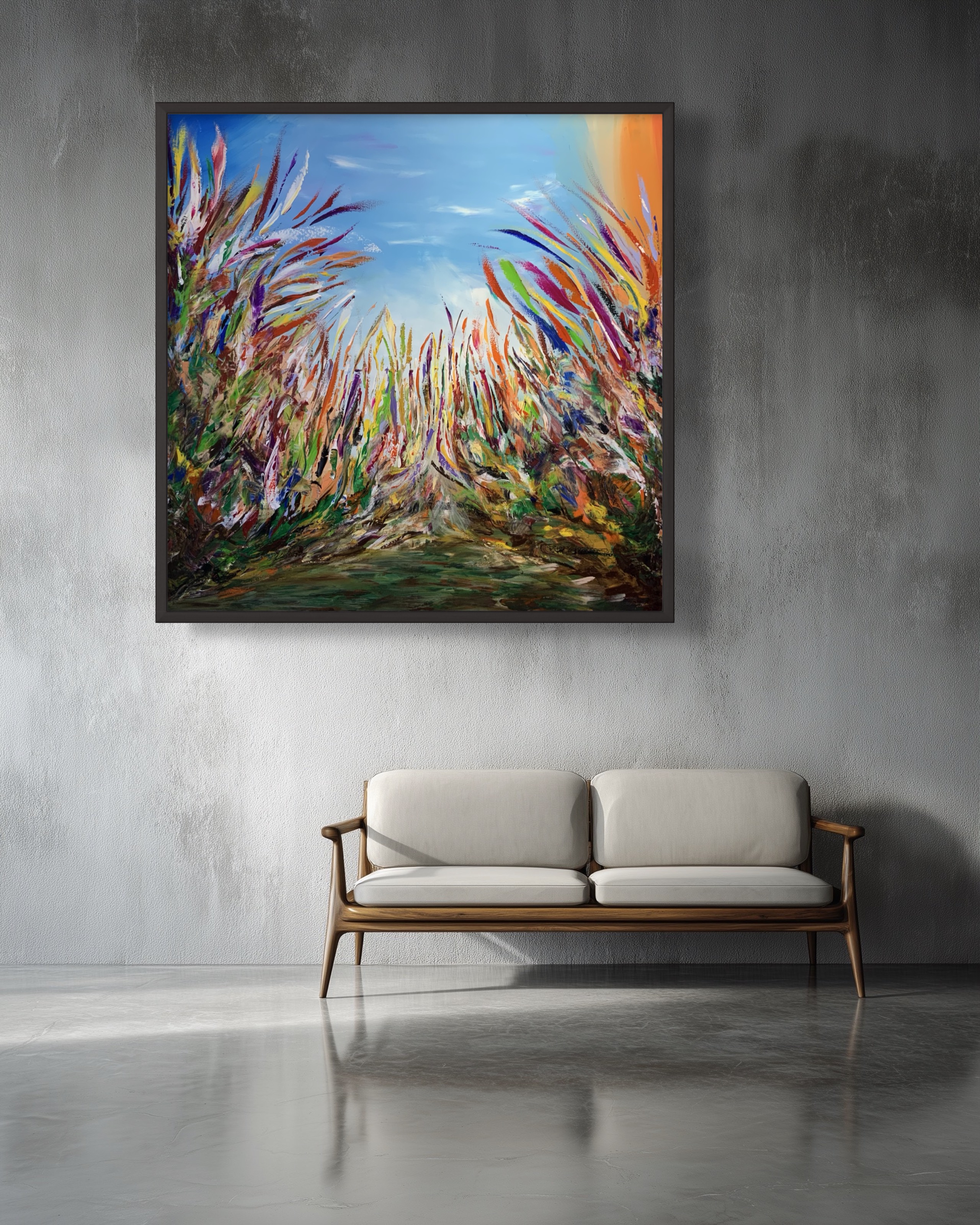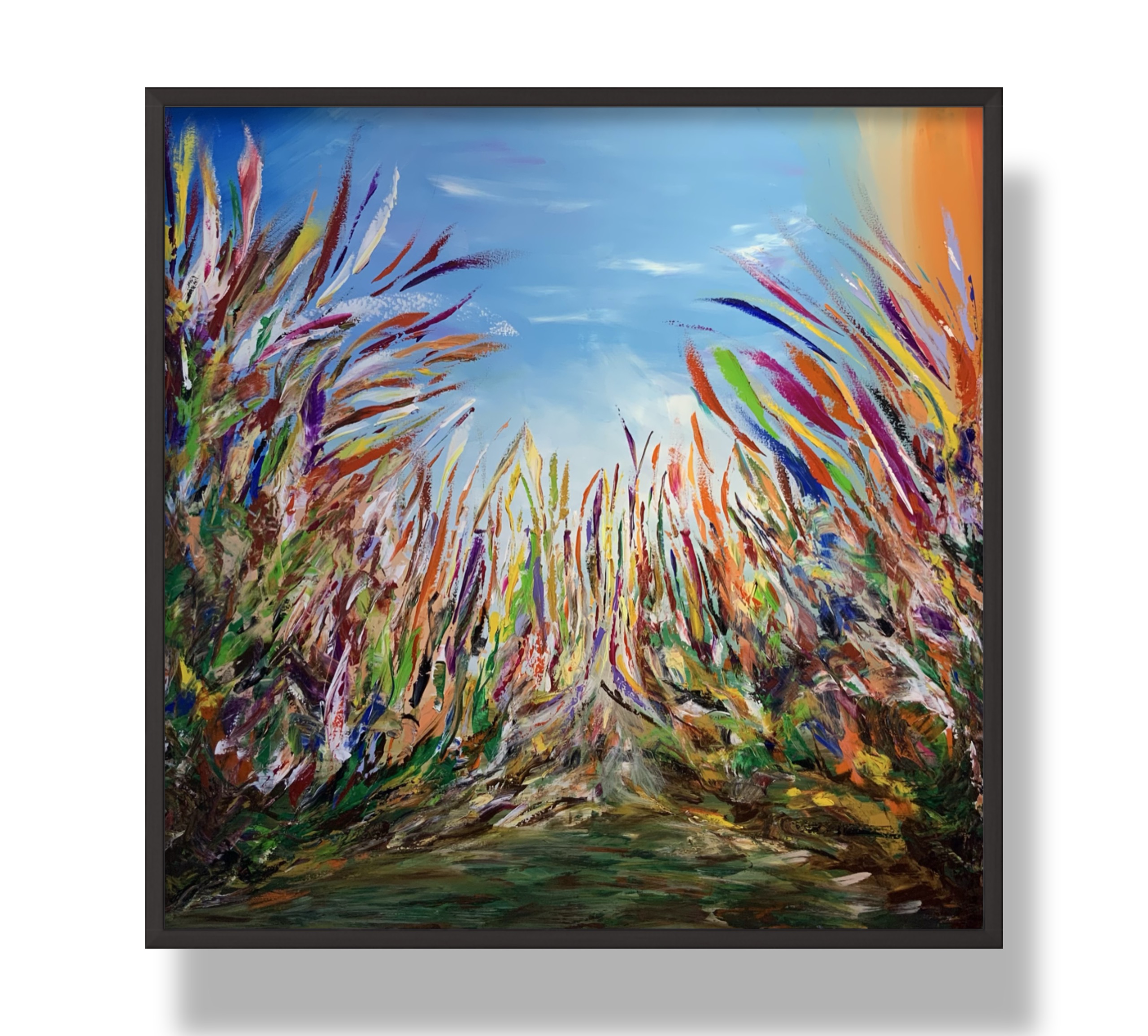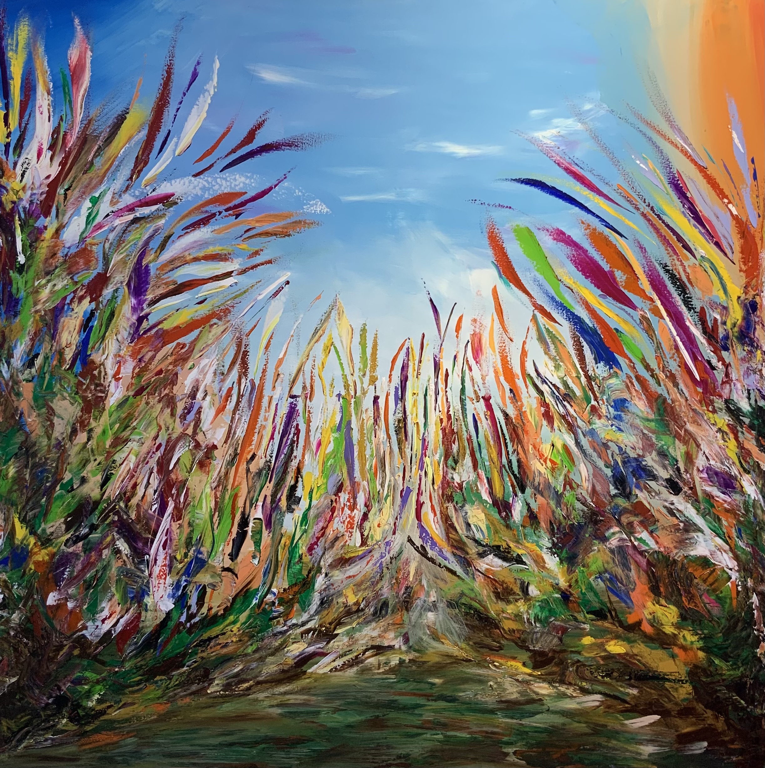 This painting overflows with movement and vitality, as colorful plants sway beneath a bright blue sky in a harmonious natural dance. Rapid brushstrokes and bold colors convey a sense of freedom and flow, while the open space at the center guides the eye toward the horizon and light.