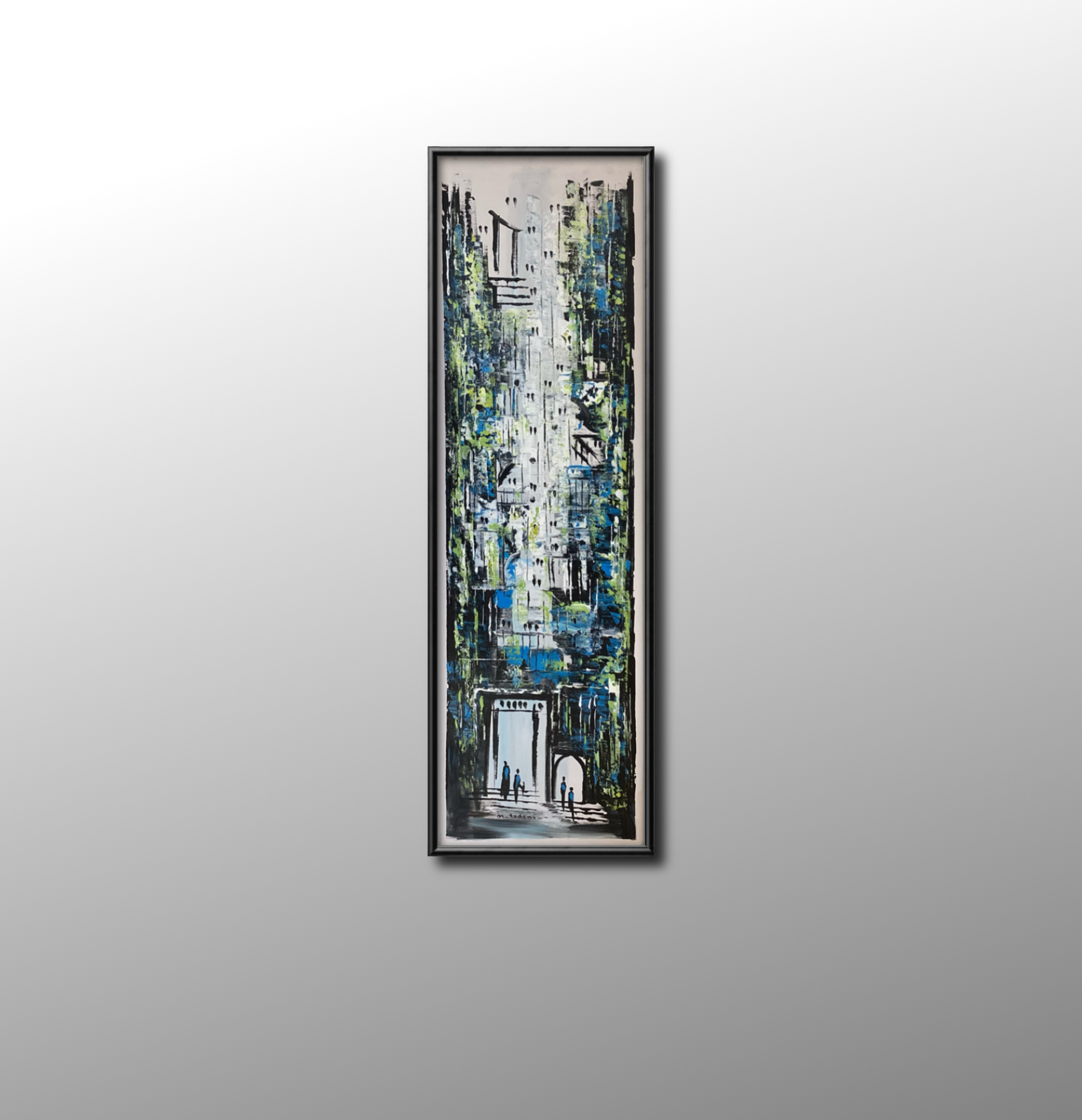 In this painting by Mohammad Qadomi, a towering abstract façade emerges through rhythmic layers of architectural form. The composition flows between obscurity and revelation, with vertical and horizontal lines intertwining to suggest height and endurance. At the base, a luminous entrance emanates light and vitality, while small human silhouettes stand before it, adding emotional depth and balance to the grand structure. The work captures the dialogue between time and space — a silent narrative of a city rising from its own memory toward the horizon.