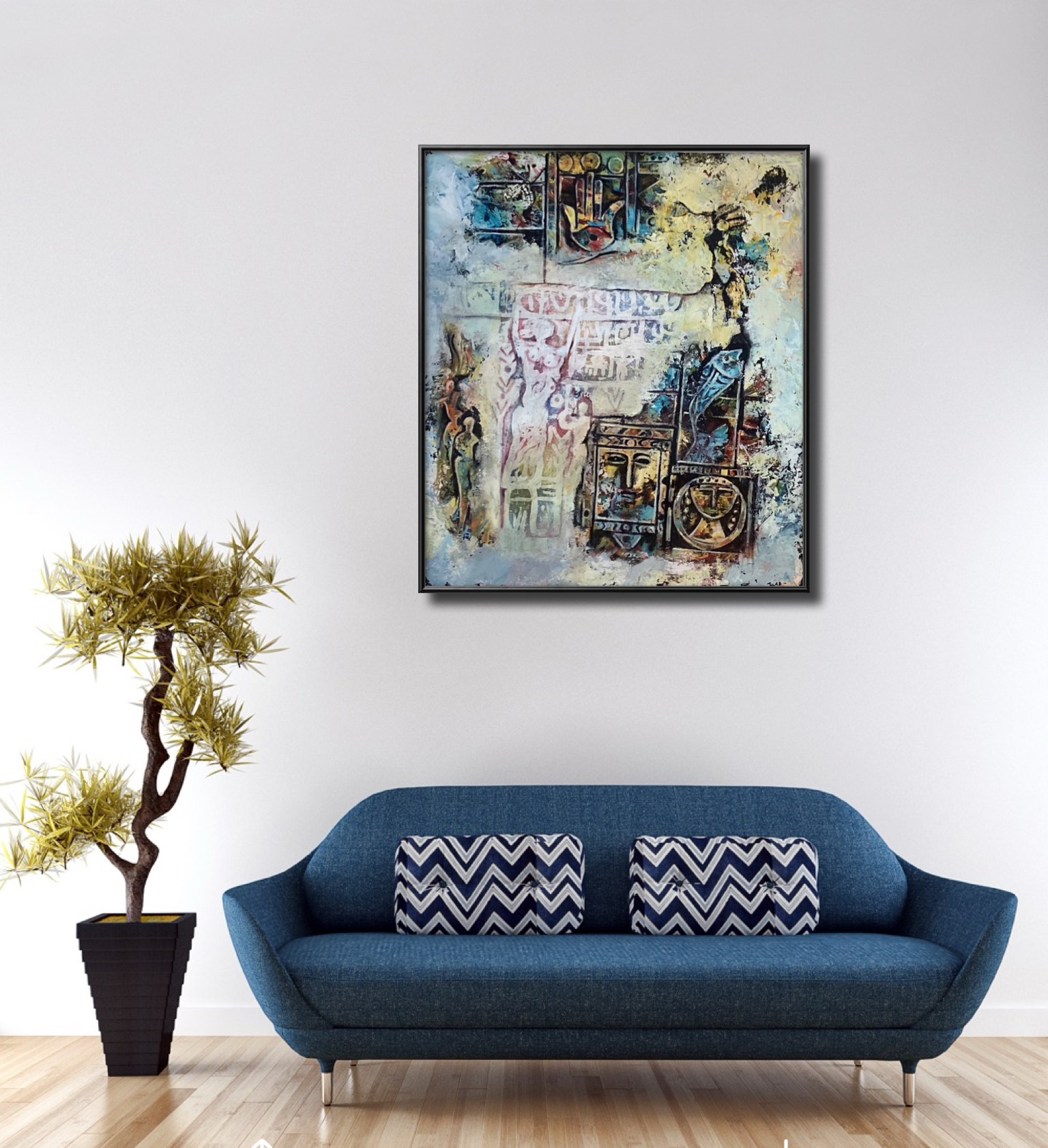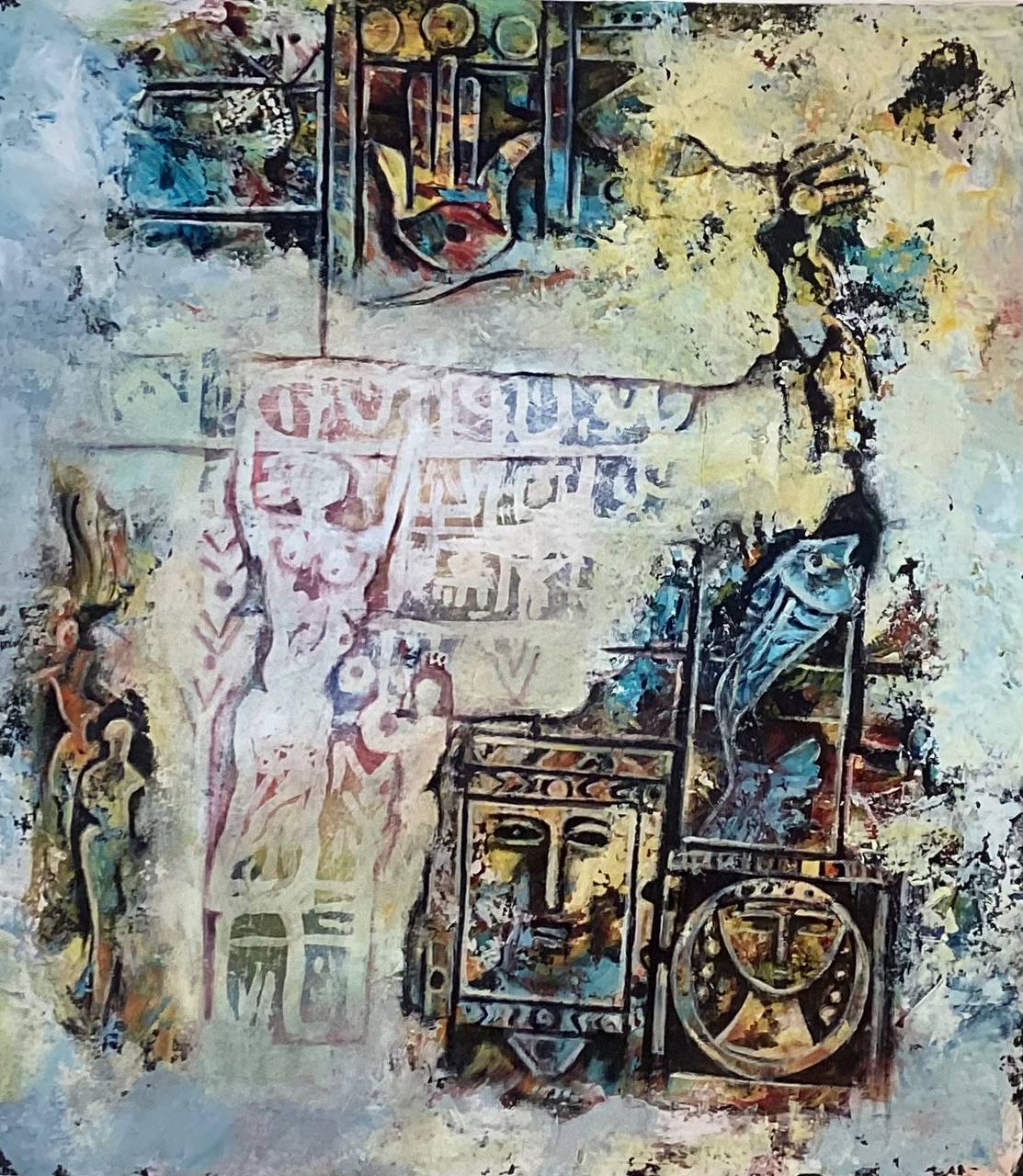 This artwork evokes the spirit of ancient civilizations through rock-like carved symbols featuring human faces, a hand, and abstracted bodies. The rough textures and primitive forms resemble ancestral markings etched into stone walls, creating a visual narrative that bridges past and present. The piece reflects humanity’s earliest expressions and the timeless connection between people and their cultural roots.