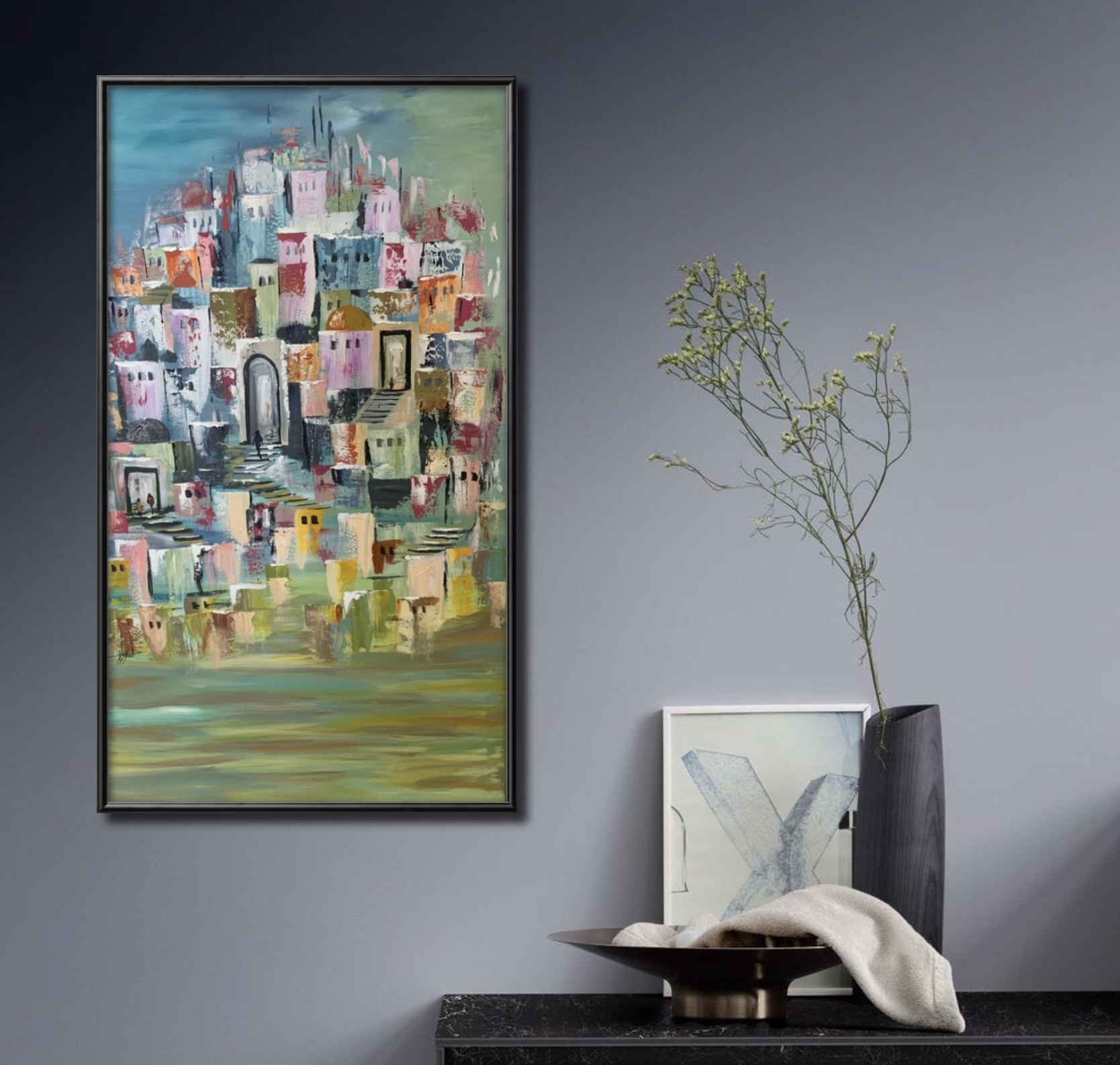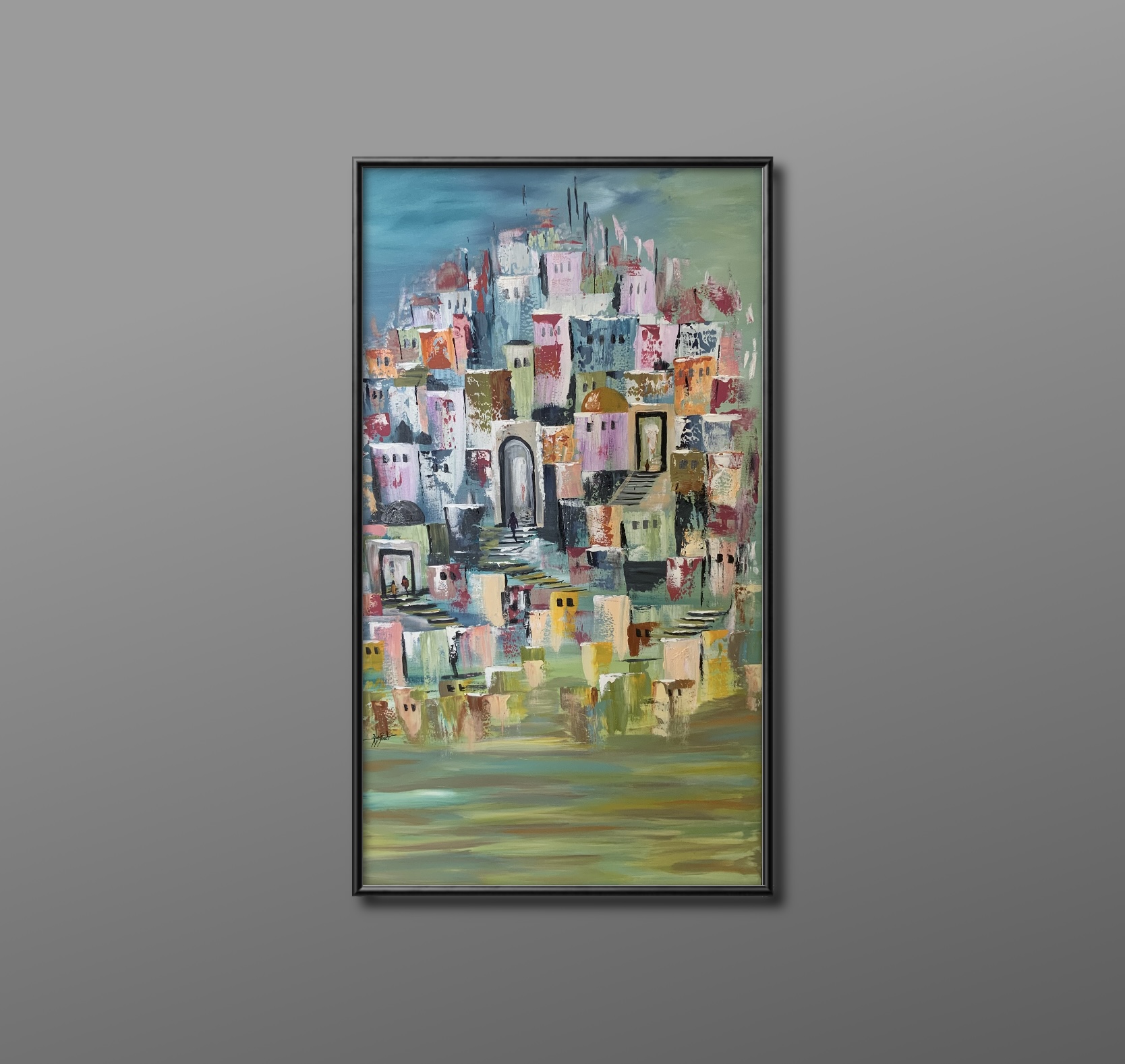 An abstract painting capturing the soul of a huddled city, where pastel-colored homes—pink, orange, white—stand like stone poems telling stories of their people. The central arched gate suggests an entry into a world of memories, while the brushstrokes of earth and sky blend freely, echoing the pulse and diversity of life.