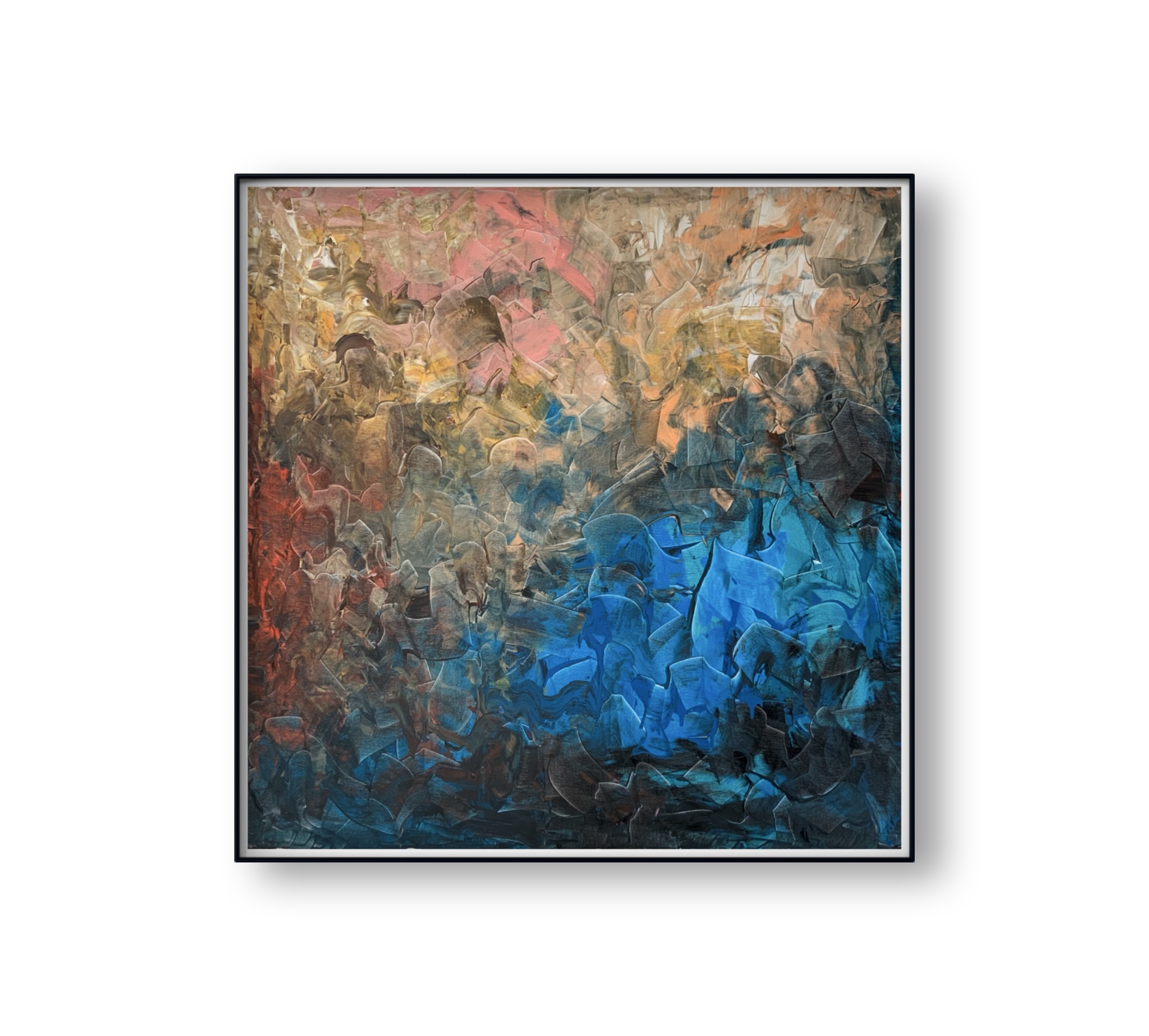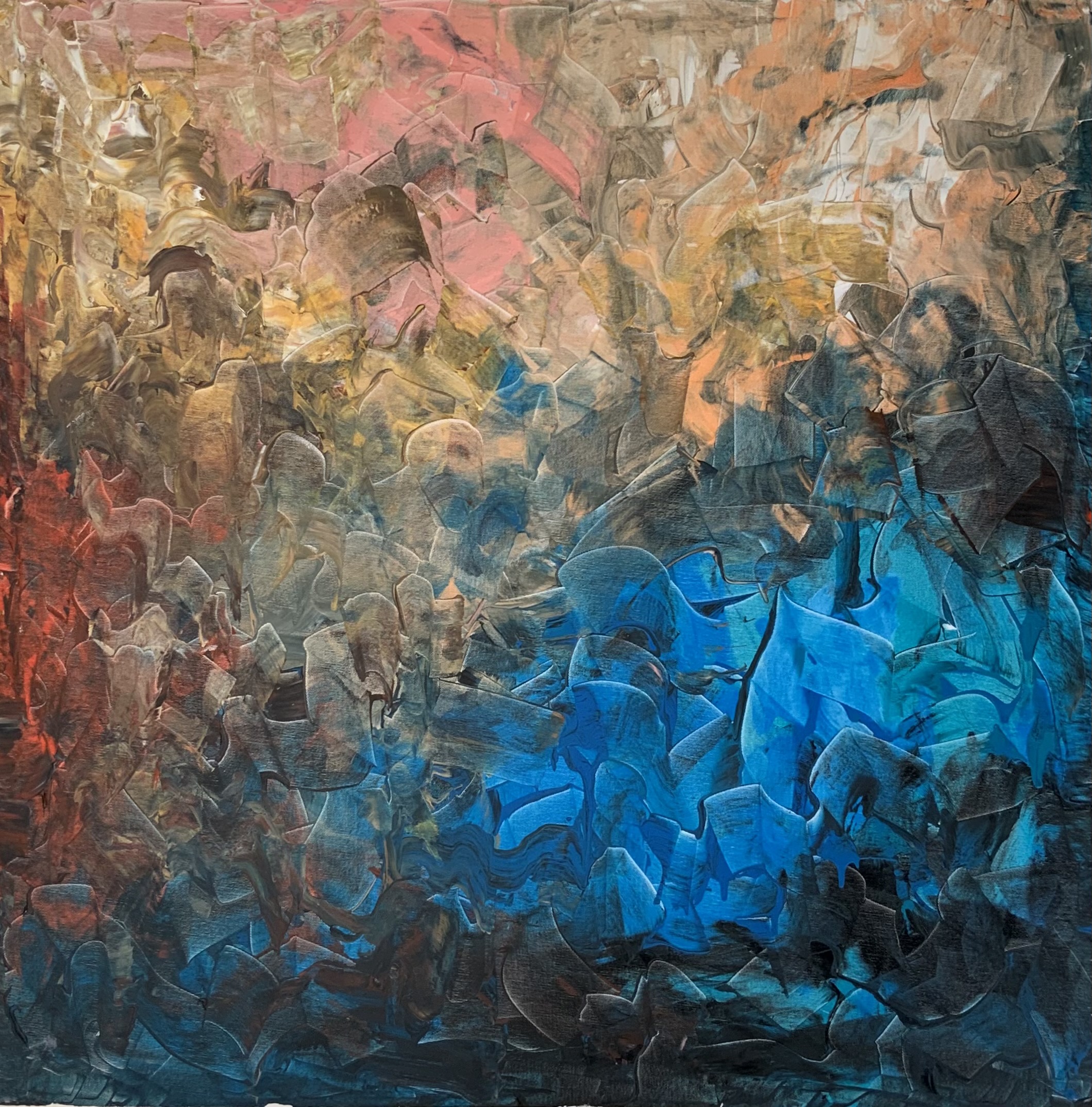 A richly textured abstract painting where layered colors resemble a map of intertwined emotions. Deep blues merge with warm earthy tones and subtle pink accents, forming a visual dialogue of transformation, tension, and harmony. The dynamic surface gives the artwork a powerful presence and tactile depth.