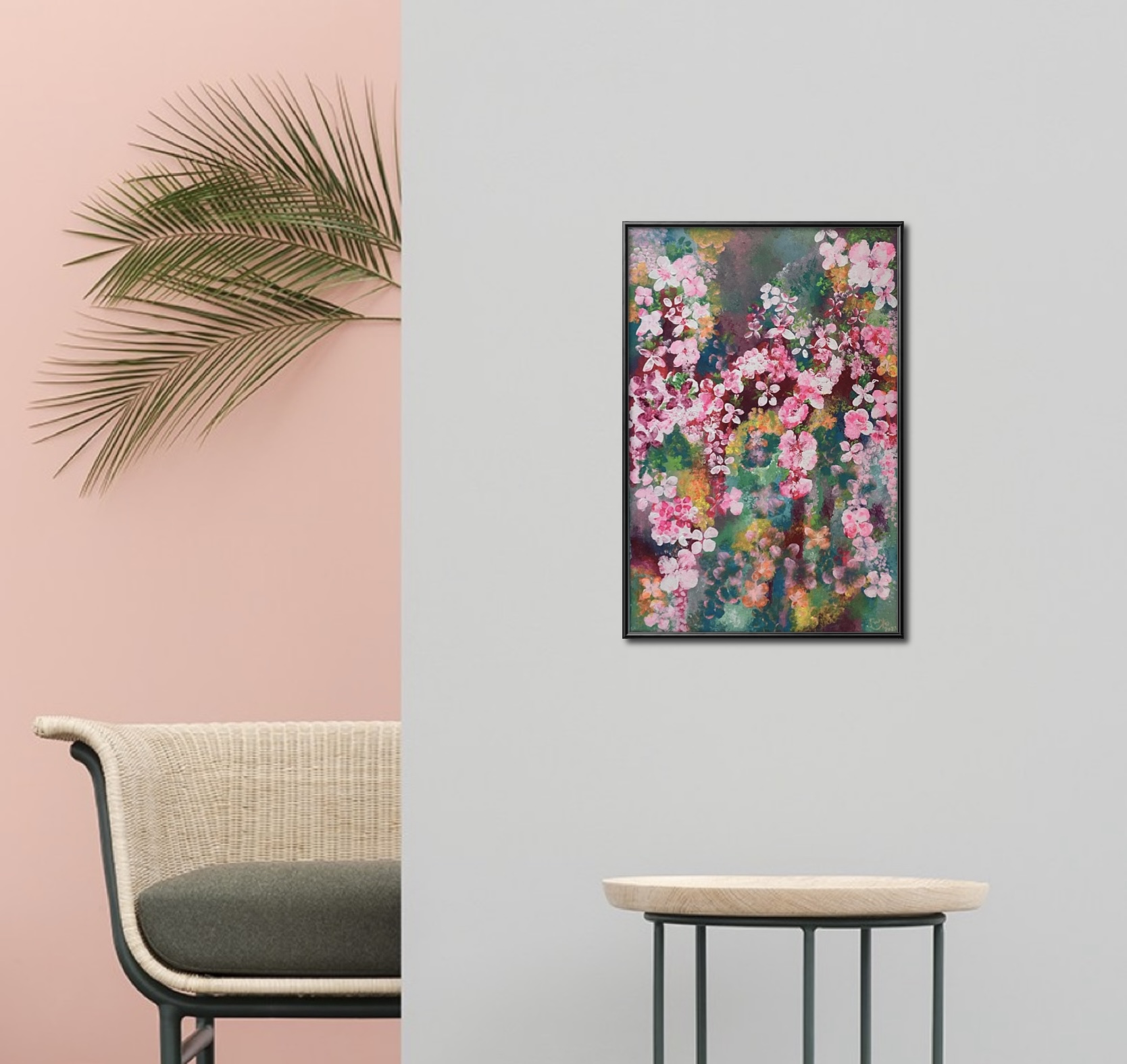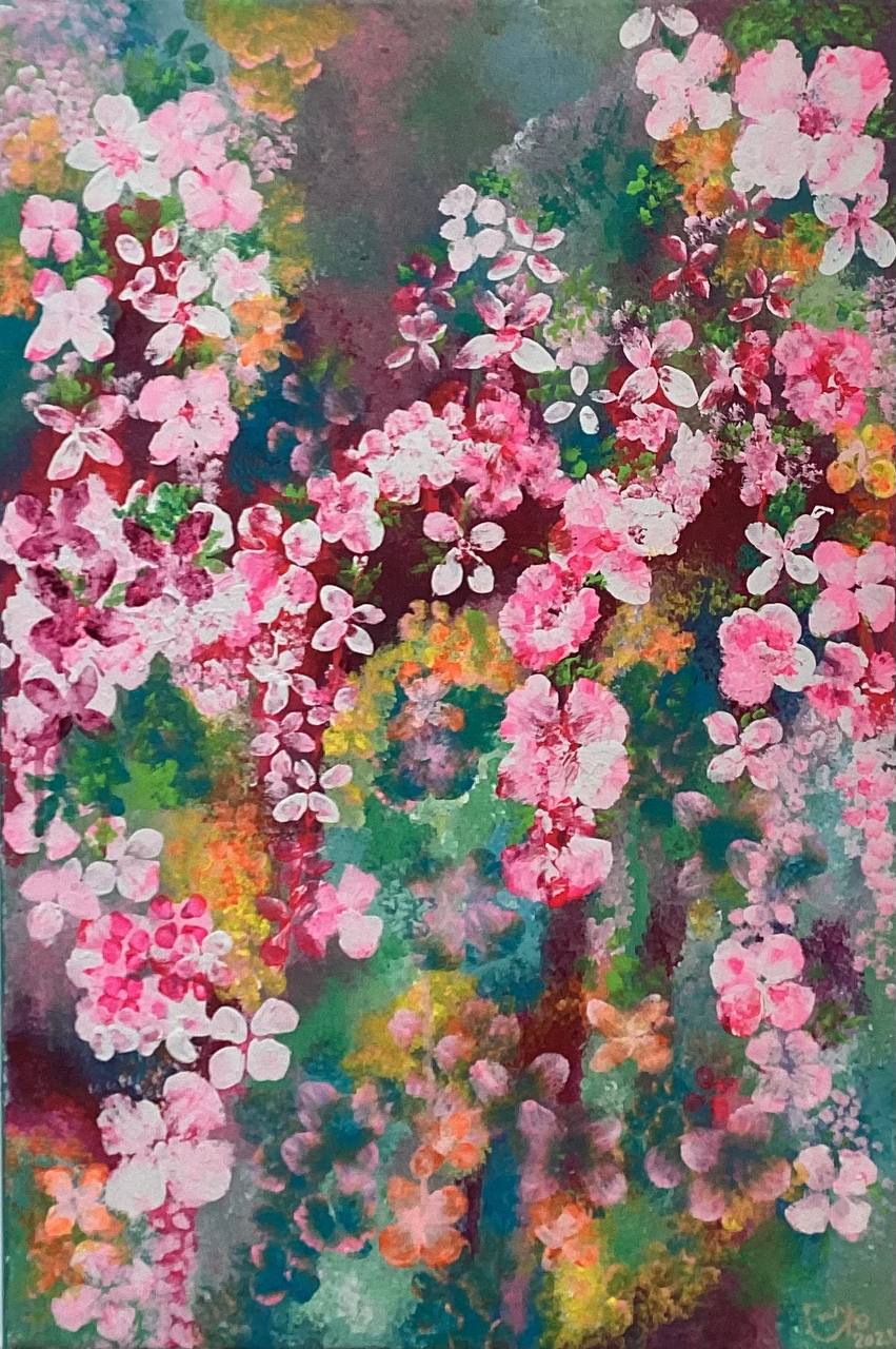 This abstract painting radiates vibrant energy through a neon pink rose, glowing like a luminous pulse within a free space of shapes and strokes. The vivid tones give the artwork a bold contemporary character, blending the delicate essence of the flower with the striking presence of abstraction.