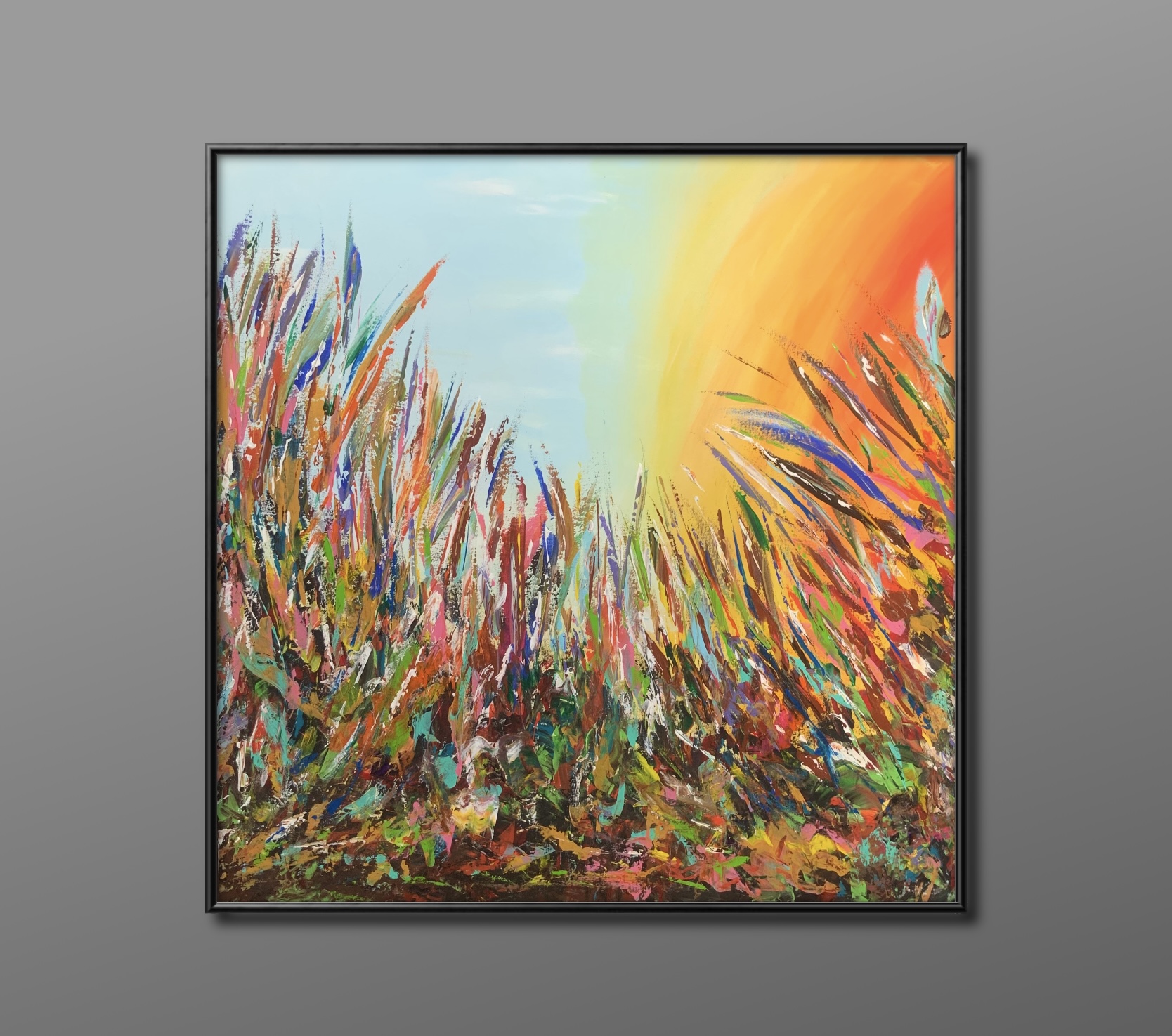 This abstract artwork portrays a vibrant flower field through expressive colors and fluid forms. Instead of realistic details, the composition relies on movement, texture, and bold hues to evoke the liveliness and joy of nature. The painting delivers a refreshing and uplifting atmosphere that invites the viewer into its energetic visual rhythm.