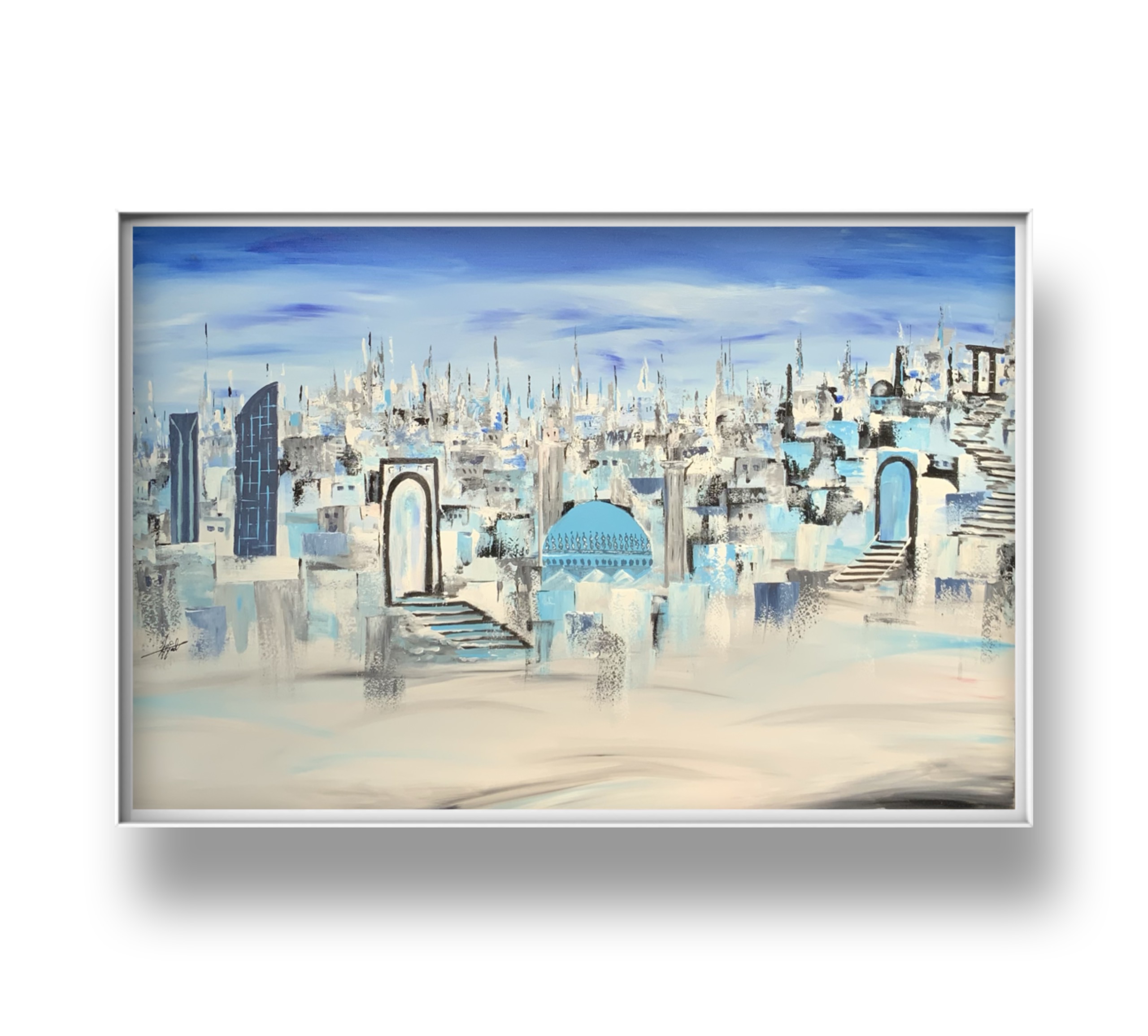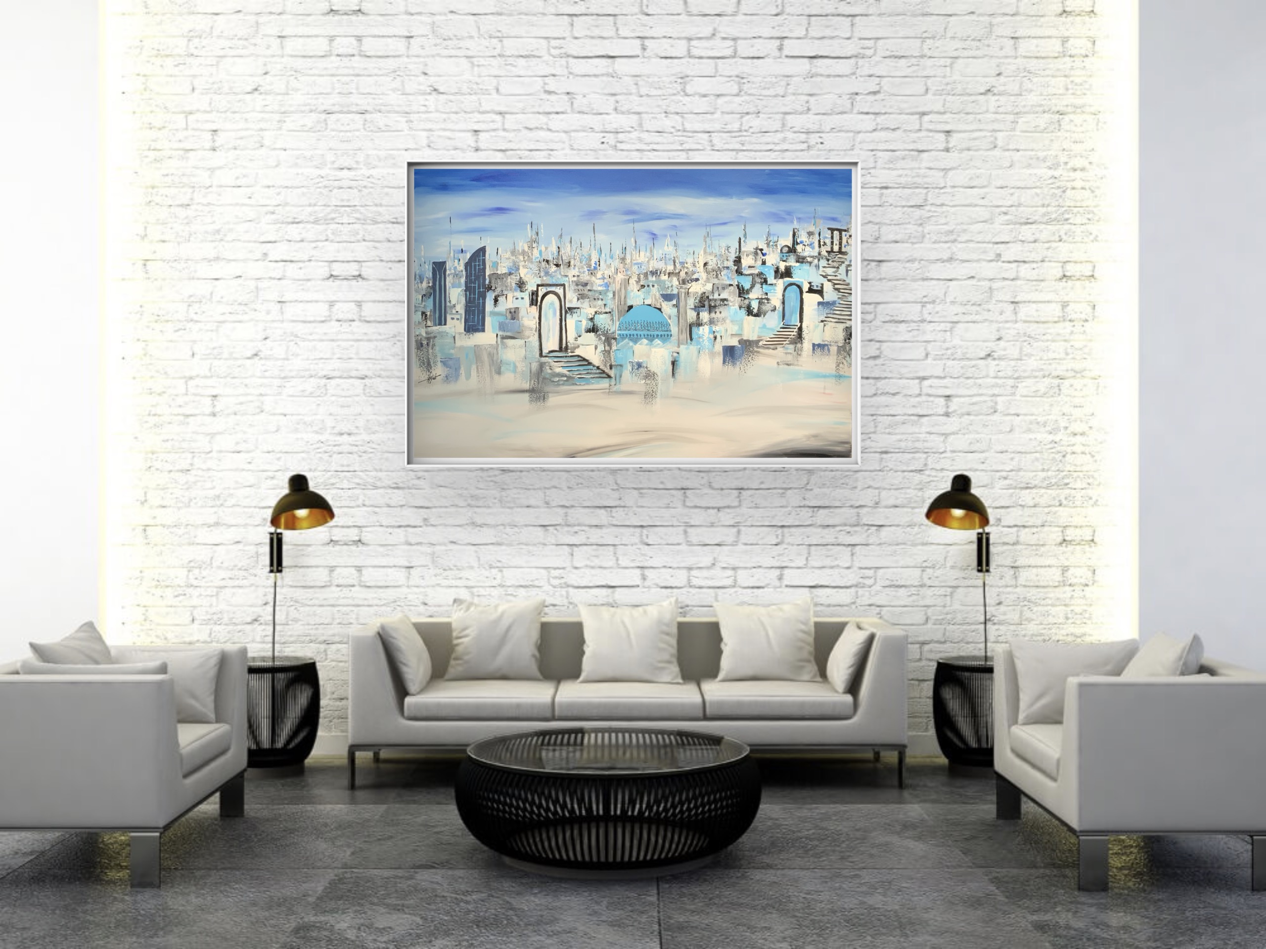 This artwork portrays an imaginary city bathed in layers of blue light and soft white tones, rising upward as if suspended between reality and a dream. Open gateways and ascending stairways lead to higher realms, while domes and subtle Eastern motifs add a spiritual and serene atmosphere. The dominant blue palette creates a calming energy and an expansive, reflective space.