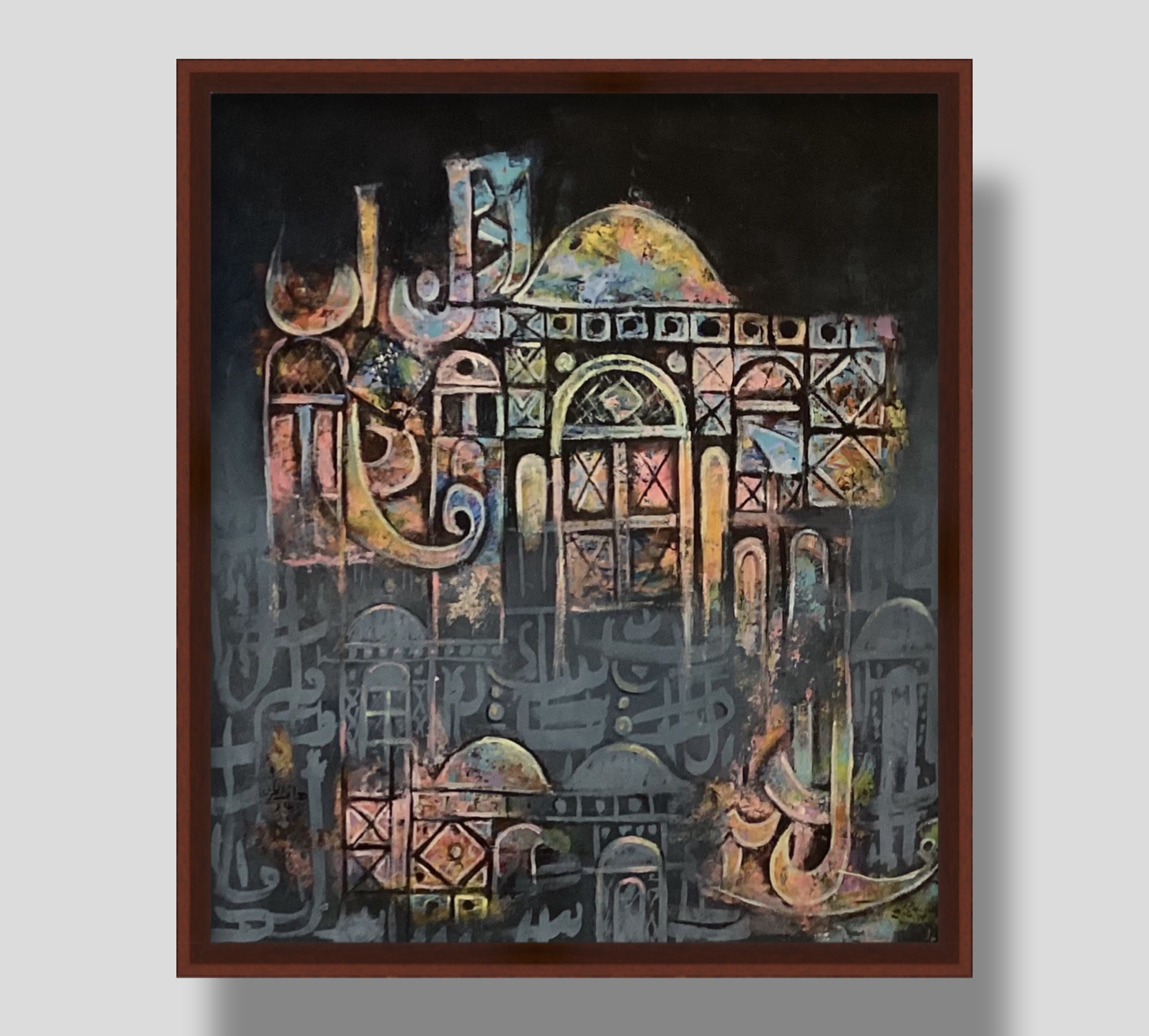 A mixed calligraphic–architectural artwork where heritage elements emerge from a deep, dark background. Domes, arches, and windows glow with warm colors, suggesting a spiritual pulse running through the city. The interplay of light and shadow creates a living memory of ancient Eastern cities, blending abstraction with symbolism in a harmonious visual rhythm.