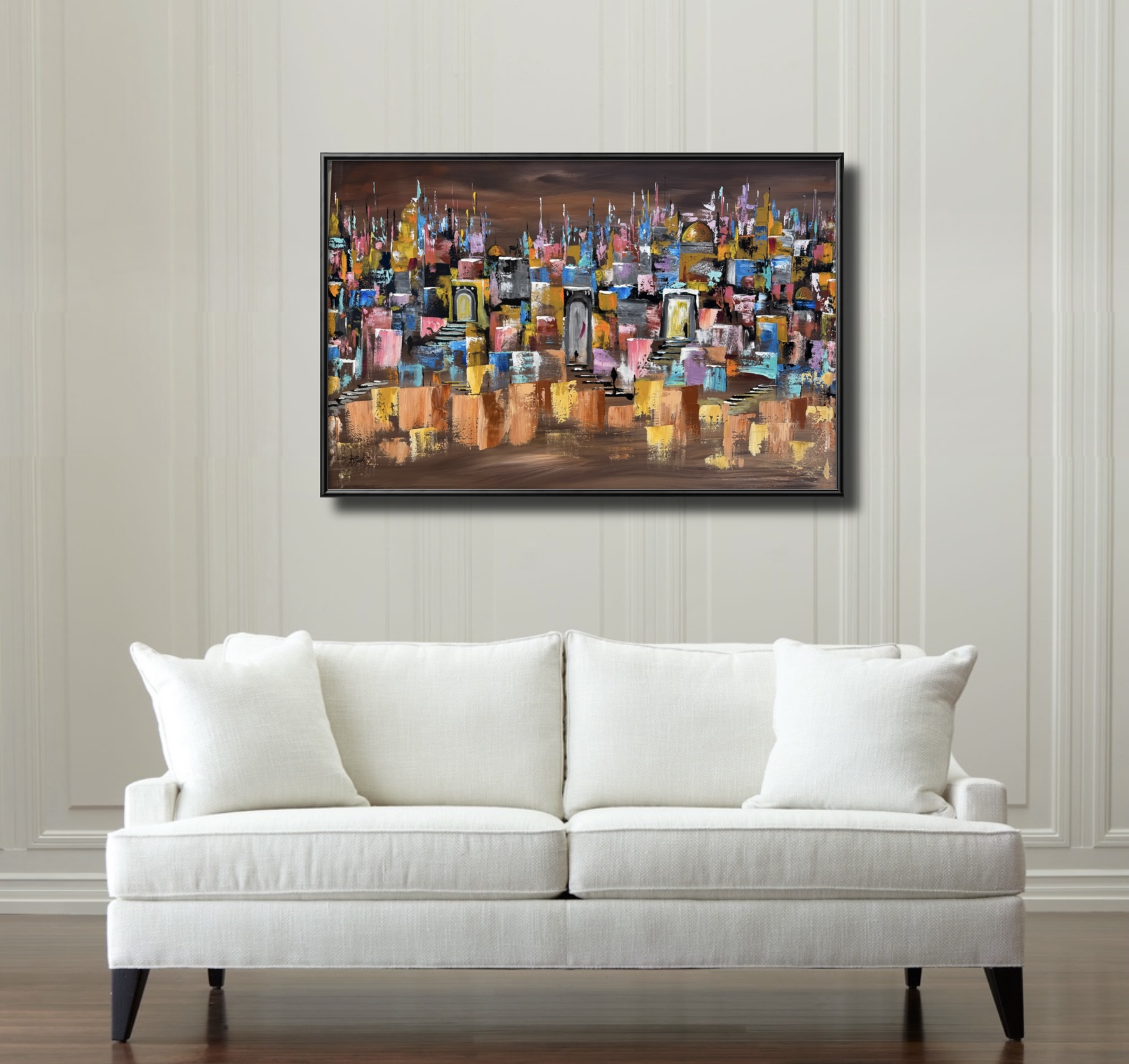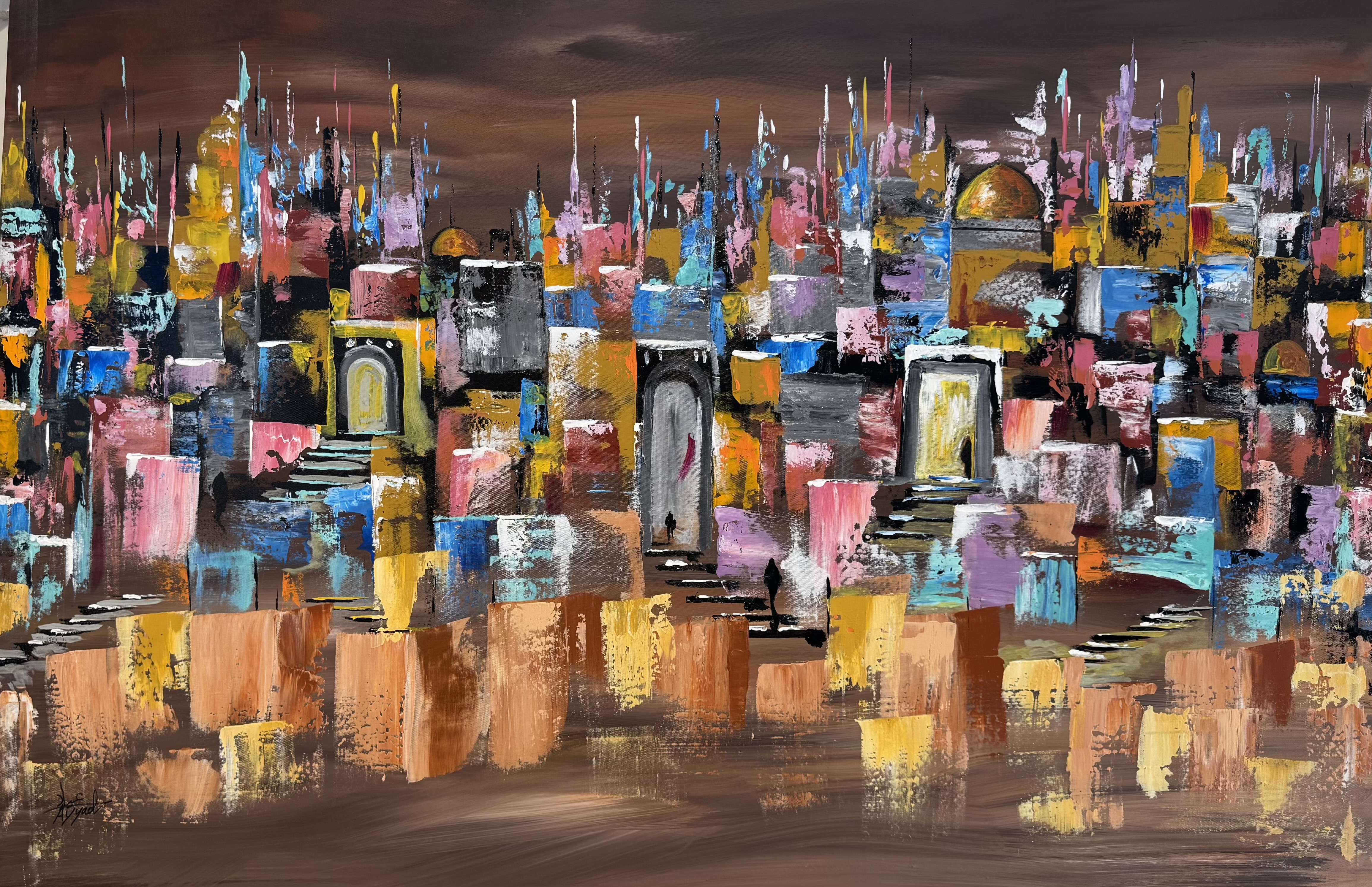 This painting transports the viewer to a dreamlike city bathed in the colors of dusk. Shades of orange, brown, and gold blend with lingering light over ancient rooftops. Majestic arches and tall doors open into a world of nostalgia and mystery, while vibrant hues infuse the scene with hidden warmth and life.