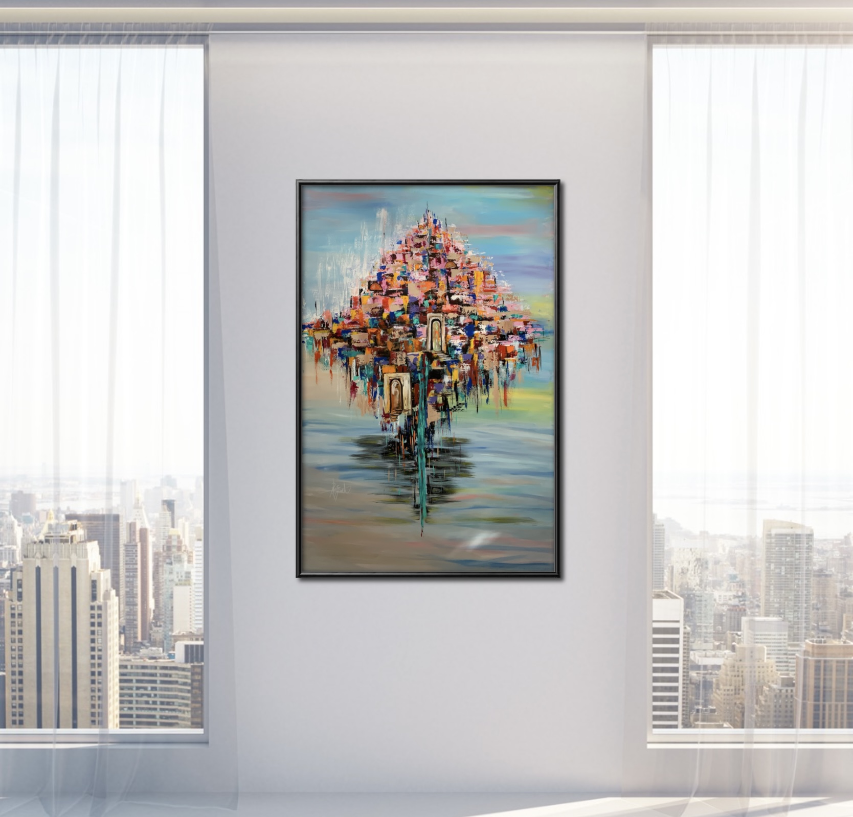 A captivating abstract painting blending the geometry of an ancient city with the spirit of a dream. Two gates open into a mysterious realm floating above a calm reflection, surrounded by vibrant hues of blue, pink, and orange. The artwork symbolizes a passage between reality and imagination, between past and present, glowing with light and symbolism.