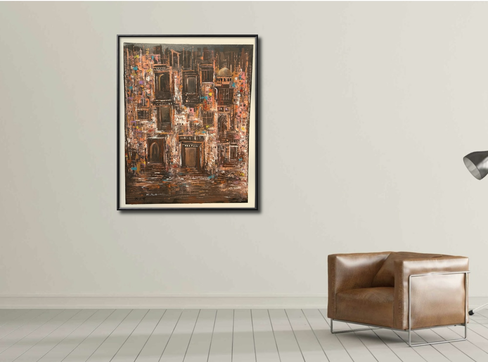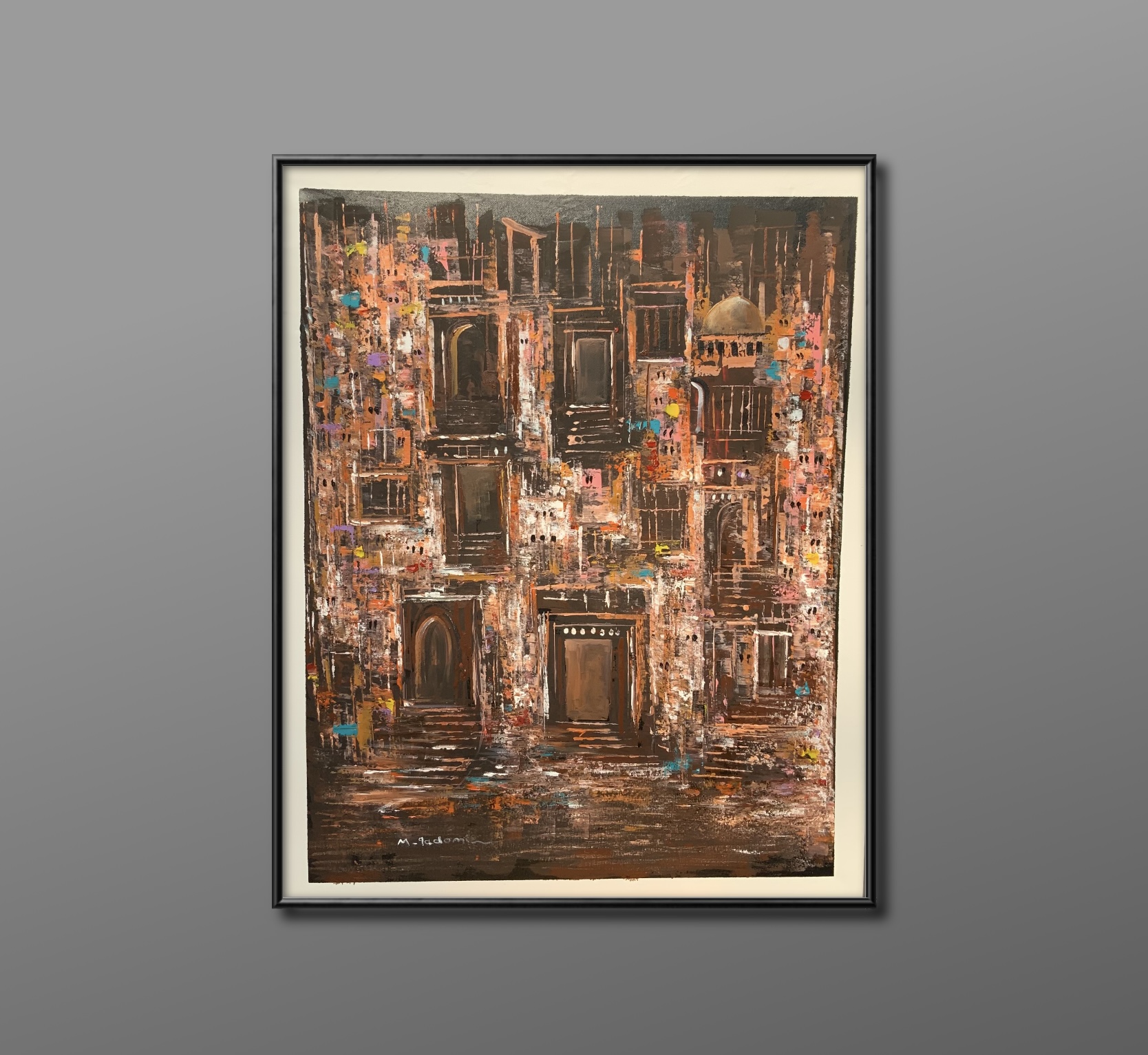 This painting portrays an abstract architectural vision of an old city façade, where doors and windows merge with rich earthy textures and scattered vibrant color accents. The work evokes depth and memory, as if documenting the stories of an ancient city whose secrets rest behind its weathered walls. Dynamic brushstrokes and subtle light contrasts breathe life into the composition, giving the city a silent yet vivid presence.