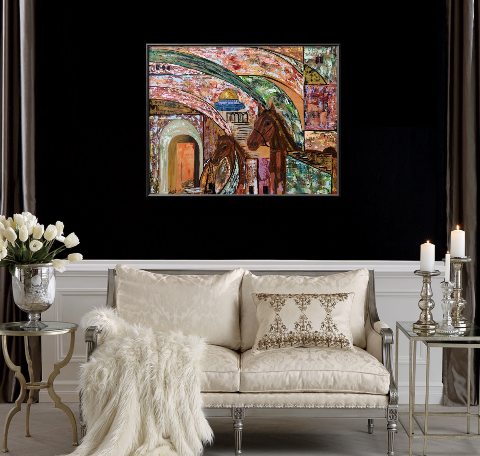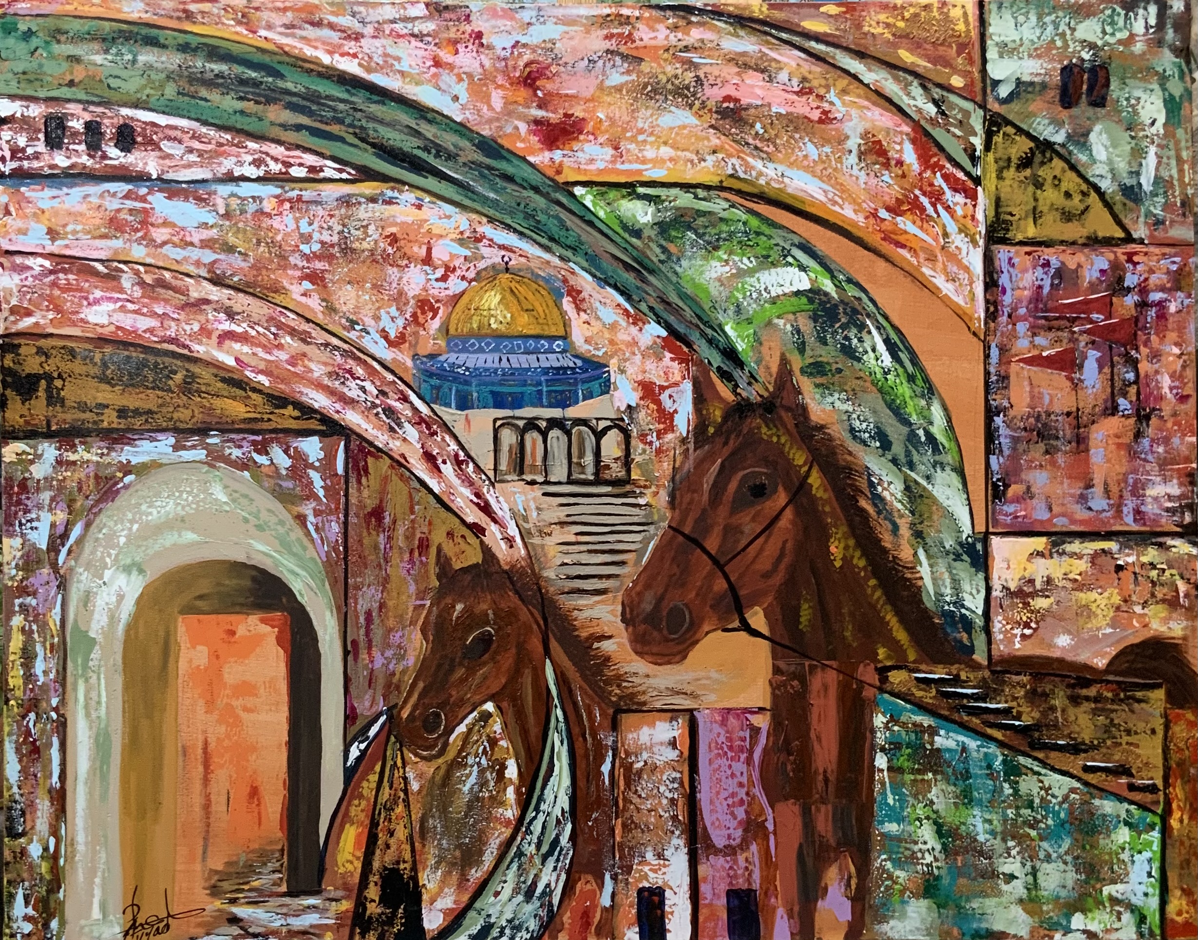 The painting captures a vibrant scene of Jerusalem, where majestic stone arches frame noble Arabian horses in the foreground, while the golden Dome of the Rock rises in the background. The rich interplay of reds, greens, and blues evokes both warmth and spirituality, uniting history, identity, and dignity in a single visual narrative