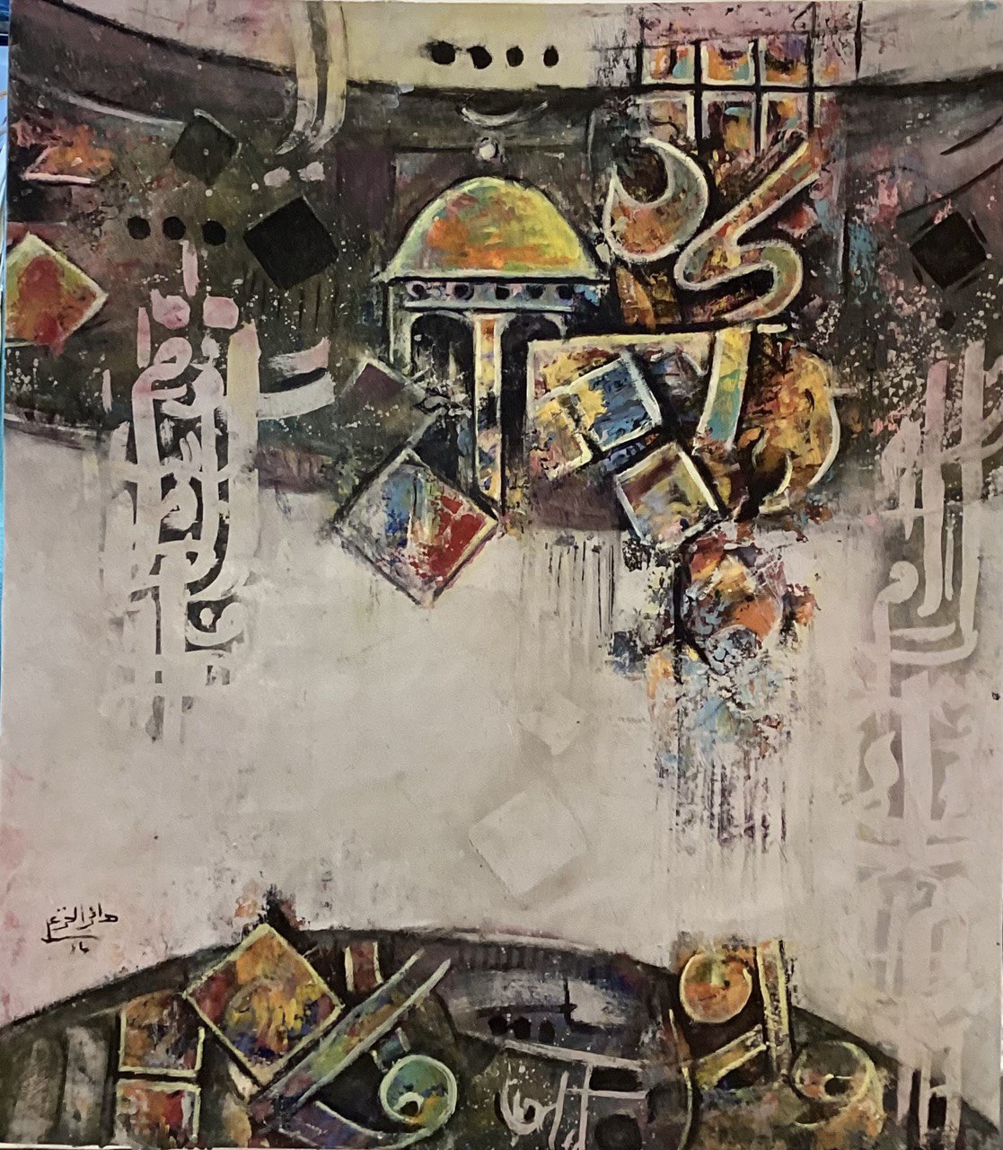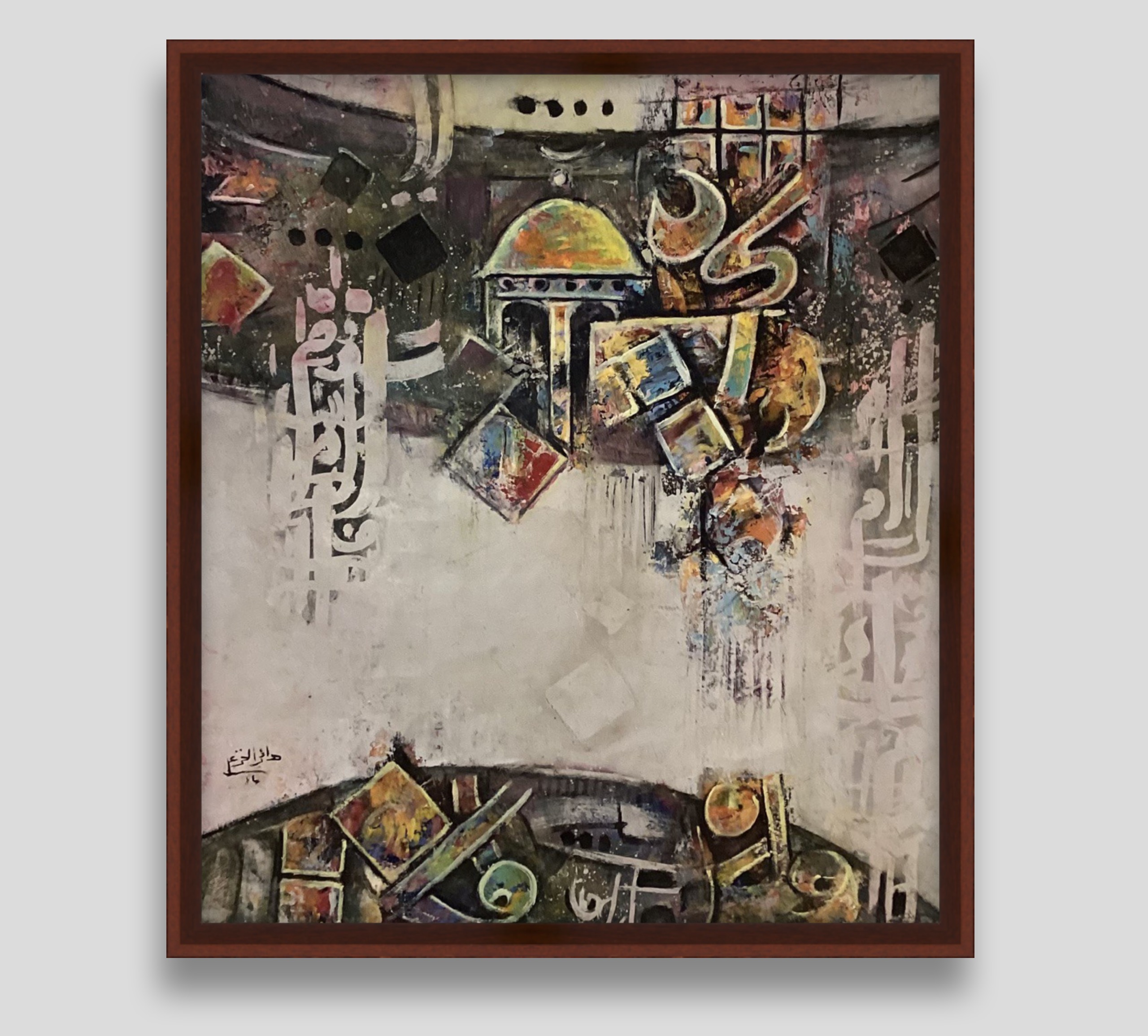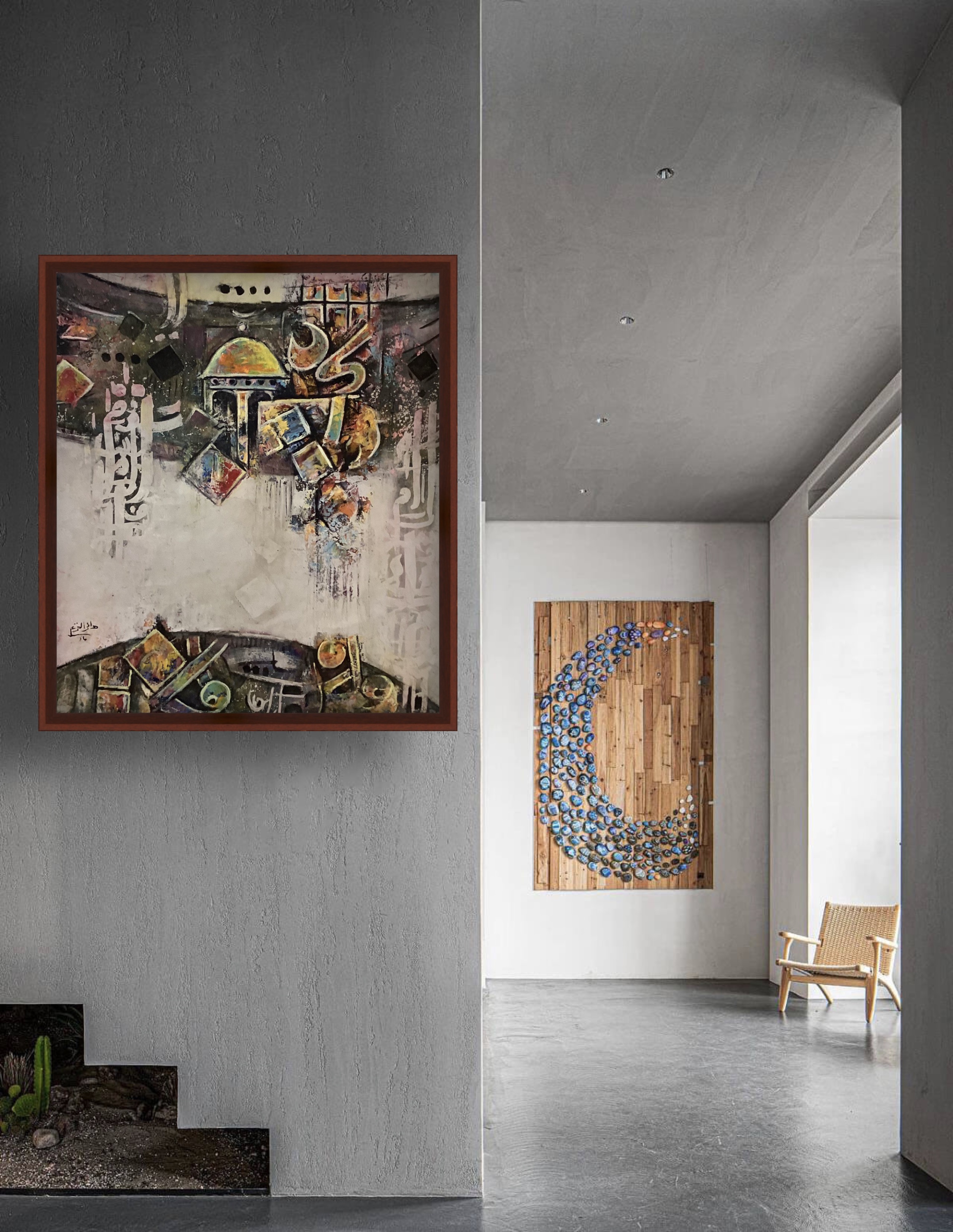 This artwork merges ancient historical symbols with Arabic calligraphic forms, creating a visual bridge between past and present. The old markings flow harmoniously with the letters, expressing cultural depth and continuity. The layered colors add movement and a sense of timelessness, inviting viewers to contemplate history through a contemporary artistic lens.