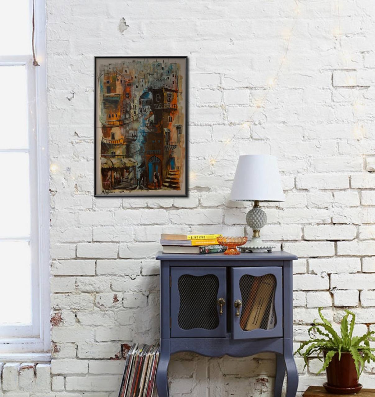 This painting captures a lively scene from the old neighborhoods of Amman, where stone houses stack upon one another in warm tones, reflecting the city’s timeless spirit. The narrow alleys filled with movement and the crisscrossing wires between windows and balconies add a familiar sense of urban life. Figures scattered through the streets and shops bring warmth and intimacy to the composition.