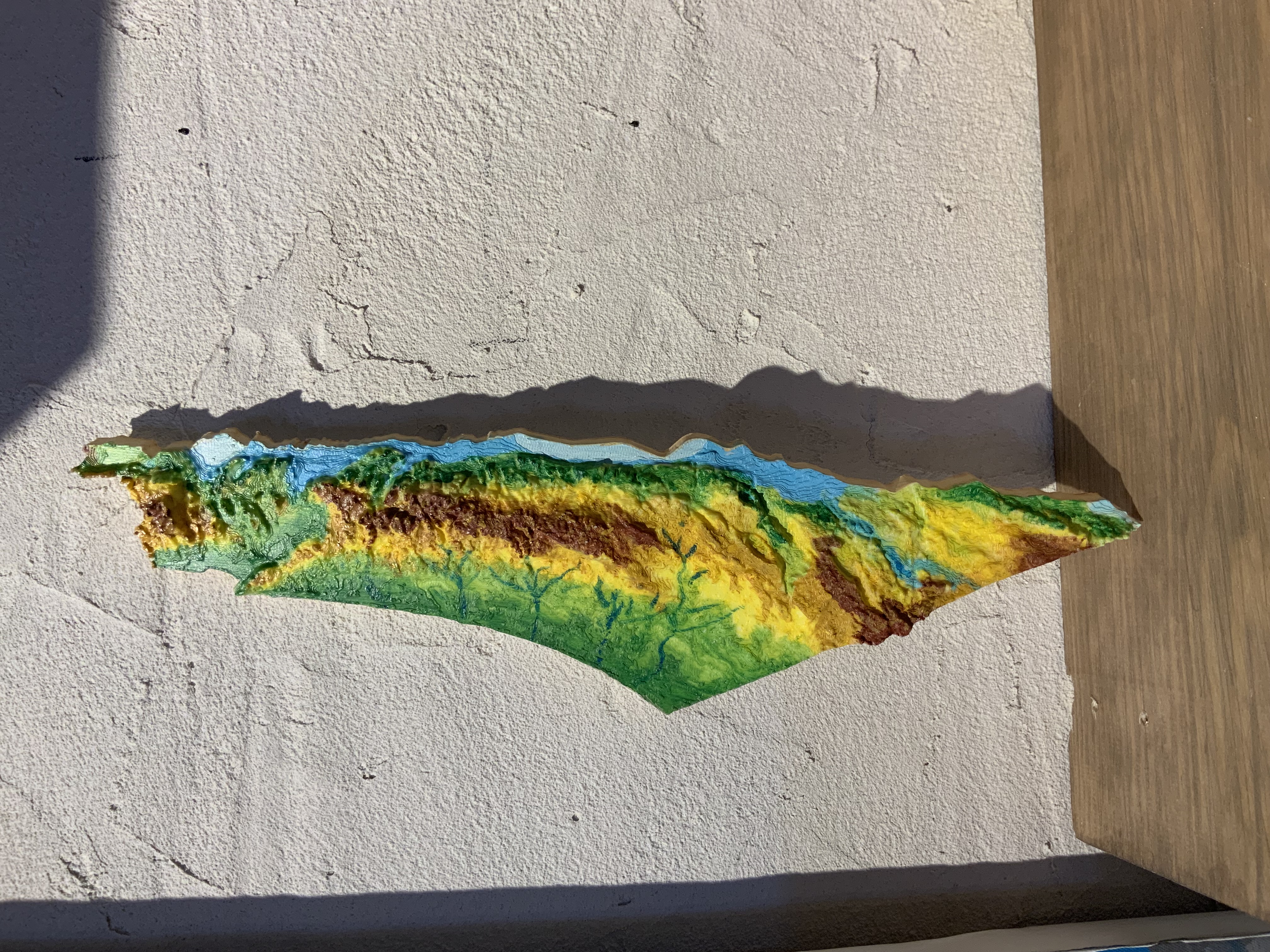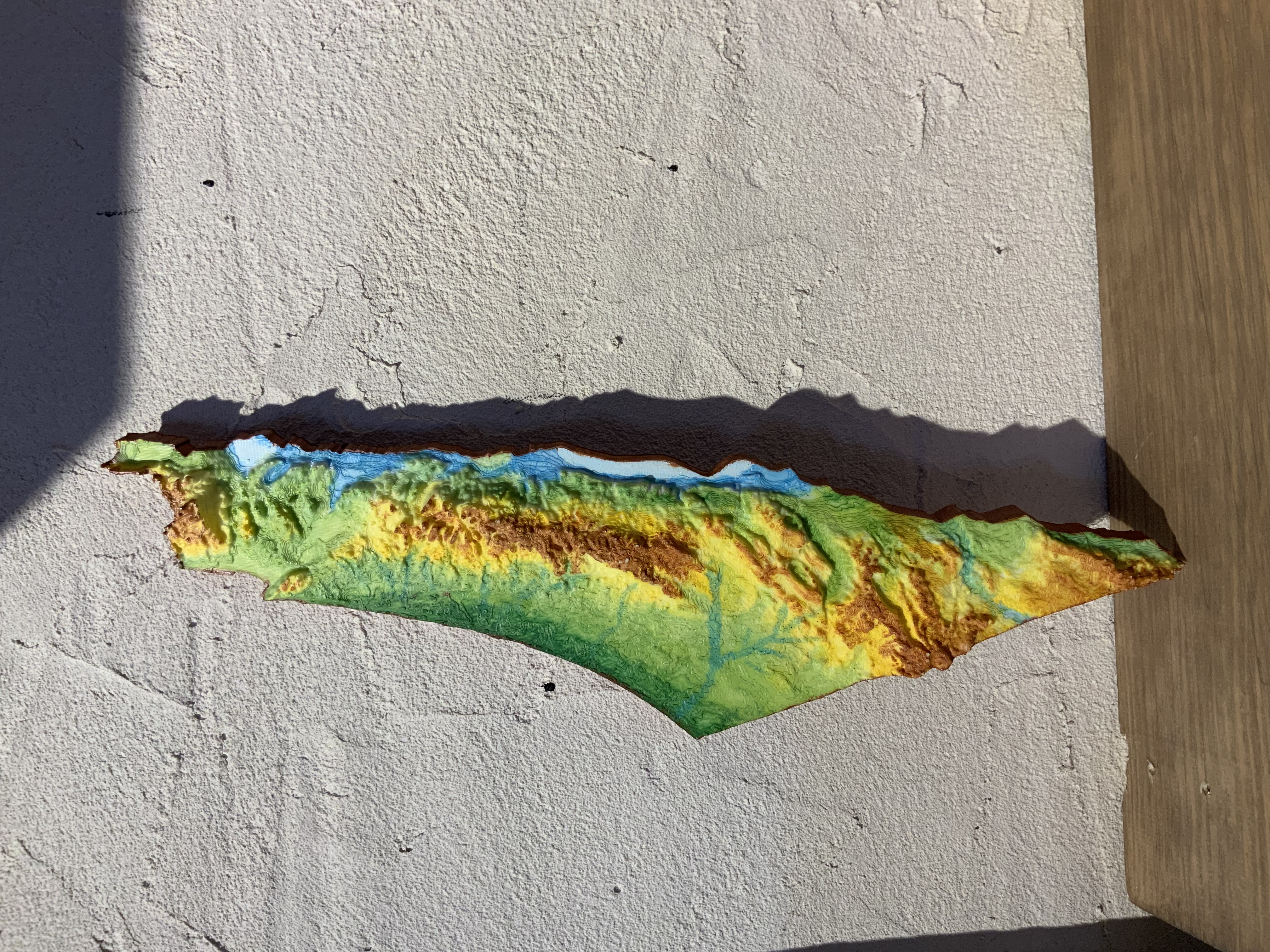 Detailed relief design highlighting Palestine’s natural landscapes with vivid colors.