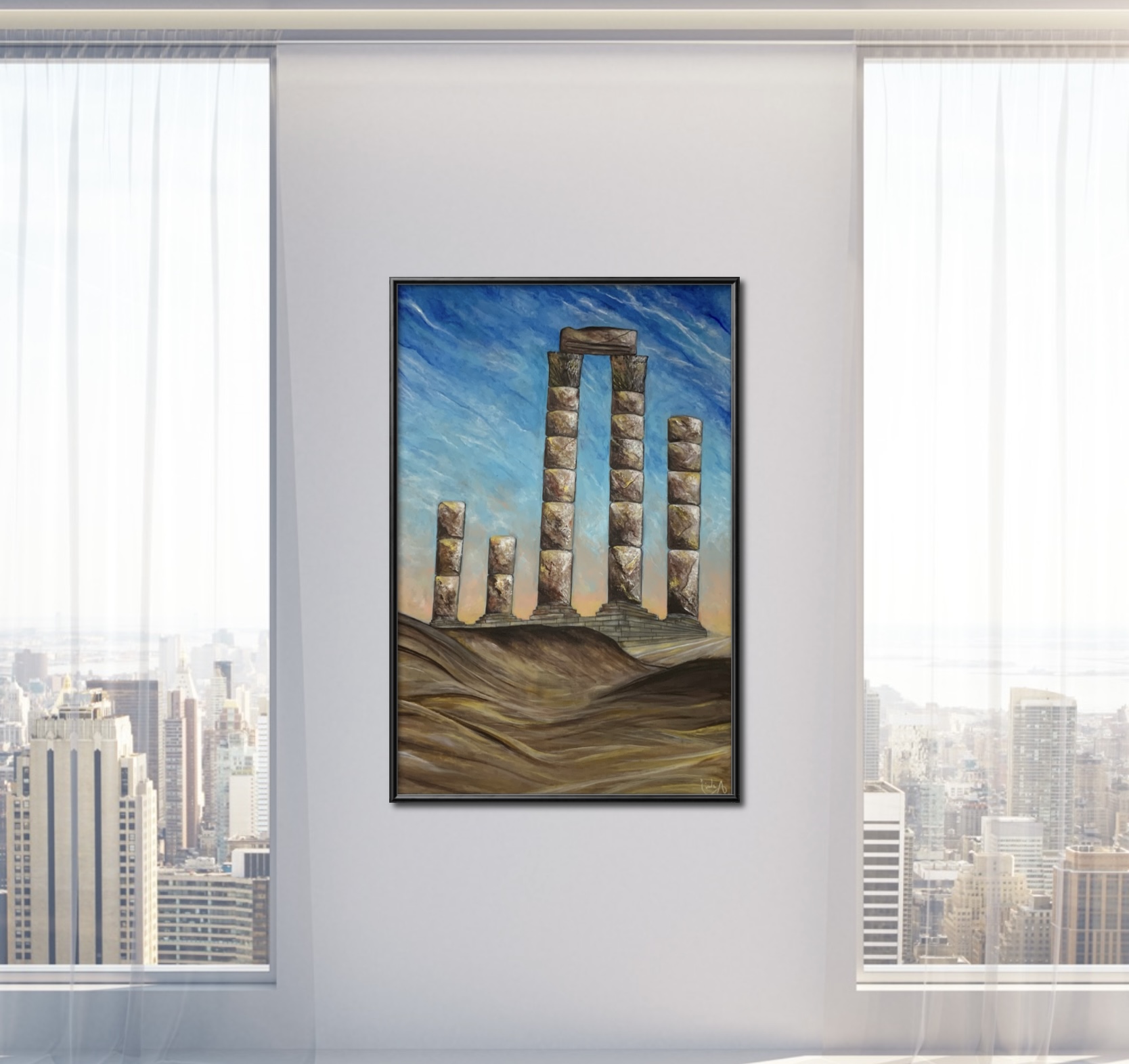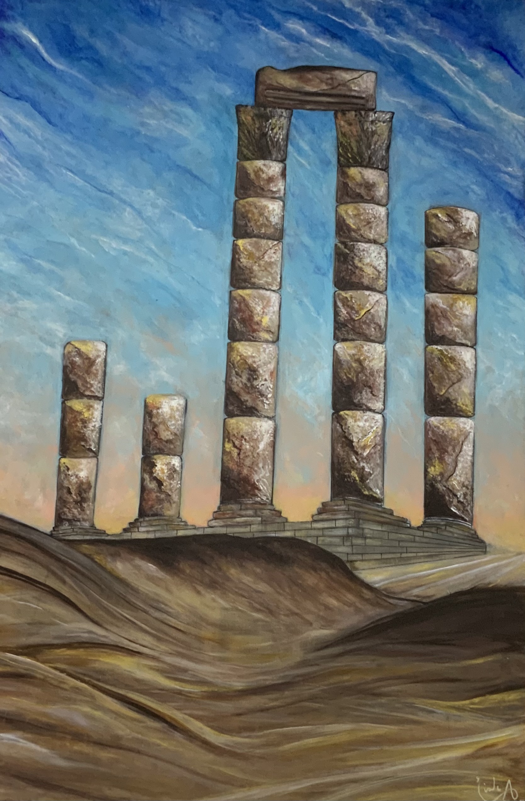 An artwork depicting the iconic pillars of the Temple of Hercules at the Amman Citadel, standing tall amidst flowing, wave-like earth forms. The blended hues of sunset warmth and cool skies create a dialogue between past and present, where ancient ruins remain as timeless witnesses of history and civilization.