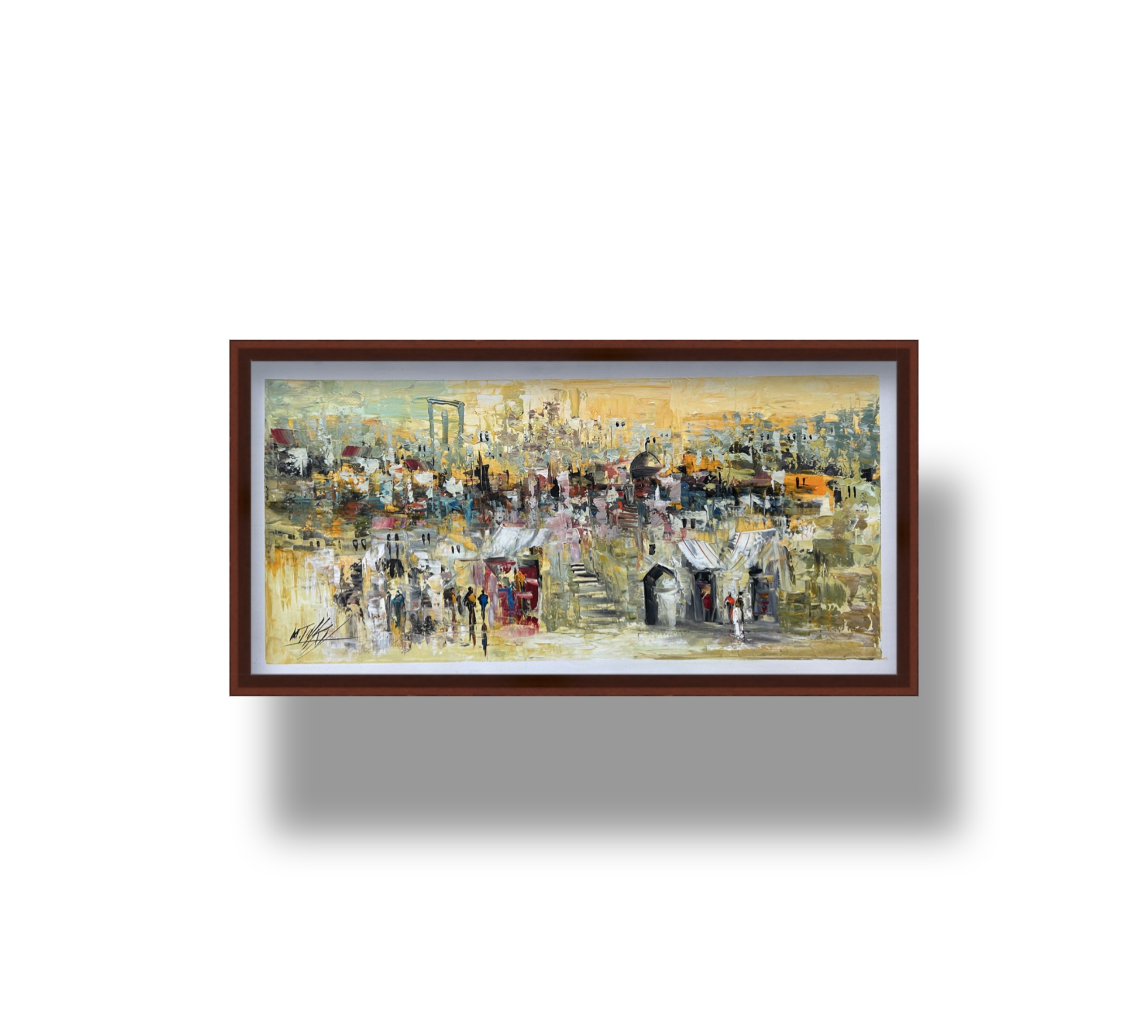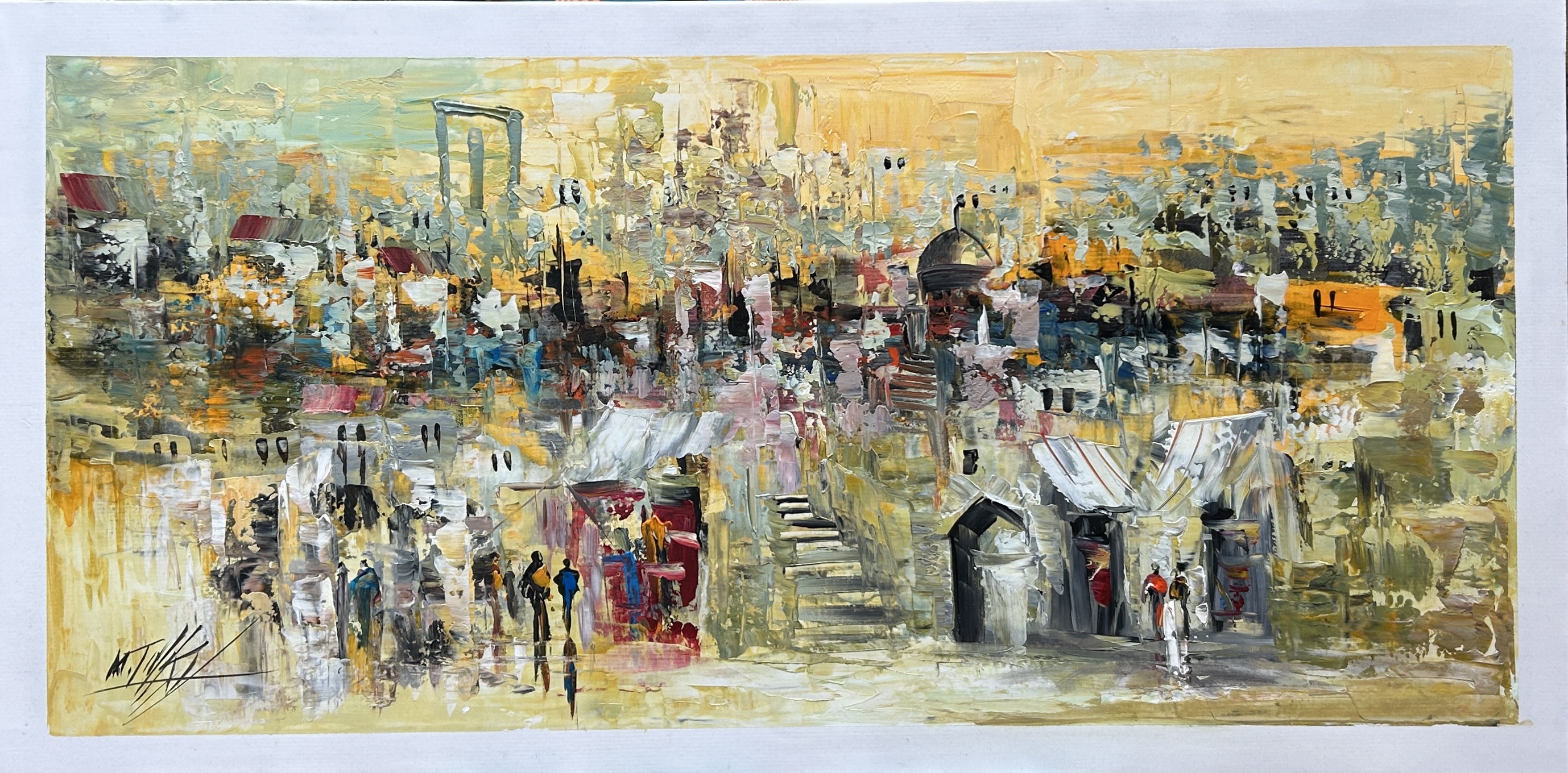 This painting presents an abstract urban scene filled with the spirit of place, where historic architecture merges with human movement in a richly layered and textured composition. Warm and muted tones evoke a sense of history and everyday life, while stairs and pathways guide the eye through the city’s alleys and memories. The artwork is a visual reflection on time, belonging, and the stories held within the walls.