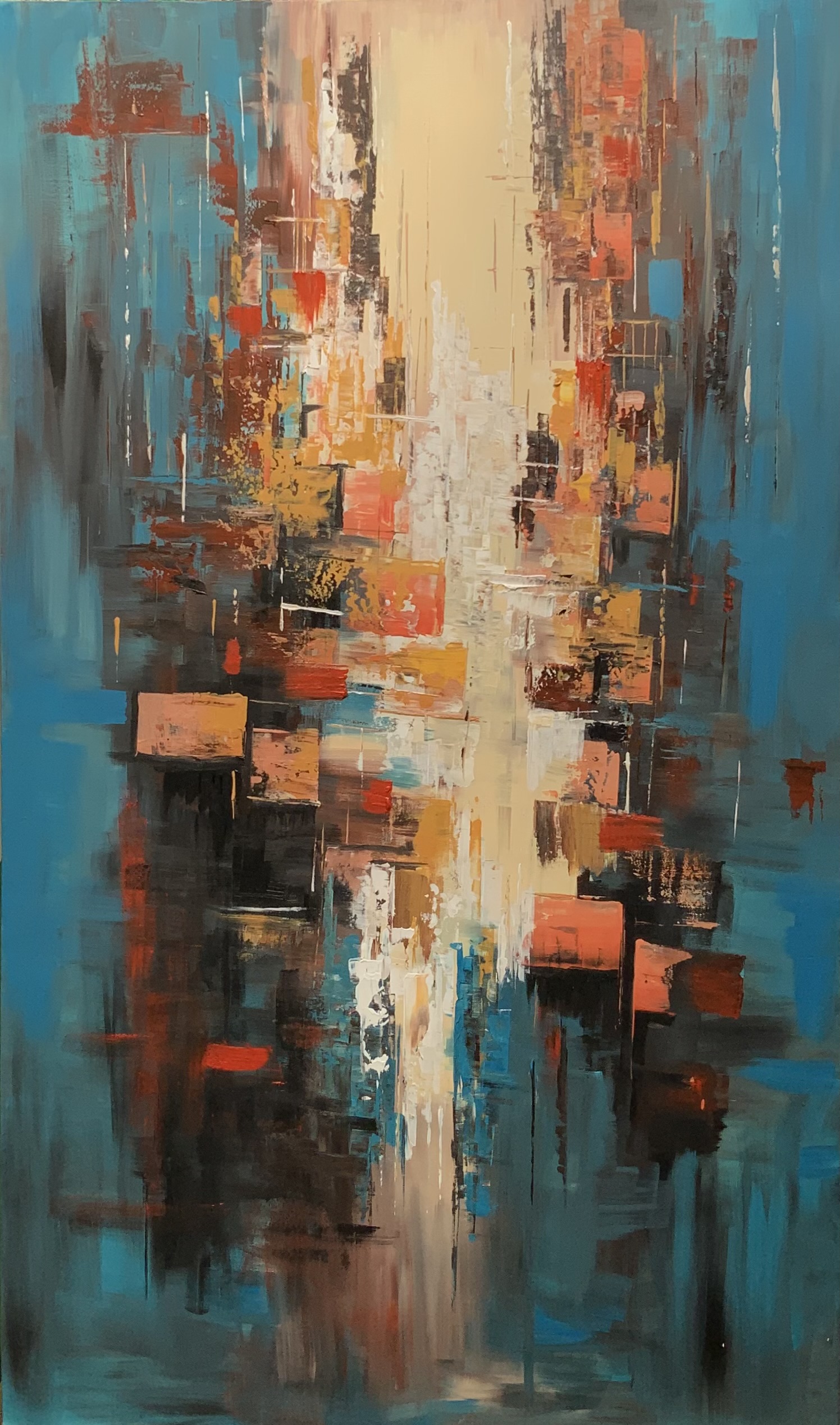An abstract painting full of life, where warm and cool tones intertwine to create a dynamic urban impression. A luminous central path evokes streets or reflections of light, while scattered color blocks resemble buildings or fleeting moments. The piece balances chaos and harmony, inviting viewers to interpret its details through their own emotions.