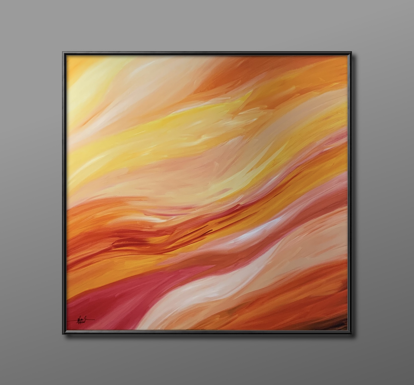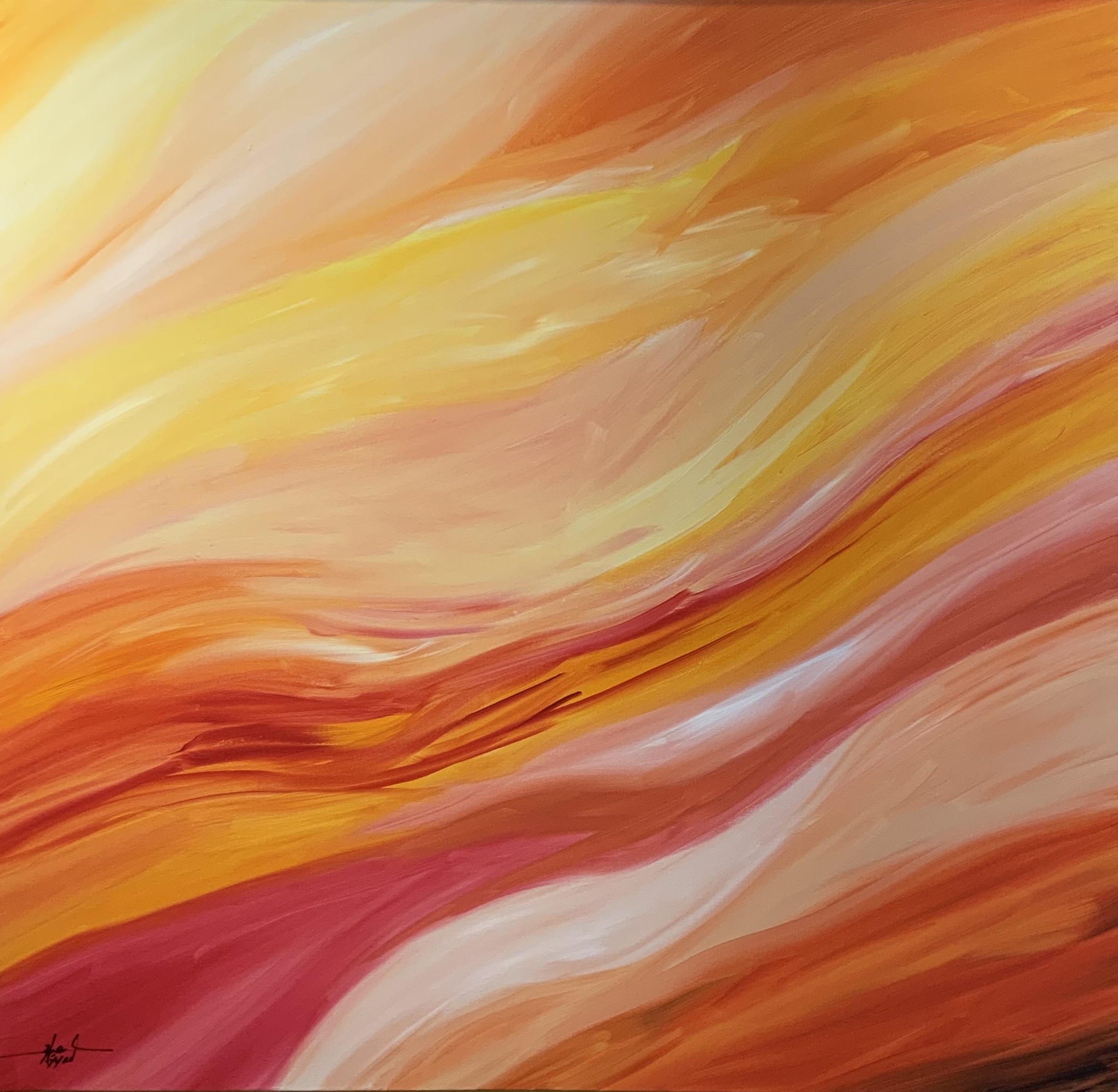 An abstract painting where sweeping brushstrokes flow like waves of light, blending yellow, orange, and rose tones to evoke the warm glow of twilight. The artwork conveys a serene sense of movement and visual warmth, inviting the viewer to contemplate the harmonious transitions of color.