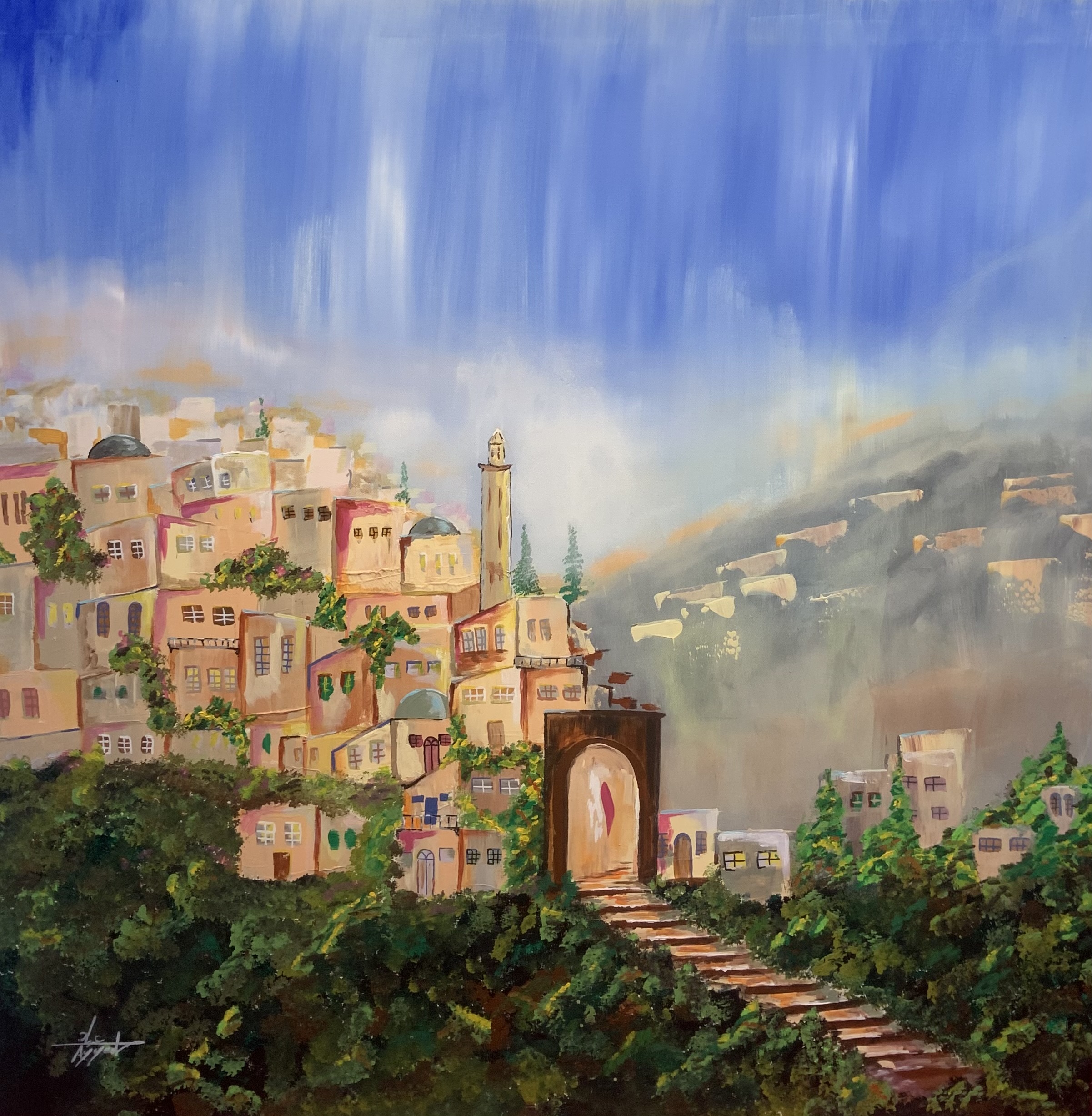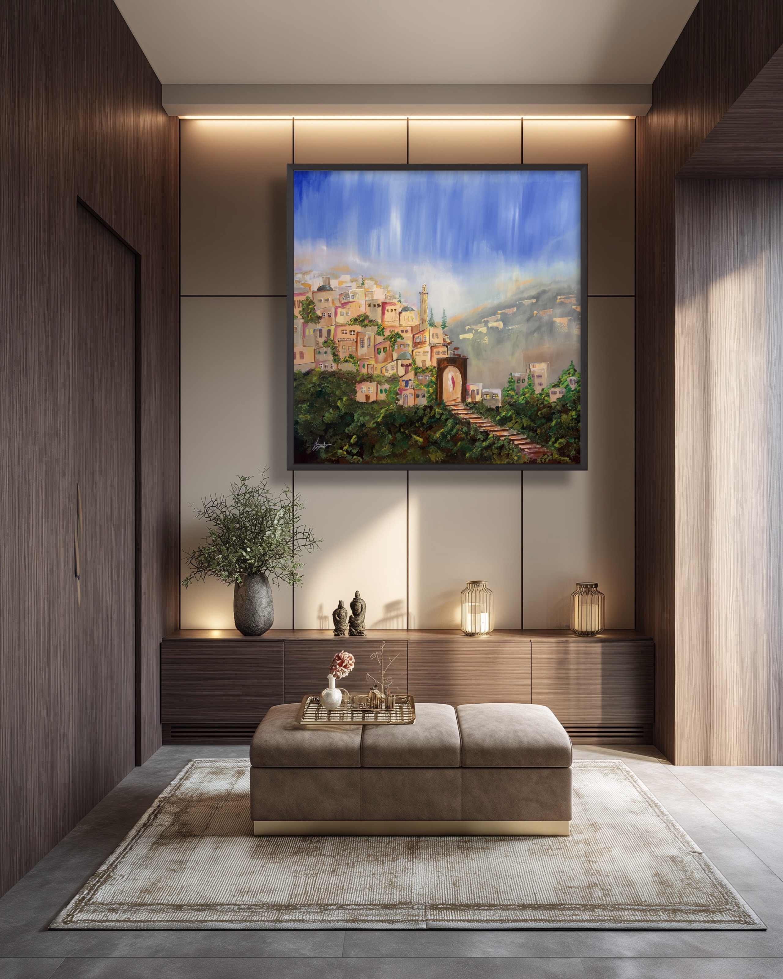This painting depicts an abandoned city resting quietly within a mountainous landscape, where silent architecture merges with the raw majesty of nature. The absence of people evokes a profound sense of solitude and reflection, as if the place holds untold memories—balancing stillness with quiet awe.