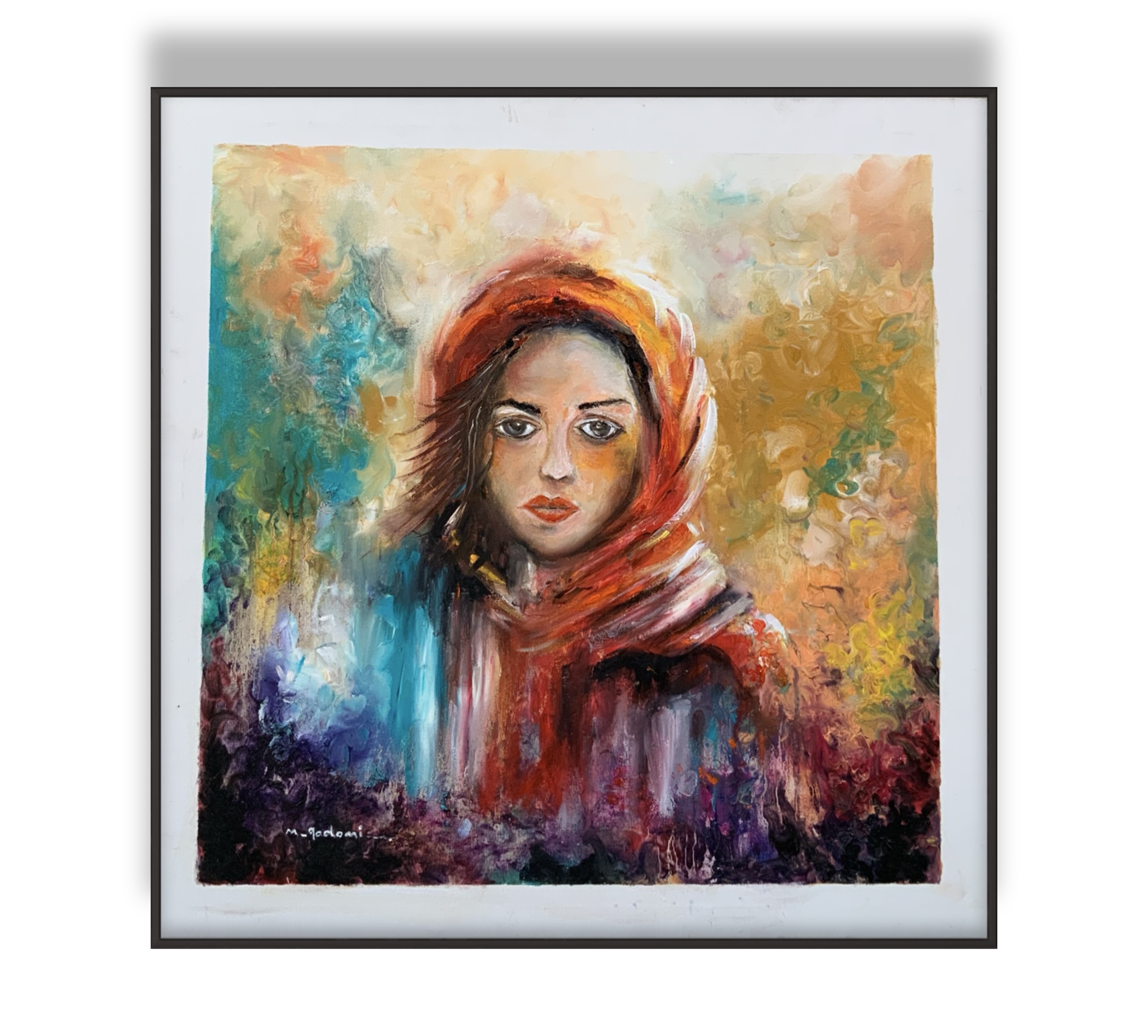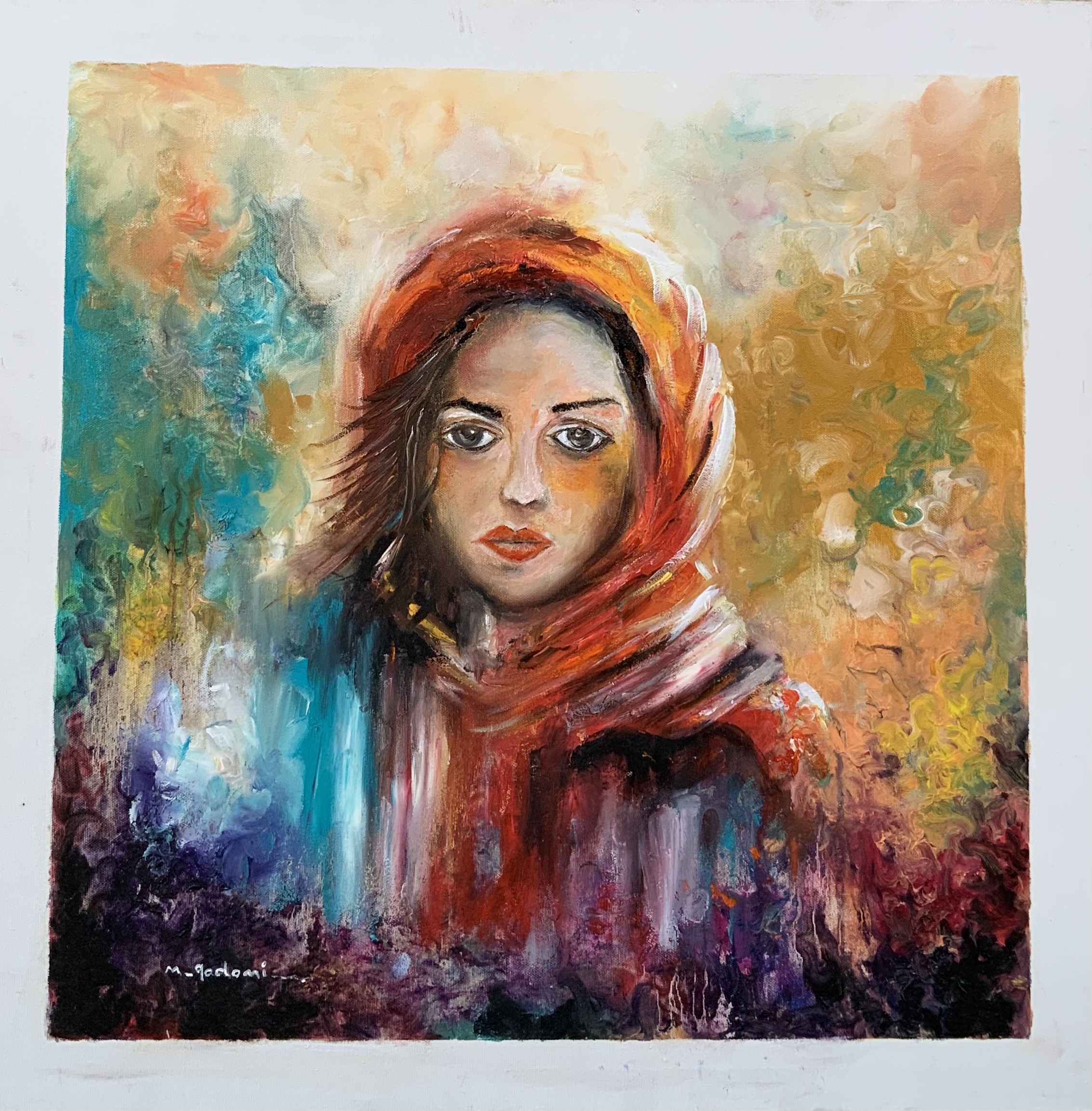 This painting presents a deeply expressive portrait of a woman wrapped in a warm headscarf, where her facial features convey contemplation, strength, and quiet presence. The abstract background, rich with earthy, turquoise, and violet tones, reflects an intricate inner world. Free, flowing brushstrokes give the face an honest and powerful presence, as if her gaze carries unspoken stories.