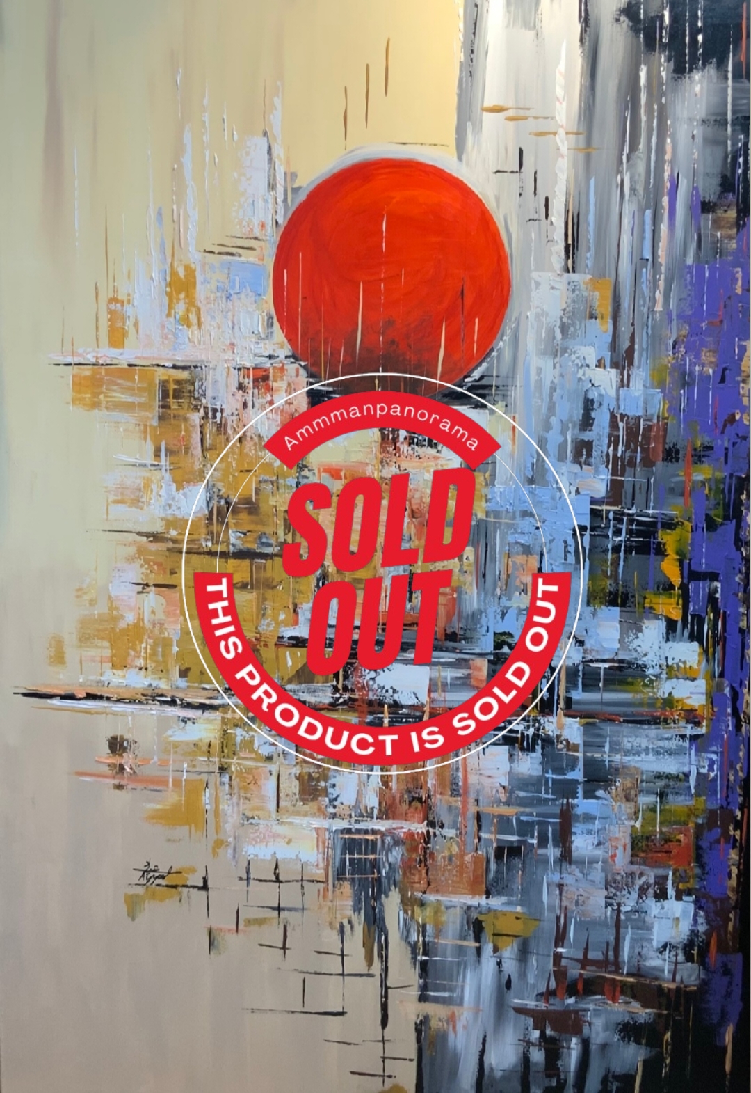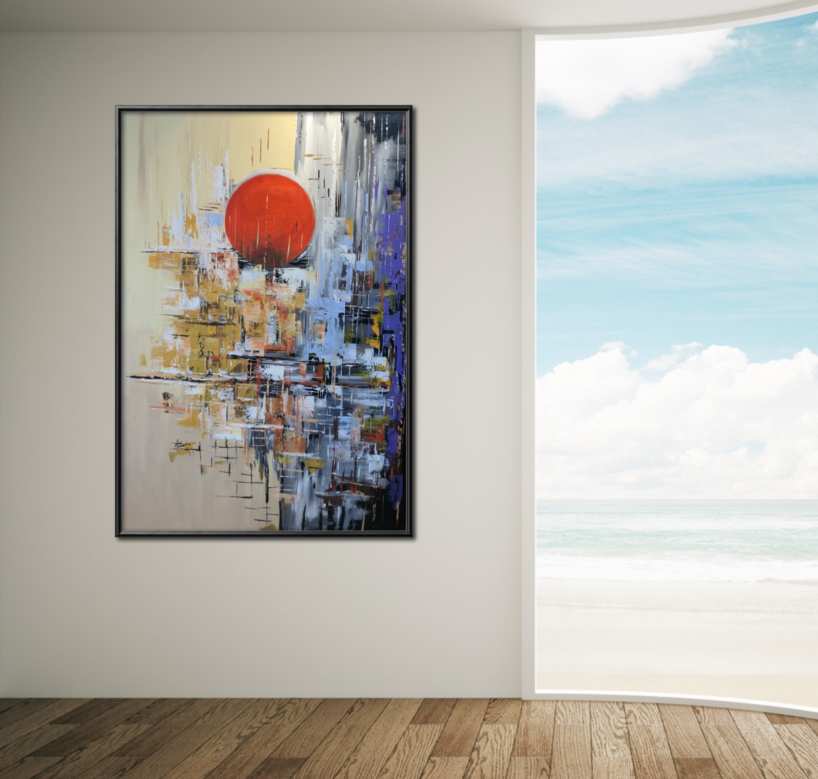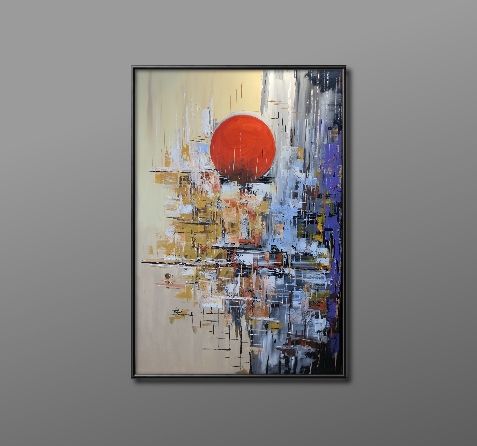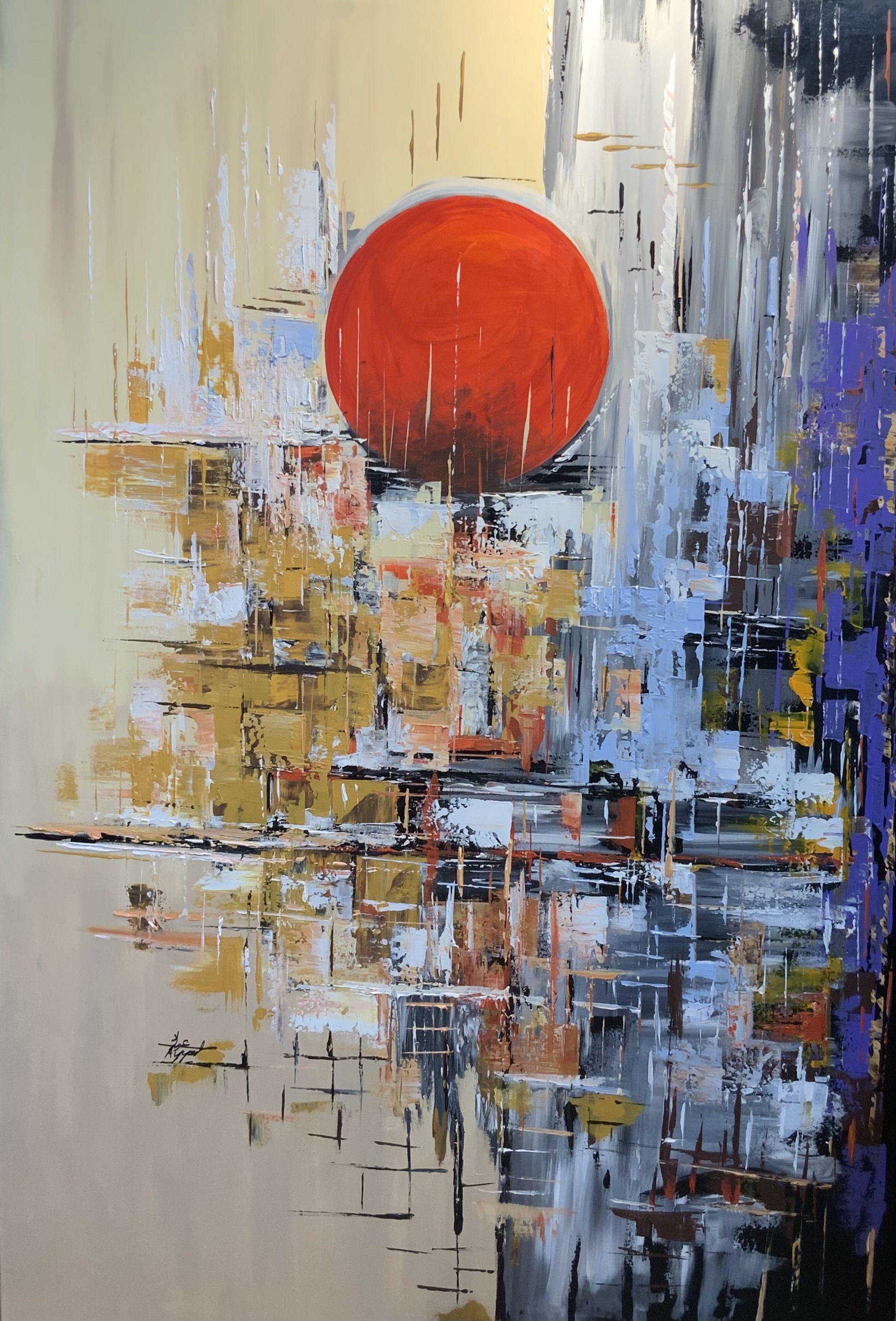 A vivid abstract painting portraying the clash of light and shadow within a fragmented urban landscape. The red sun emerges as a symbol of hope or warning, suspended above crumbling structures, while golden, grey, and black tones intertwine to create a compelling visual balance.
