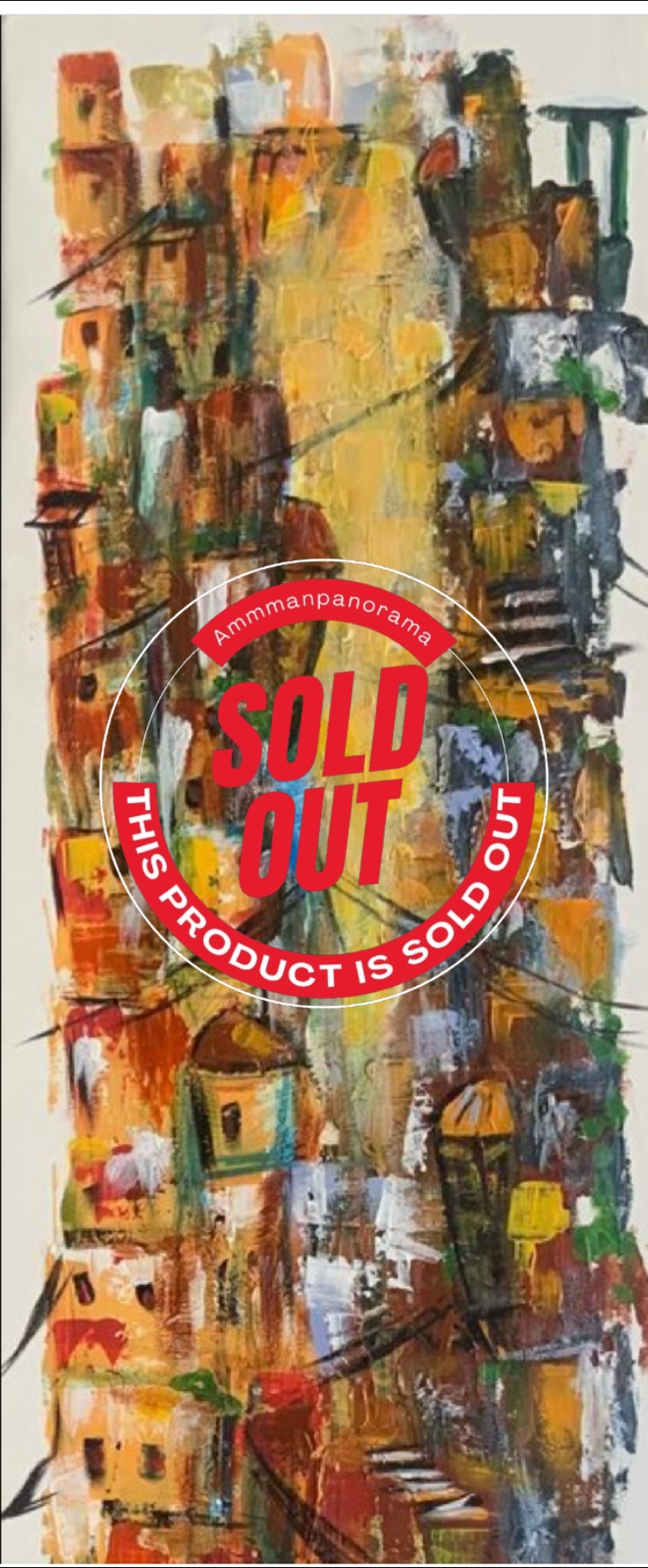 A painting depicting the sunset in Amman captures the magical moment when the sun meets the horizon, bathing the city in warm, golden hues. The houses and buildings, with their distinctive architectural features, appear under the fading sunlight, creating a stunning scene of shadows and light. Warm colors like orange, red, and yellow highlight the city's beauty at that serene moment, with a sky that transitions from light blue to deep purple. The painting reflects the tranquility and peace that envelops Amman at sunset.